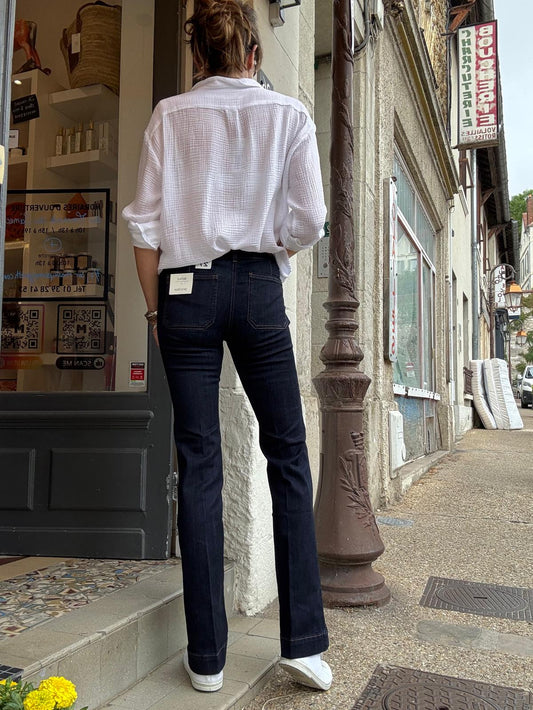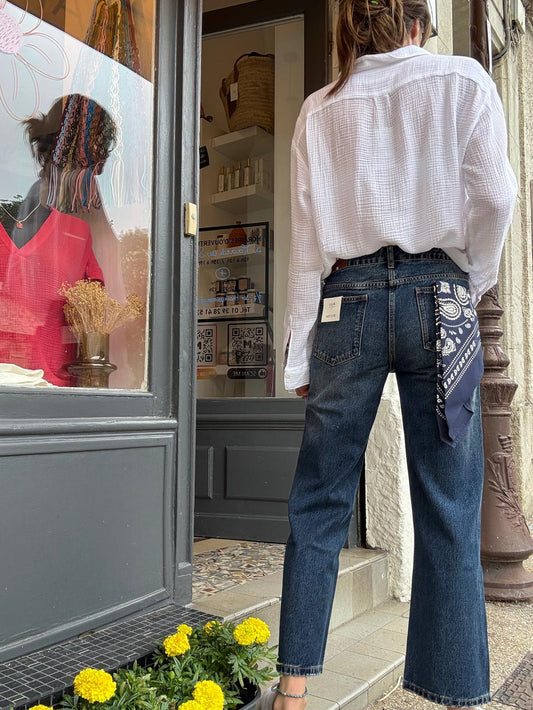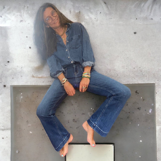 Le nom "Blue" évoque l'océan, l'indigo et le denim, symbolisant une matière qui se patine avec le temps. Jane Blue Paris s'efforce de retravailler cette toile emblématique pour créer des jeans confortables et durables, adaptés à une vie quotidienne active.