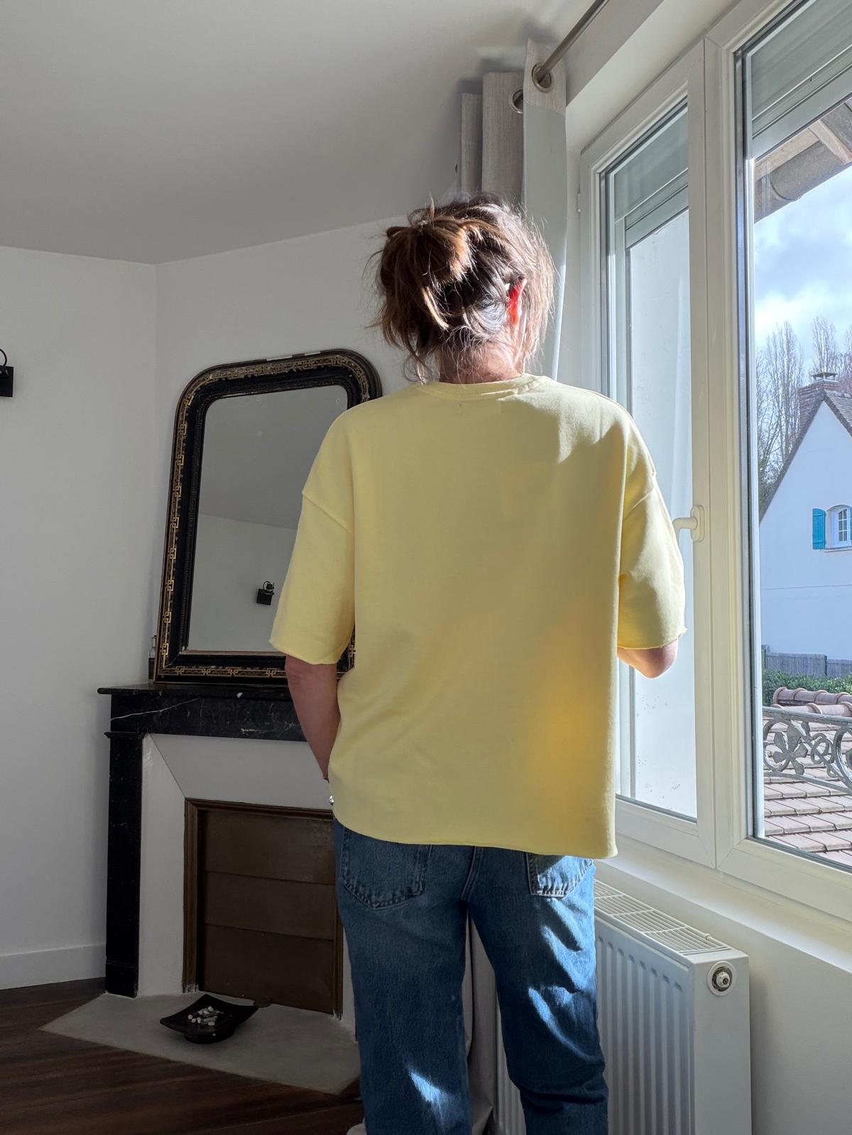 T-shirt sweat Sybille à manches courtes, coupe laser aux manches et en bas. Coupe un peu loose, hyper agréable à porter, pour un vrai coup de soleil dans votre dressing !