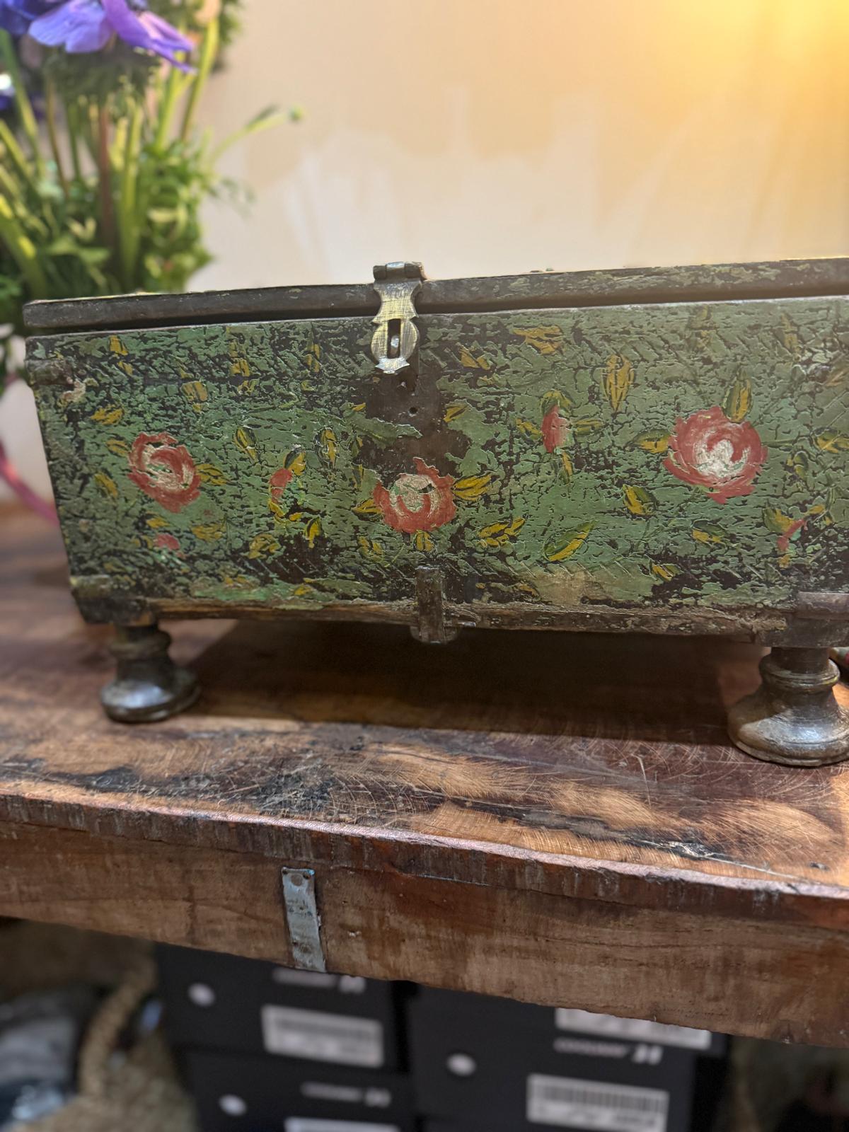 Poignée et fermeture en métal. ouverture par le dessus. Monté sur pieds sculptés.