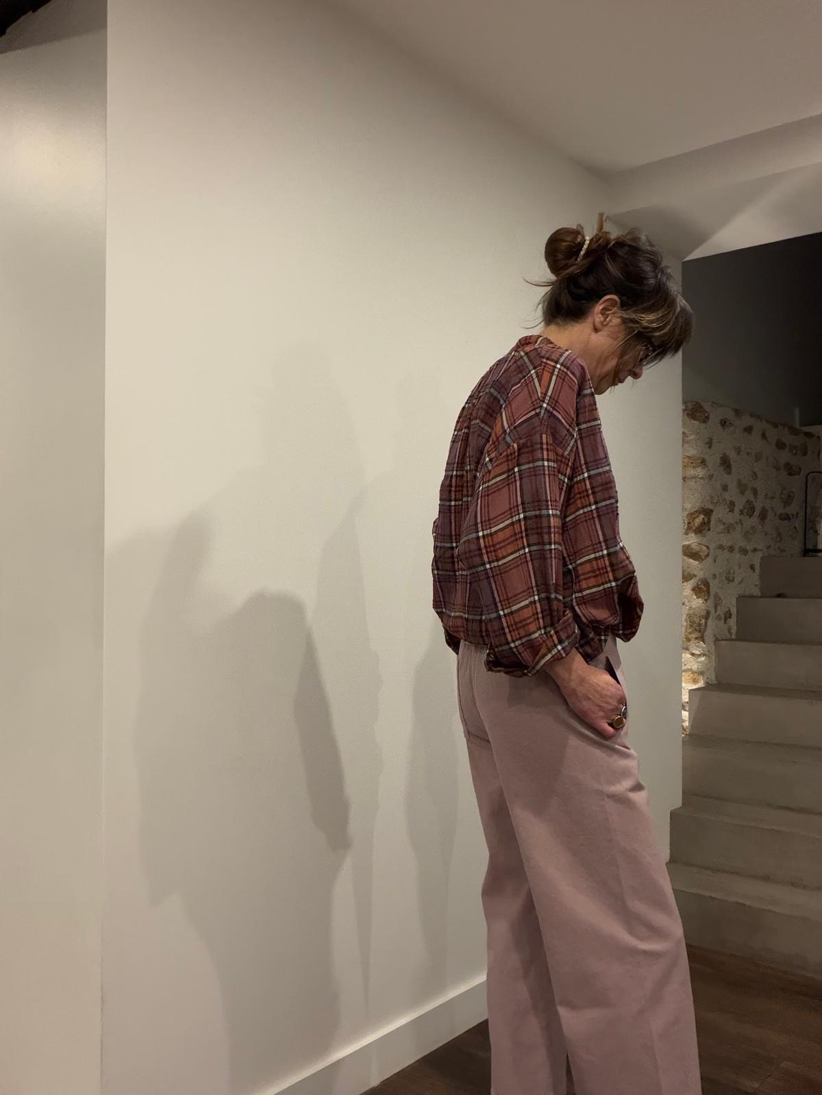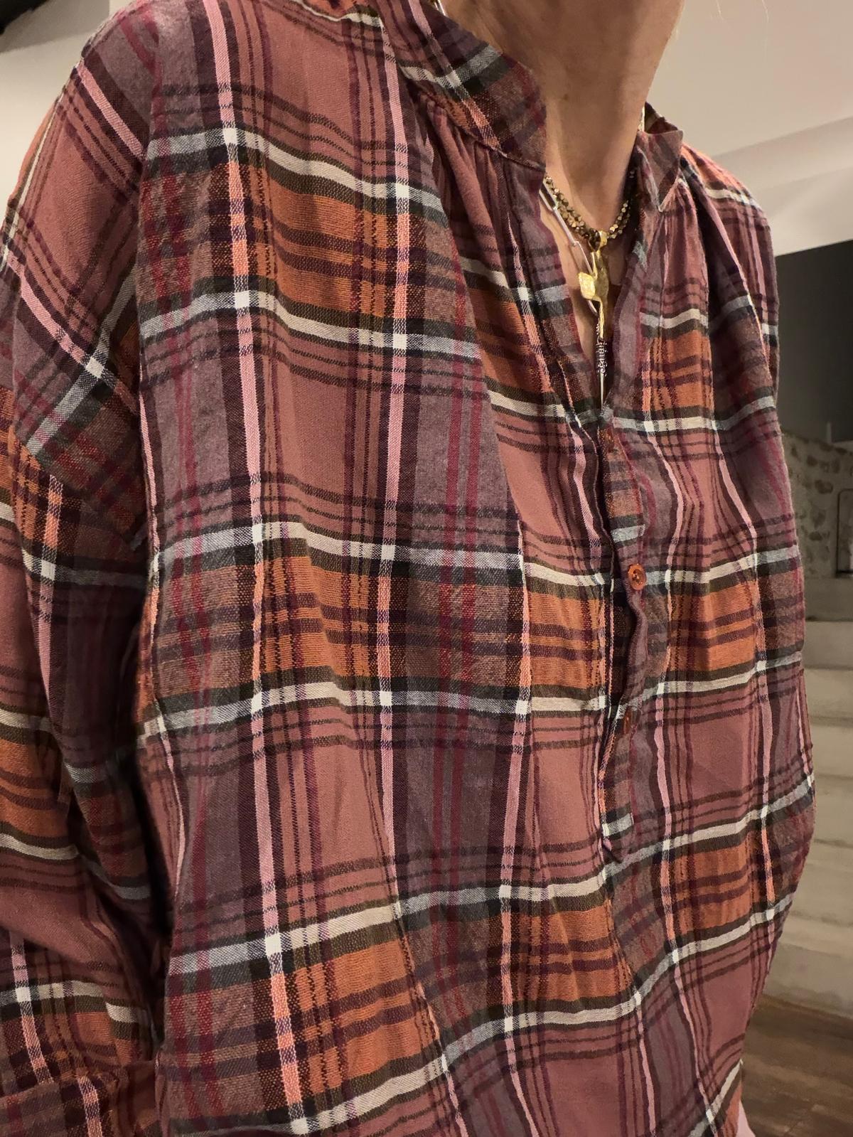 Blouse oversize à col mao avec un très beau motif à carreaux dans les tons prune/rose, parfait pour être dans les tendances du printemps/été 2026!