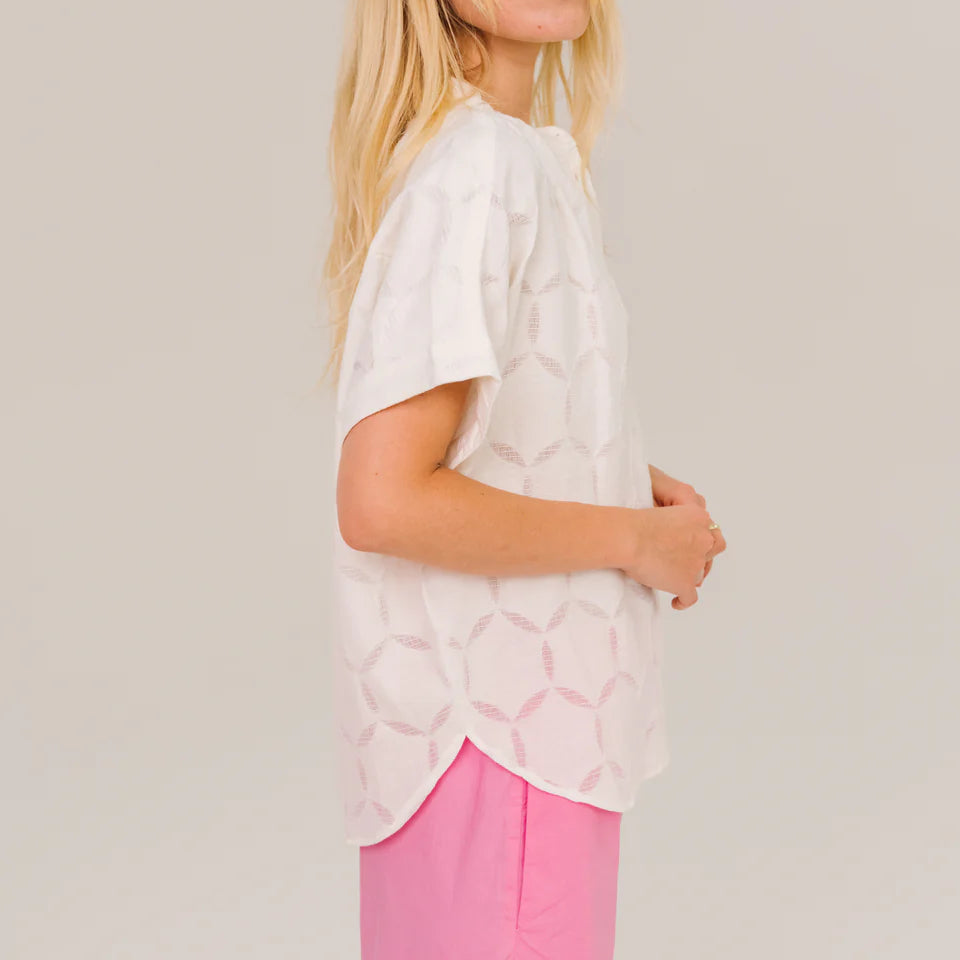 Blouse à manches courtes à motifs ajourés ton sur ton. Sa coupe ample et fluide est sublimée par des fronces aux épaules et dans le dos, pour une silhouette légère et structurée. Col mao fin, boutonnage apparent et revers aux manches pour une touche élégante et contemporaine.
