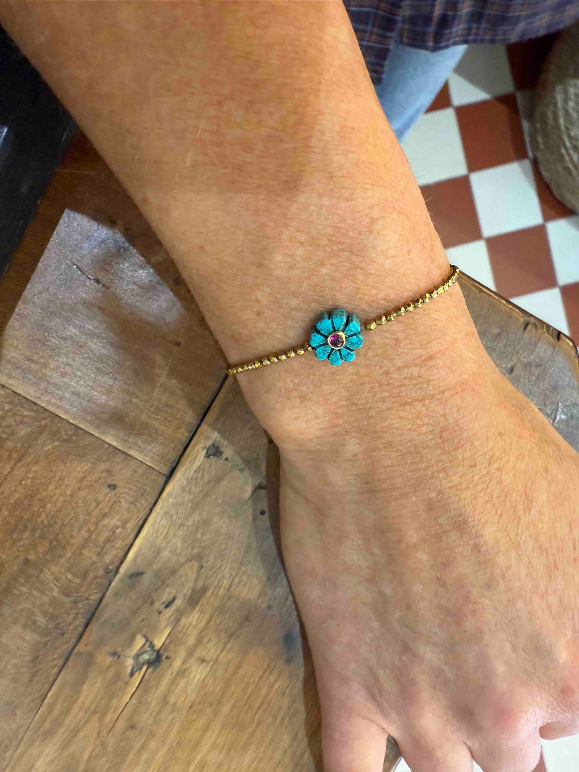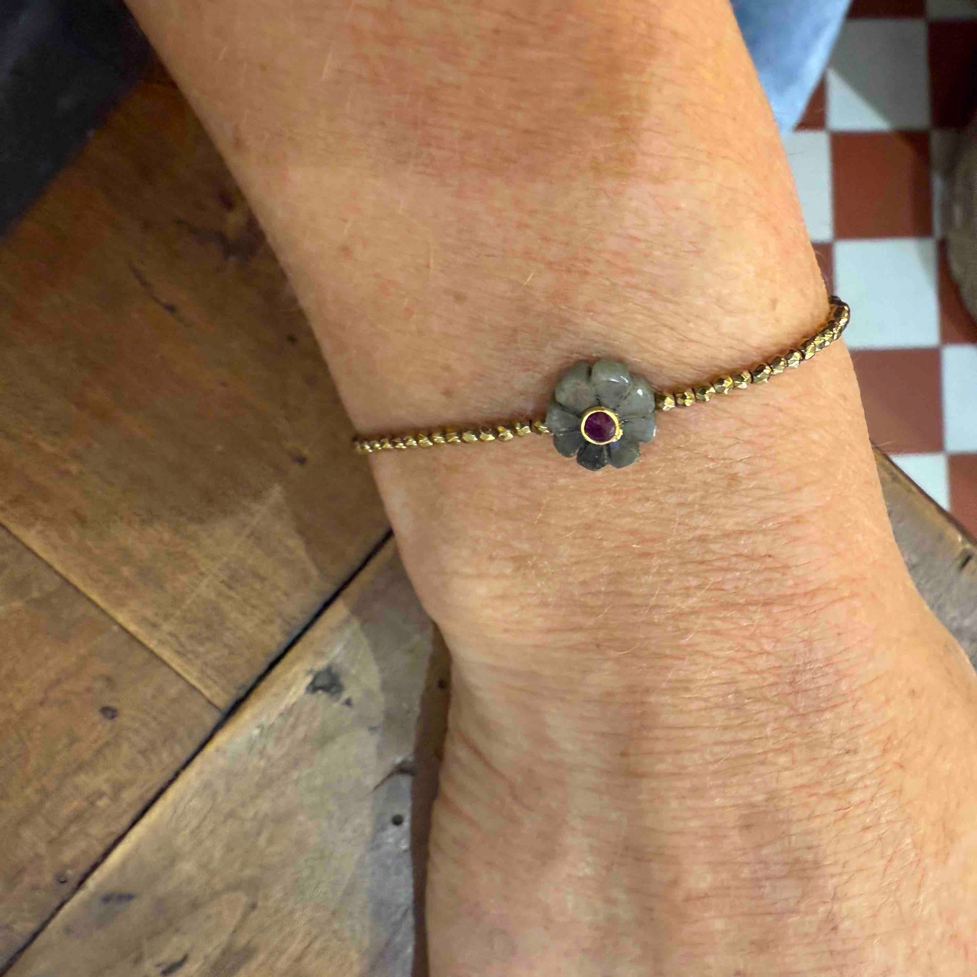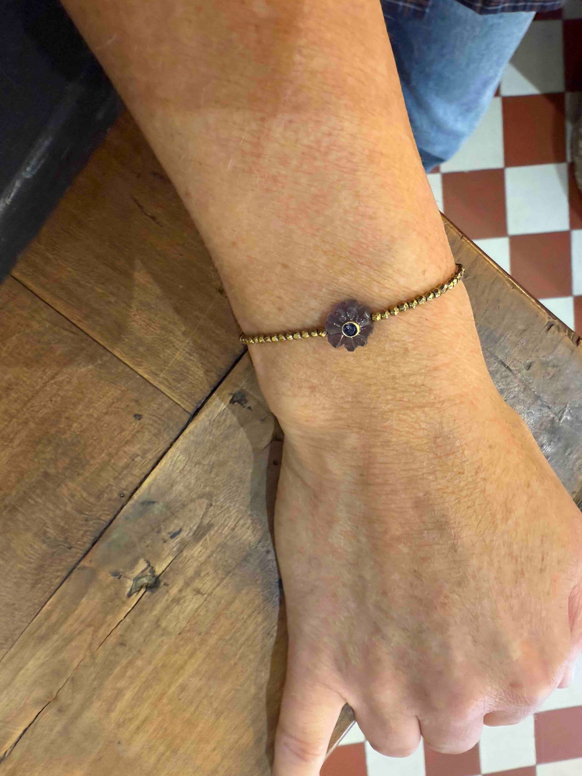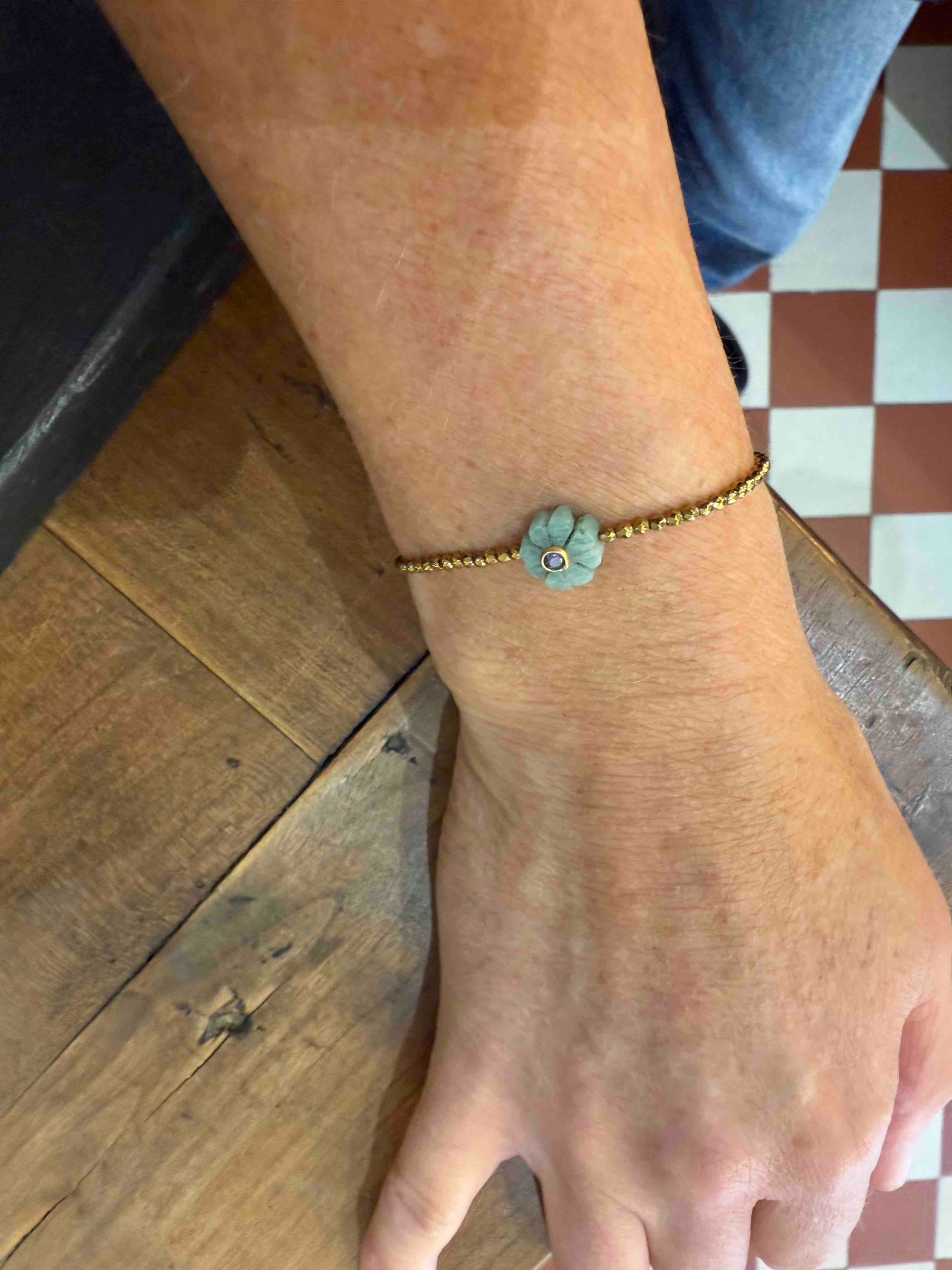 Ses perles dorées en hématite captent la lumière, tandis que la flower en pierre semi-précieuse, apporte une touche de couleur et de sens.