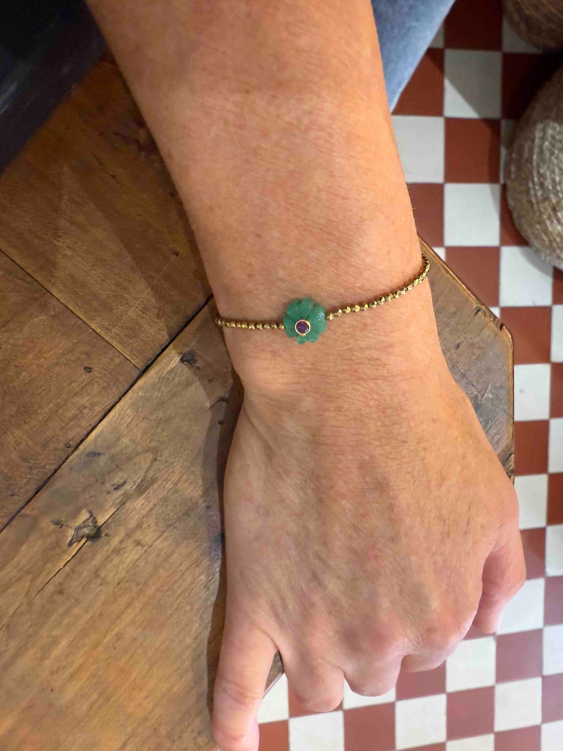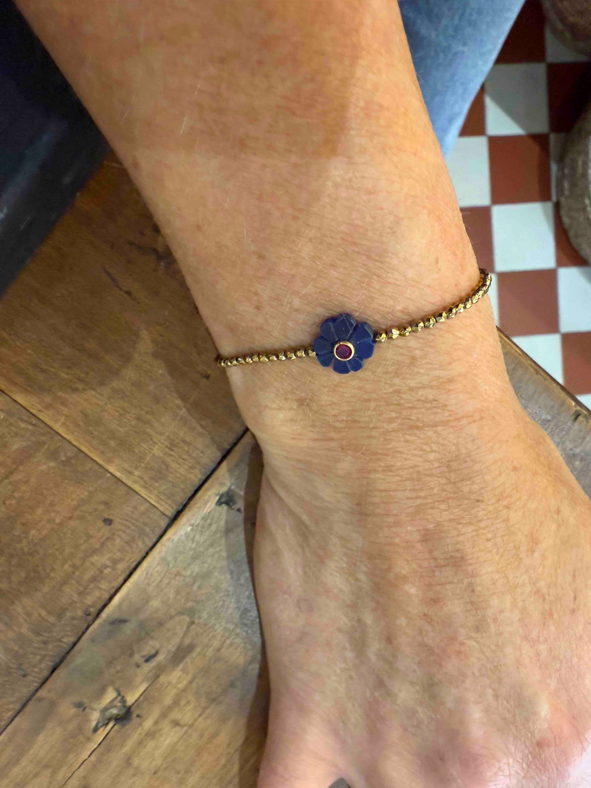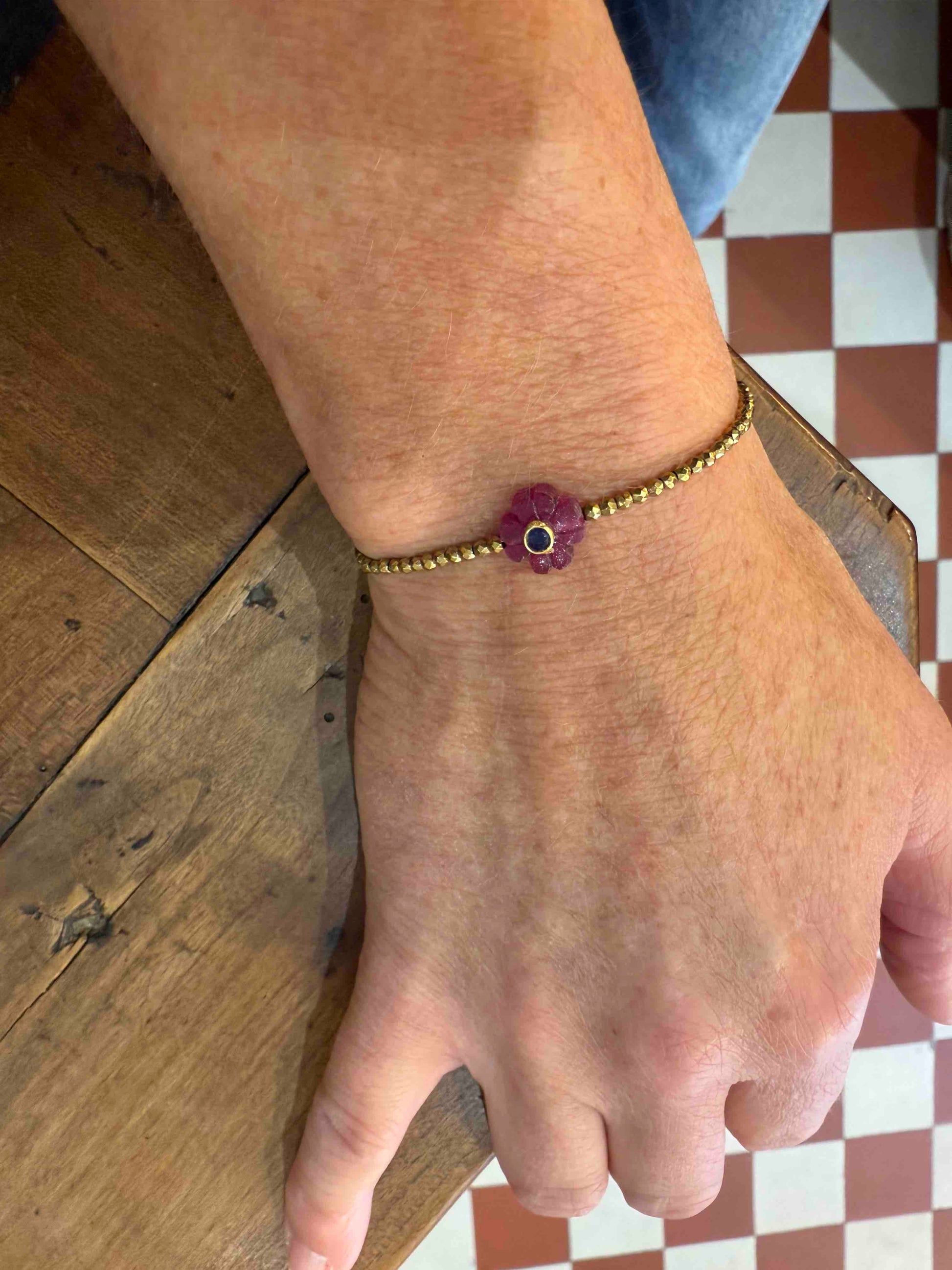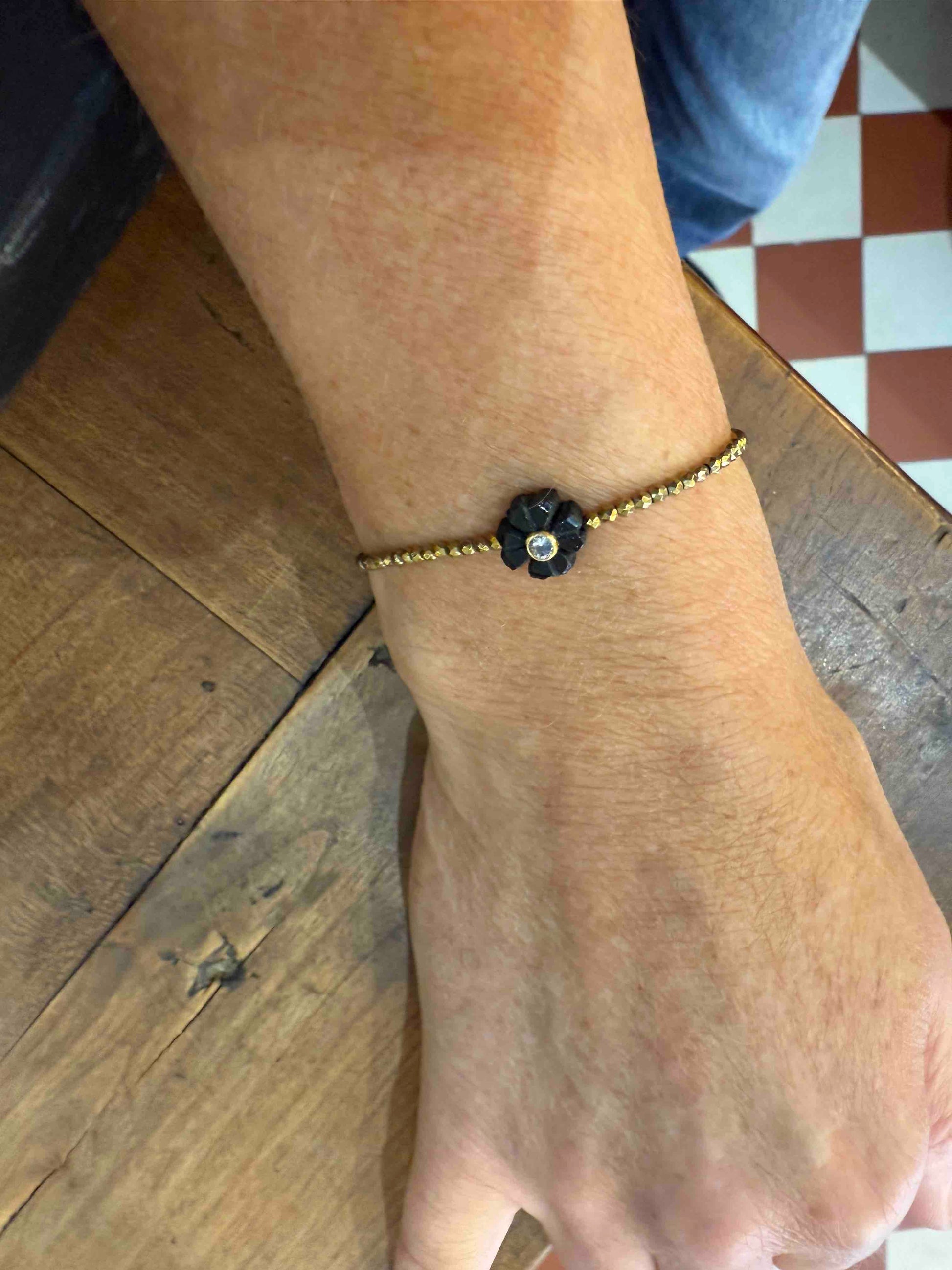 Ses perles dorées en hématite captent la lumière, tandis que la flower en pierre semi-précieuse, apporte une touche de couleur et de sens.