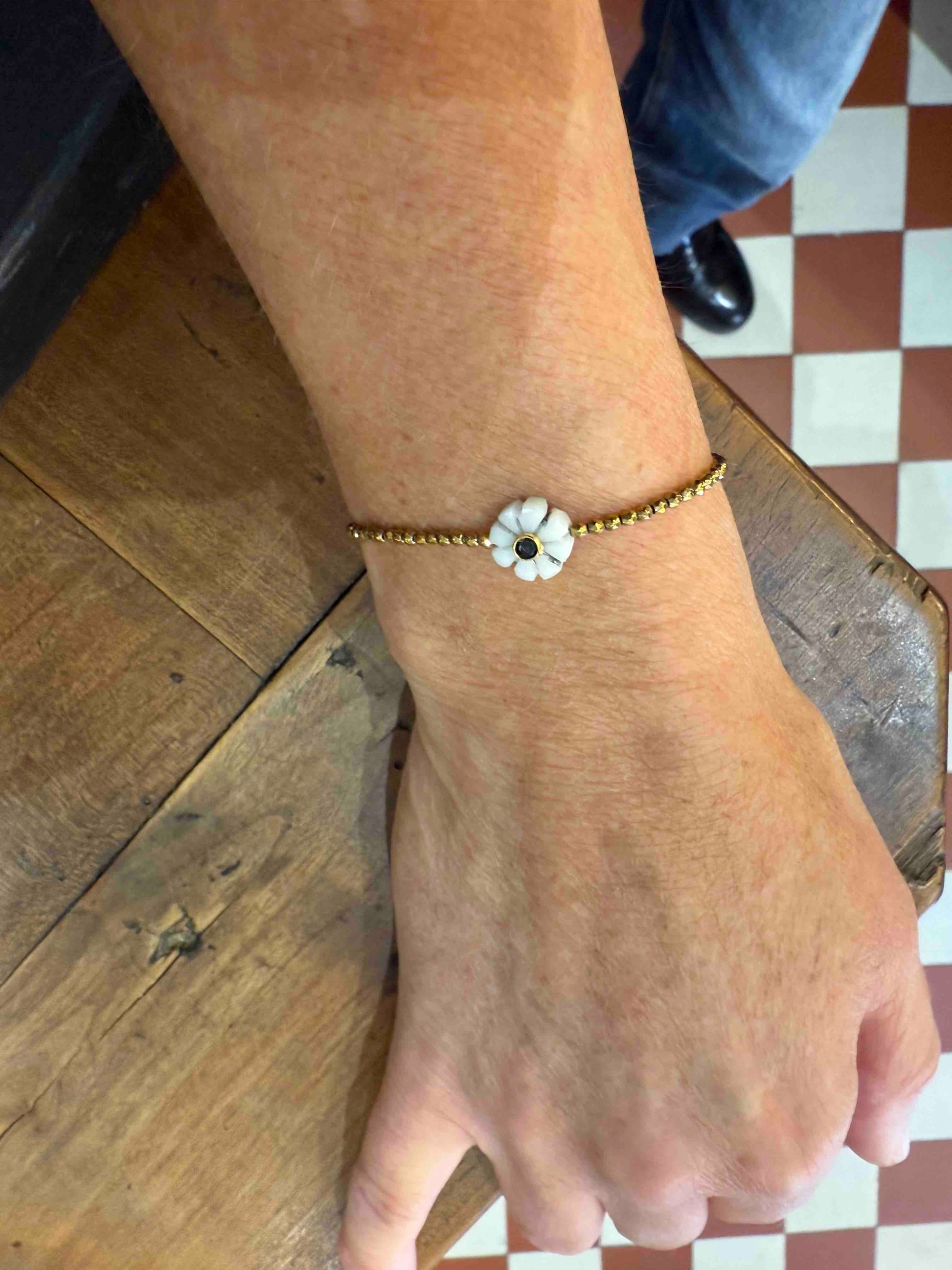 Le bracelet Mini Flower délicatement monté sur un fil élastique discret, il s’adapte à toutes les morphologies et se porte seul ou en accumulation.