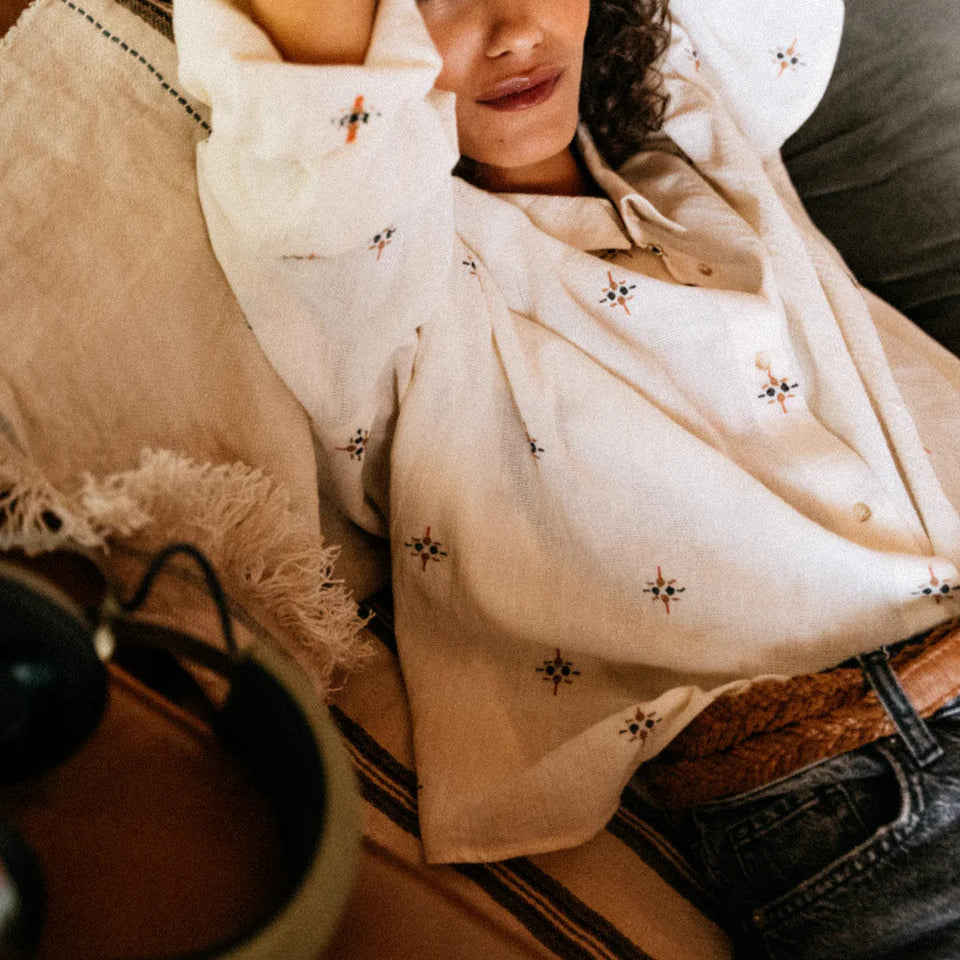 Ultra féminine on adore la chemise Ali en version écrue avec des motif brodés. Confectionnée en coton 100%, elle se porte toute l'année. Coupe ample. Côté détail on retrouve un col de chemise classique ainsi que des fronces aux épaules et en bas de manches.