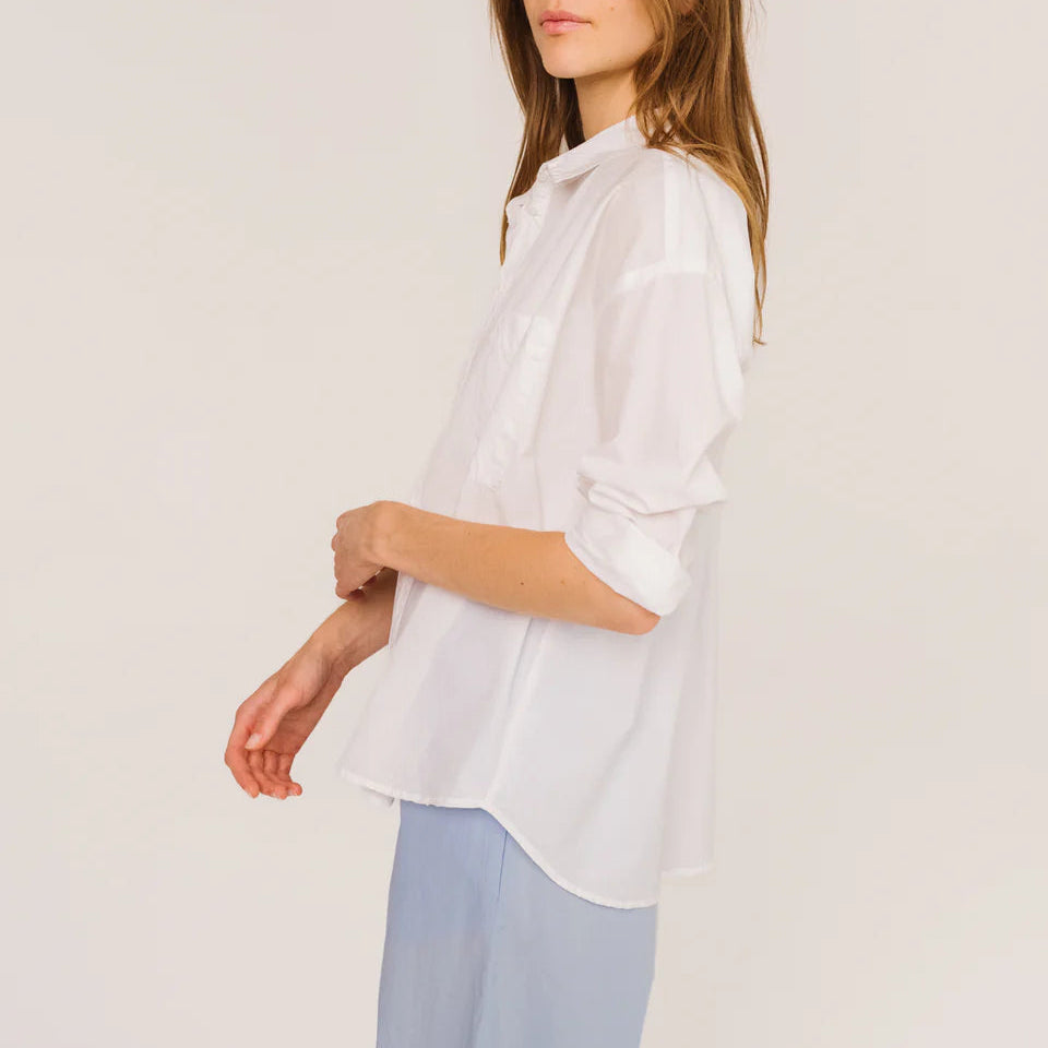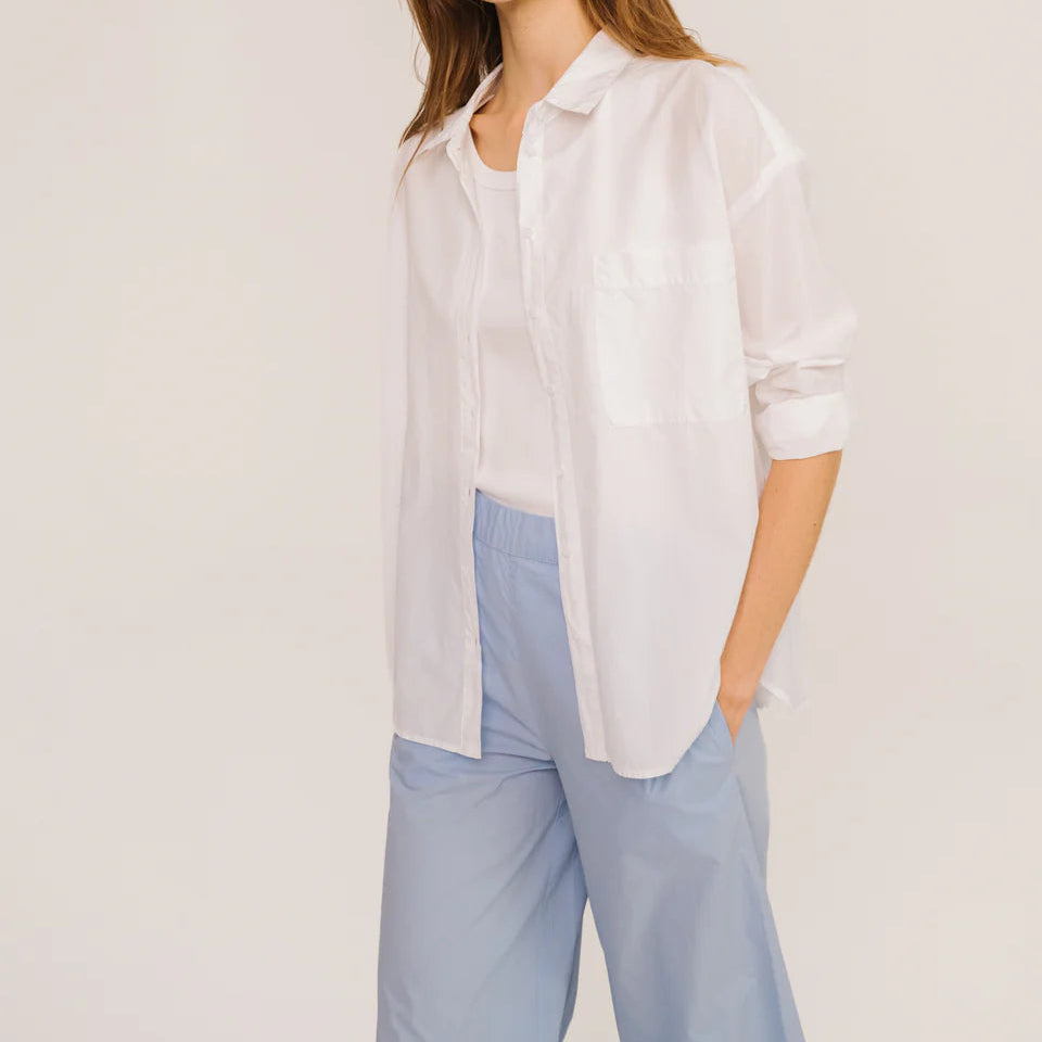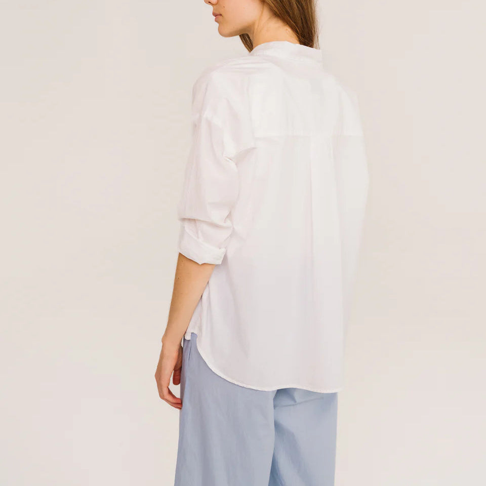 Chemise unie à manches longues en popeline de coton. Coupe loose avec pli dans le dos pour une allure ample et décontractée. Poche poitrine plaquée, col classique et boutonnage apparent. Patte capucin et poignets boutonnés en finition pour une touche de modernité.