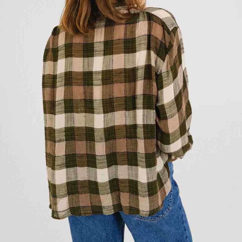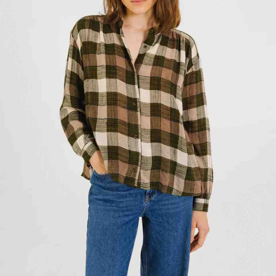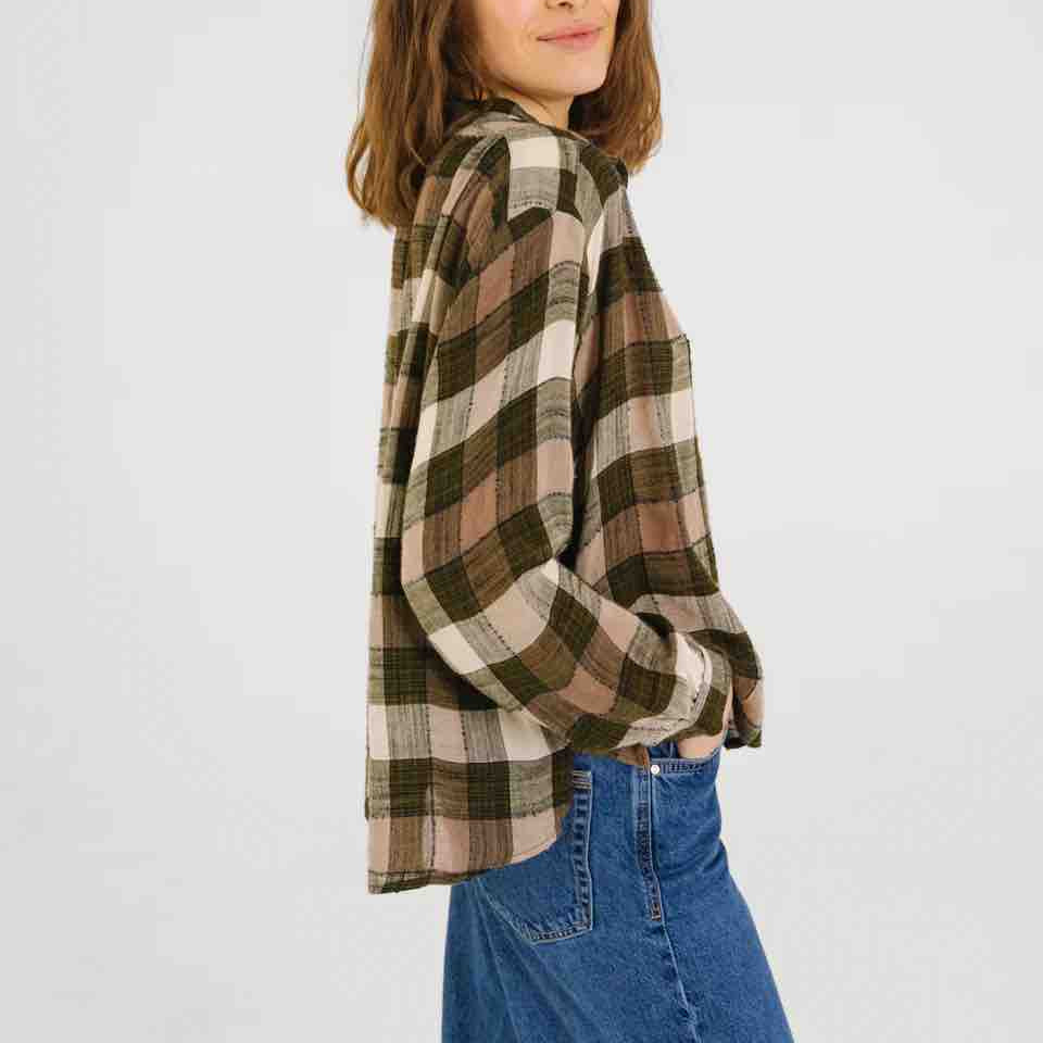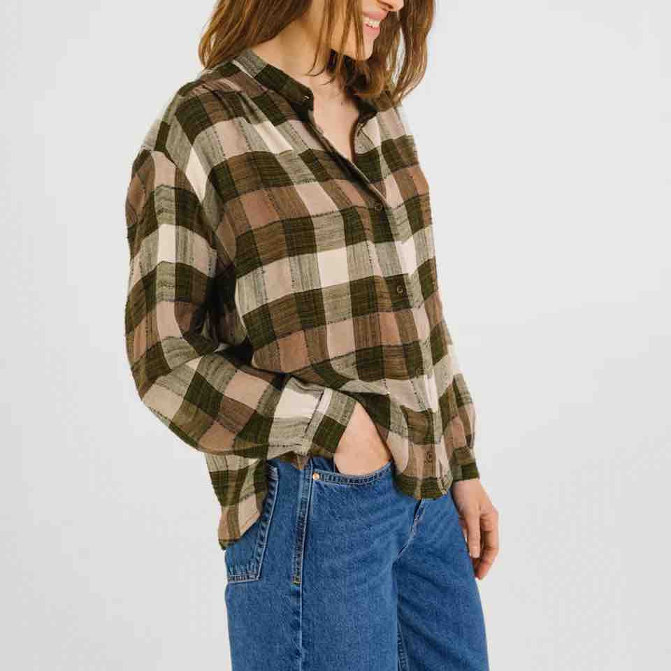 La chemise Elisa Crosby revisite les grands carreaux avec une version très féminine qu'on a adoré dans la version kaki, écru et taupe. Inspirée de la chemise d’homme, elle présente une coupe légèrement oversize avec une emmanchure basse pour une silhouette décontractée. Son col classique, sa poche plaquée sur la poitrine et son boutonnage apparent lui apportent une touche intemporelle. Poignets boutonnés en finition.
