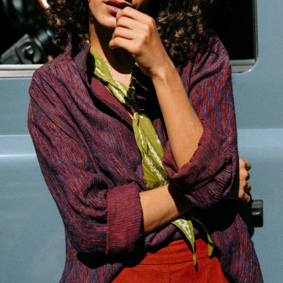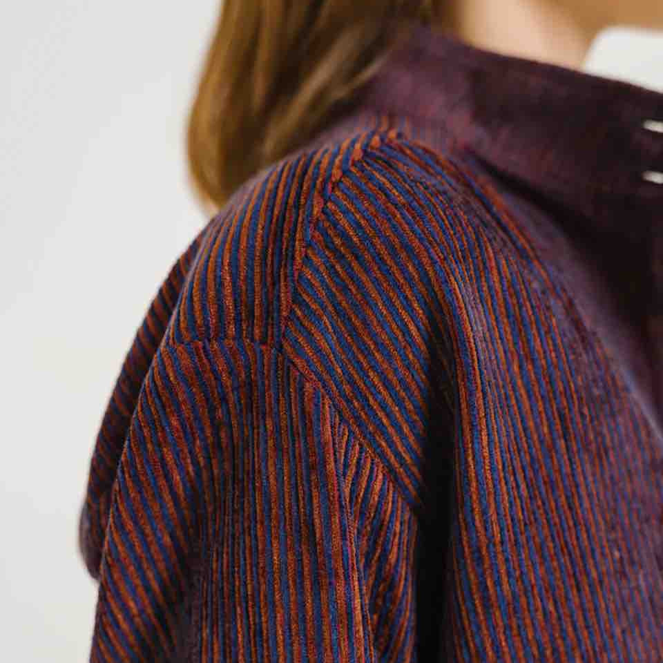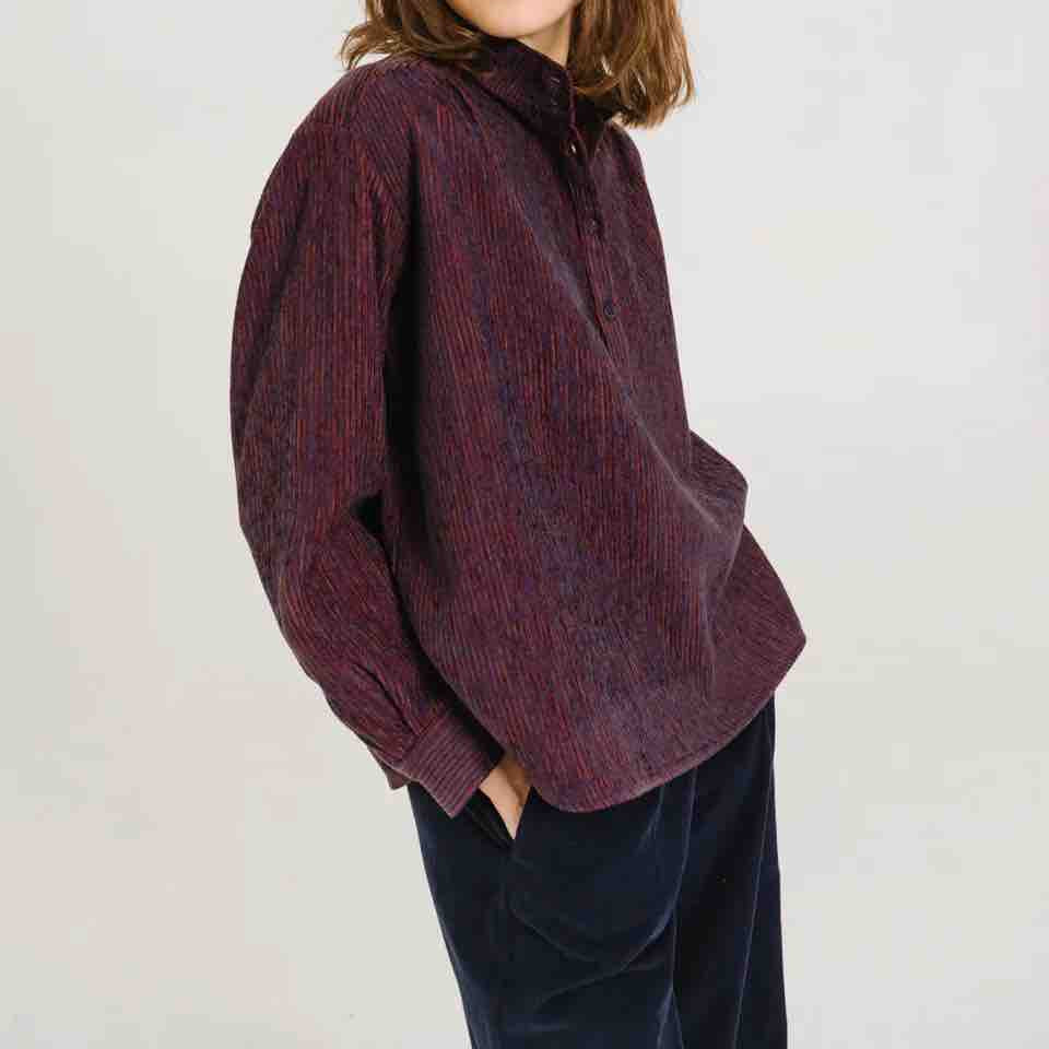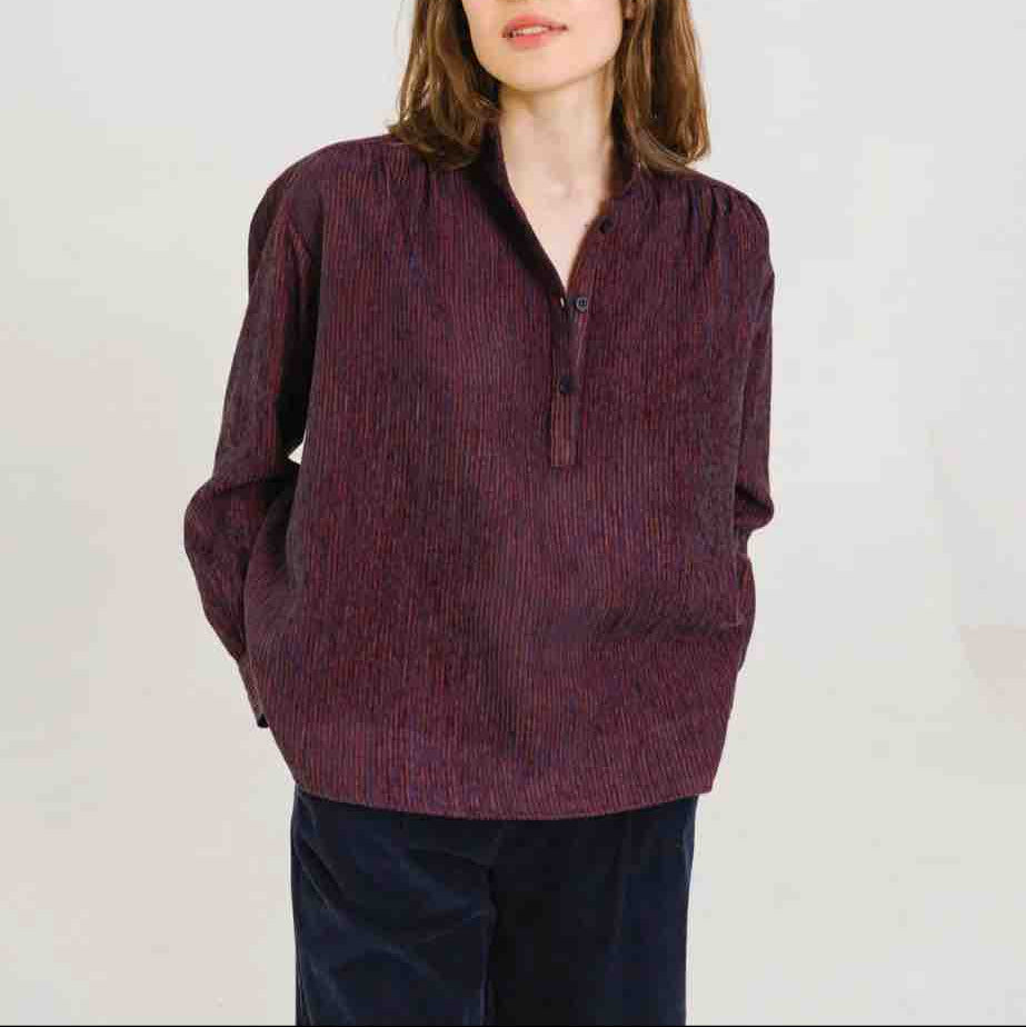 On est fans de la blouse Emma avec son col montant ! On la découvre avec plaisir dans une version velours rayé rouge et bleu. Sa coupe ample et ses emmanchures basses lui confèrent une allure fluide et décontractée. Froncée à l’avant et au dos, elle est soulignée par une patte polo et des bas de manches fermés par un bouton, pour une finition subtilement féminine.