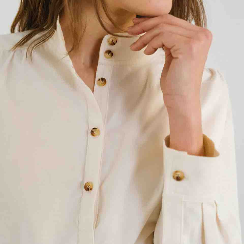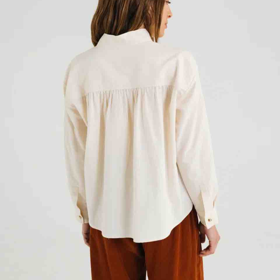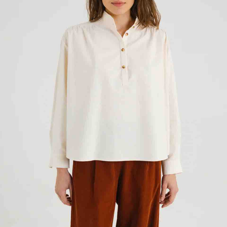 On est fans de la blouse Emma avec son col montant ! la blouse Emma Crema est en coton gratté écru, doux et confortable. Sa coupe ample et ses emmanchures basses offrent une silhouette fluide et décontractée. Froncée à l’avant et au dos, elle est dotée d’une patte polo et de bas de manches fermés par un bouton, pour une finition délicate et élégante.