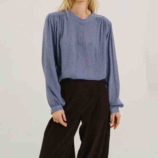 Une couleur blue jean qui se marie avec perfection à vos looks automne hiver. La chemise Gladis est confectionnée dans un mélange de viscose et laine bleu chiné. Sa coupe ample et fluide est mise en valeur par un col mao fin et des fronces à l’avant, au dos et en bas de manches. Les manches légèrement bouffantes apportent légèreté et élégance à la silhouette, tandis que les poignets boutonnés signent une finition délicate.