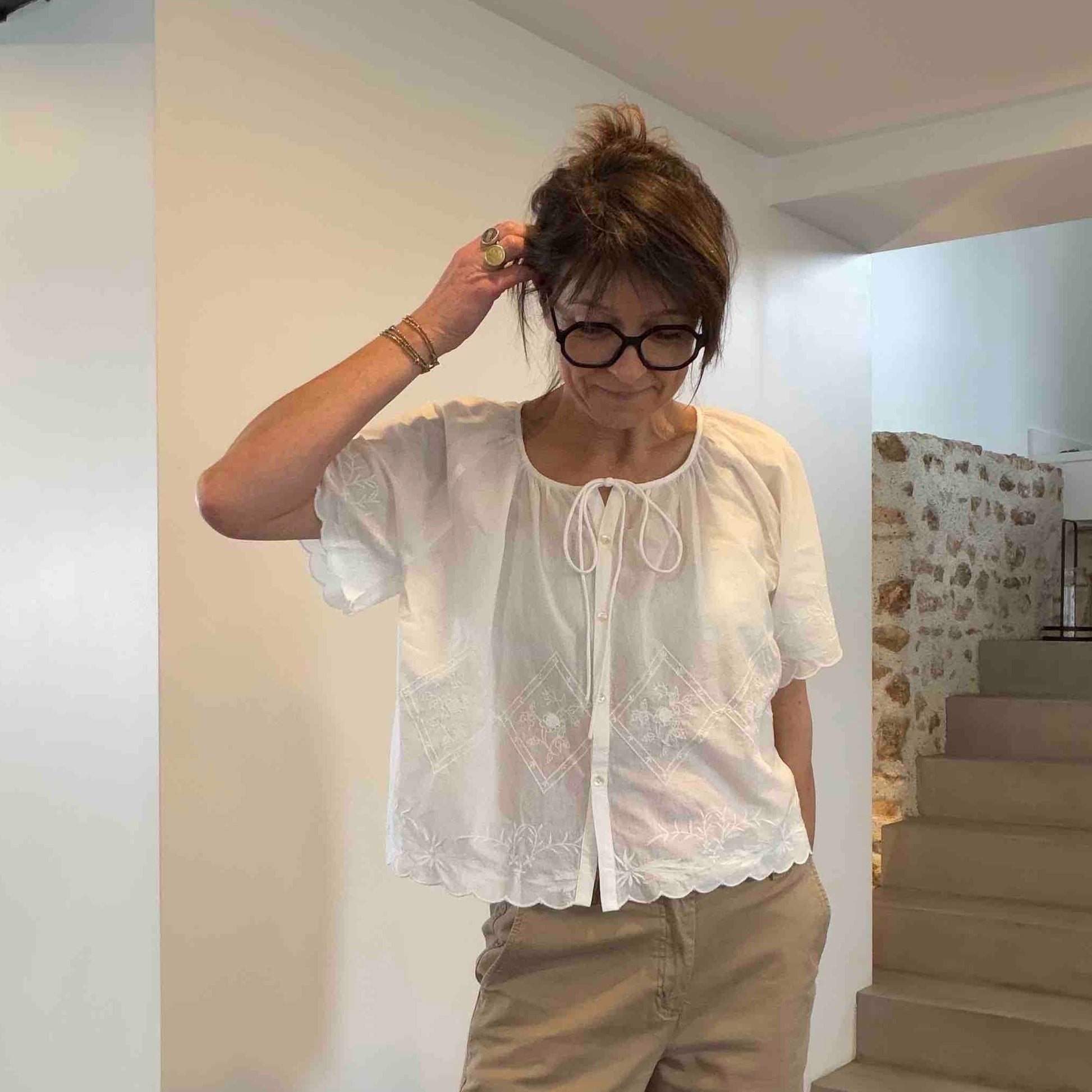 Jade c'est la chemise romantique de Hod Paris. Avec ses bordures festonnées, ses broderie et son col à lacet, elle nous a séduite ! On l'imagine parfaitement twistée sur un jean Gala de Hod. Manches courtes, col rond, coupe oversize.