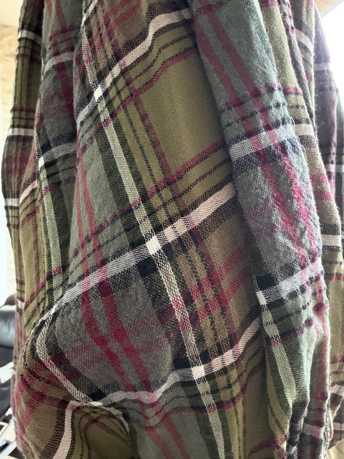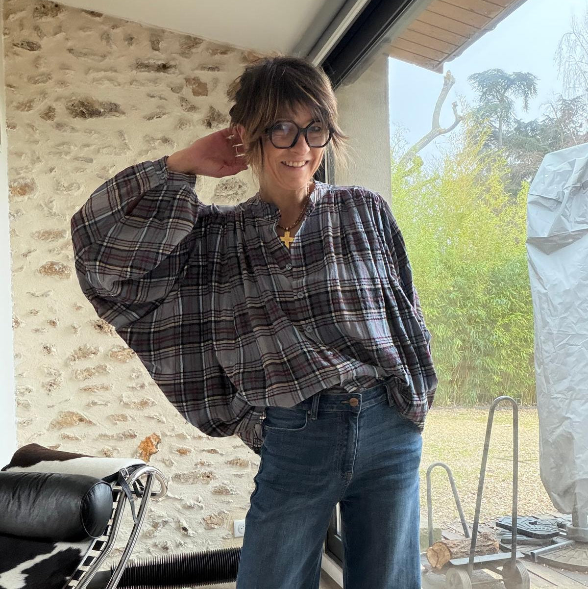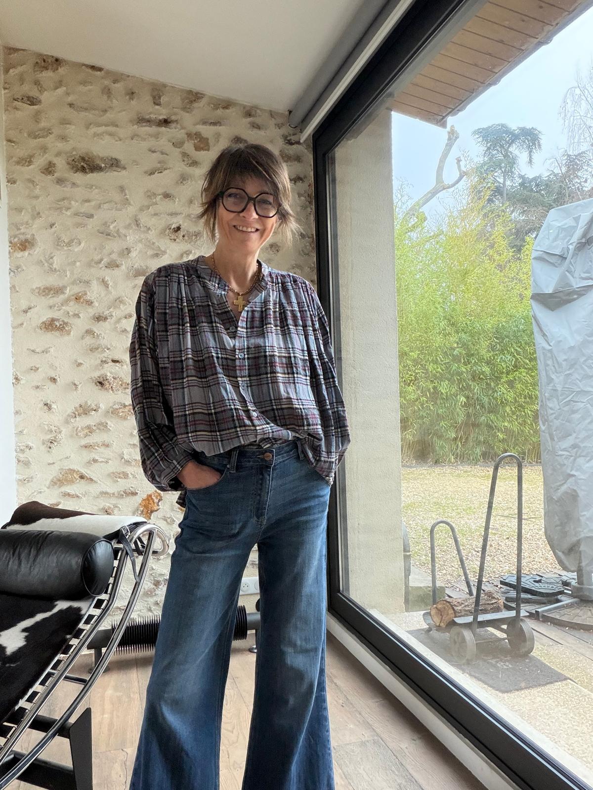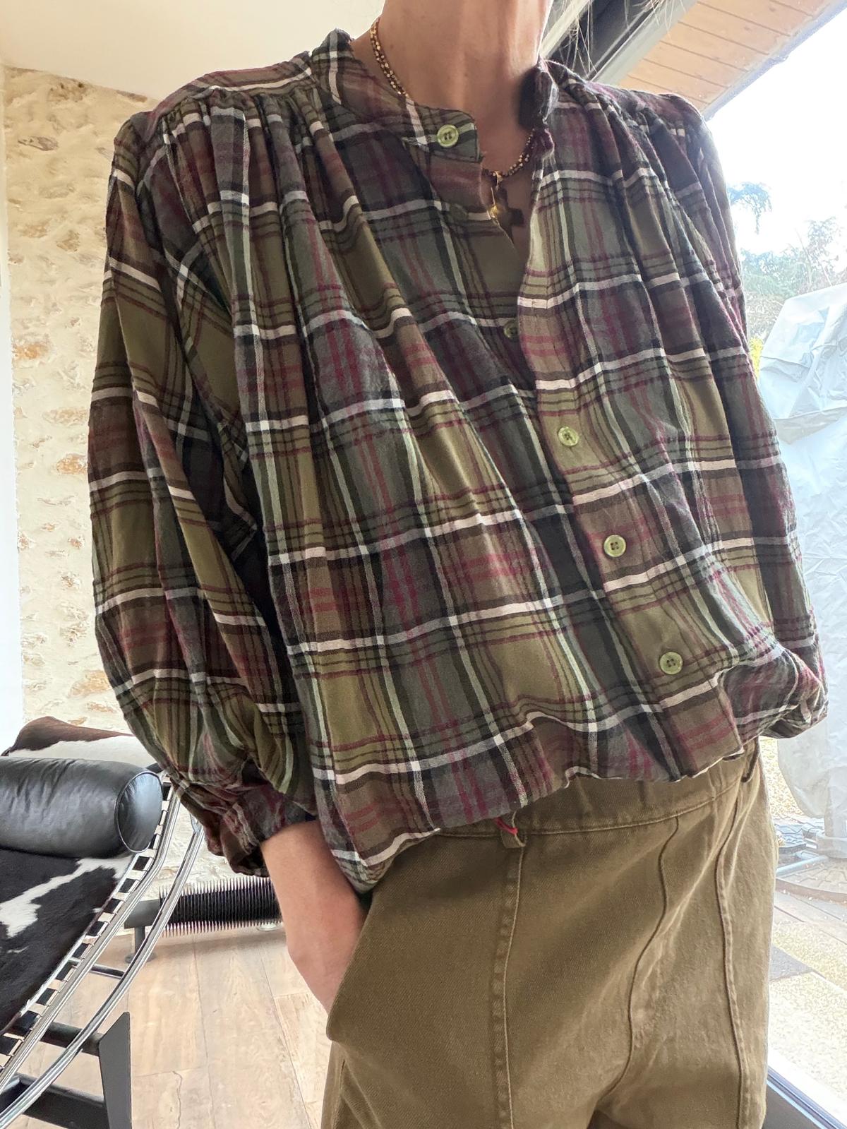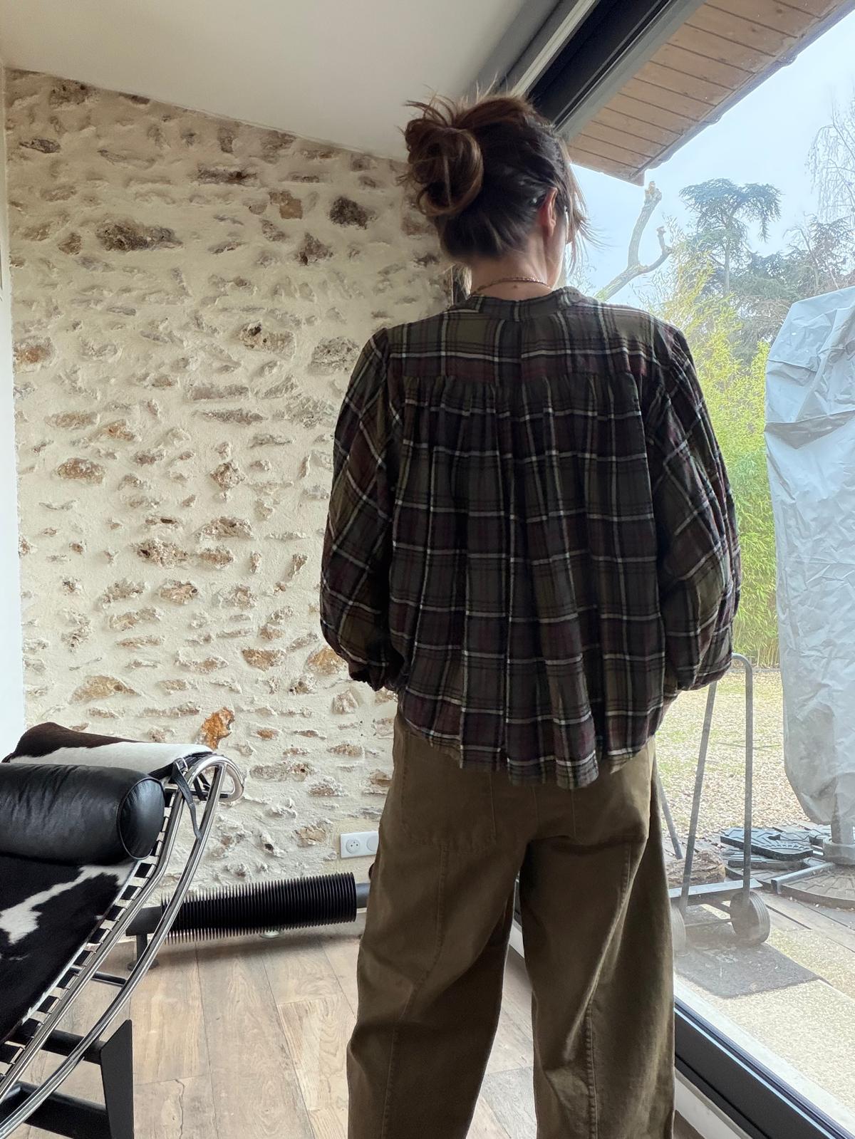 Chemise à manches chauve-souris, coupe très ample. Fronces devant et dans le dos. On adore son motif à carreaux et le mélange de couleurs sur les imprimés : kaki prune et bleu/gris prune. Très facile à assortir pour réveiller un look un peu bohème !