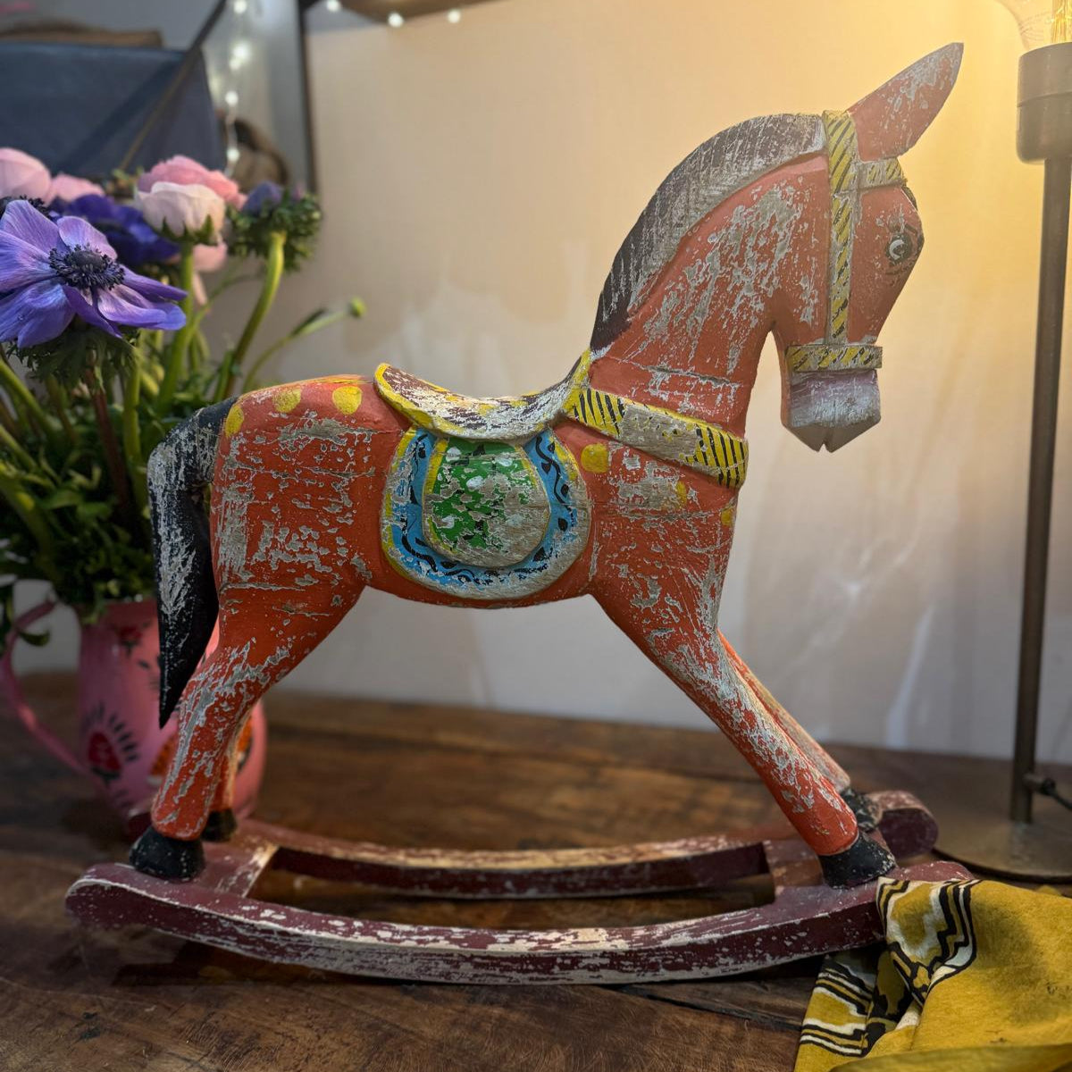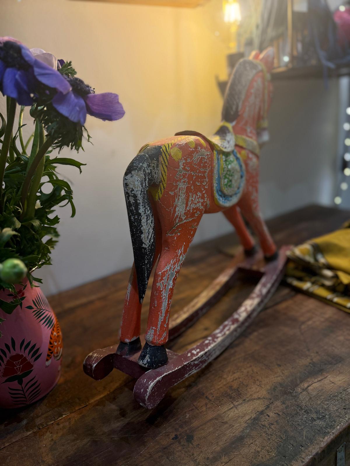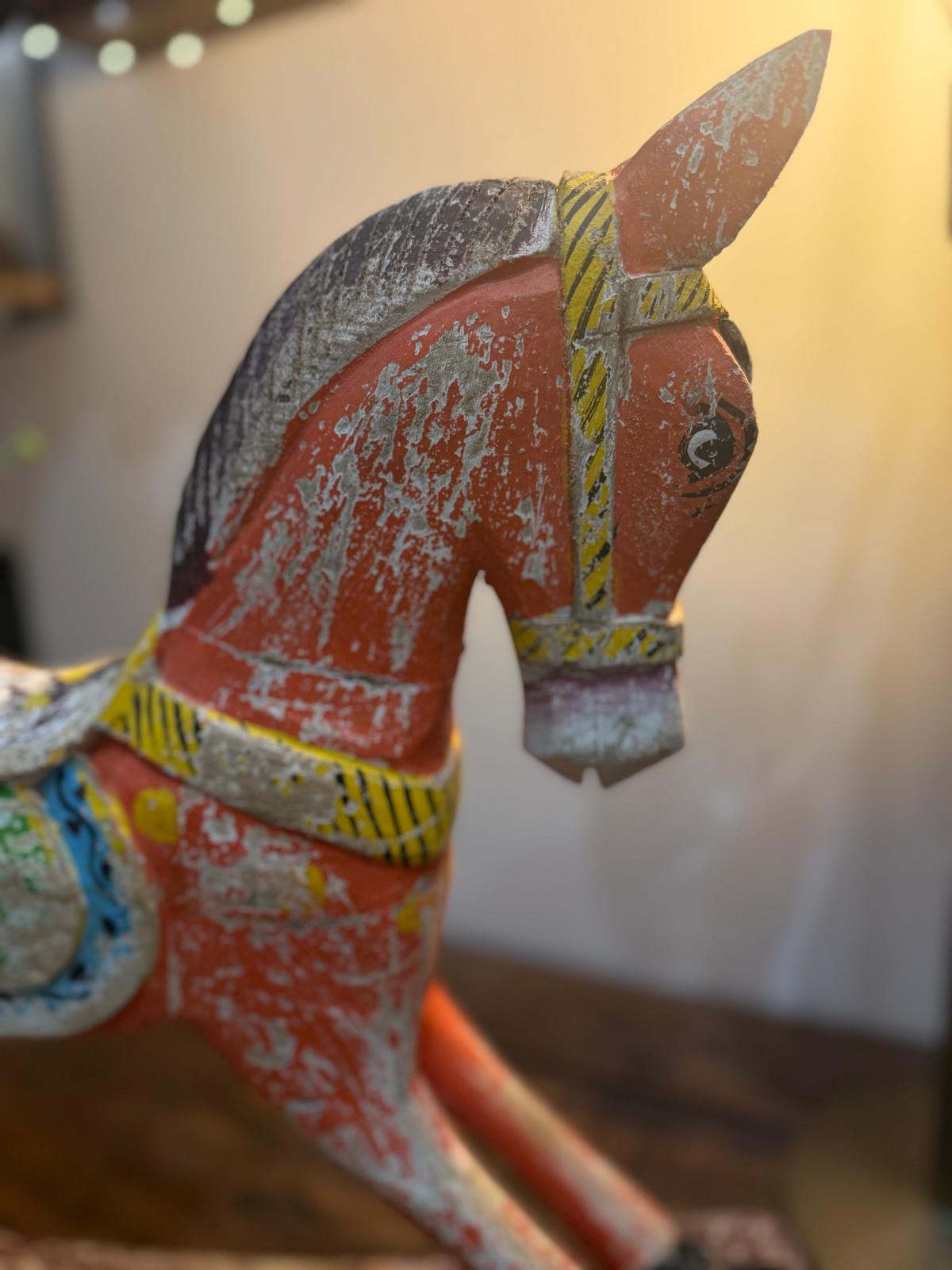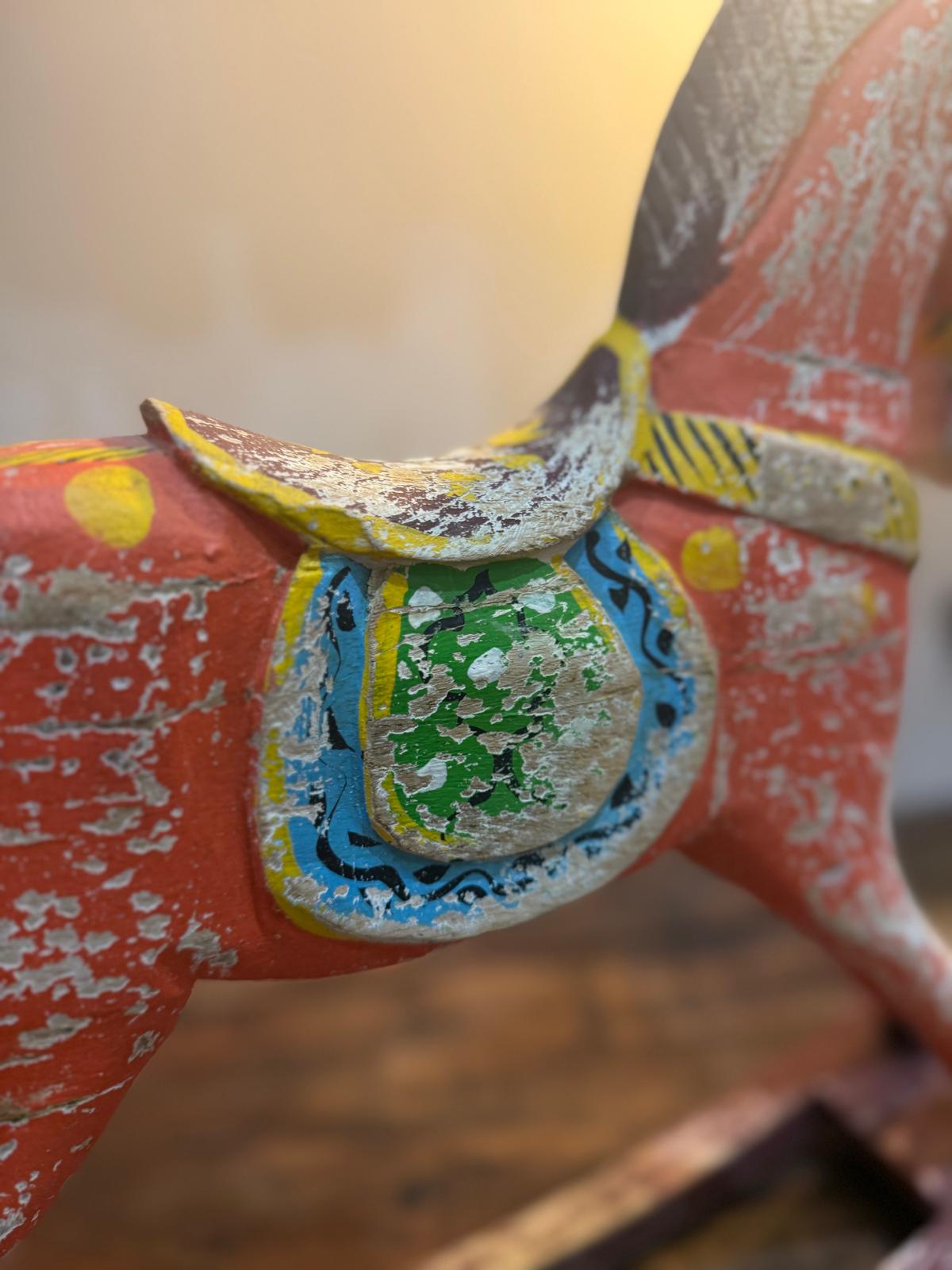 Magnifique cheval à bascule ancien indien. Pièce unique. Entièrement peint à la main.