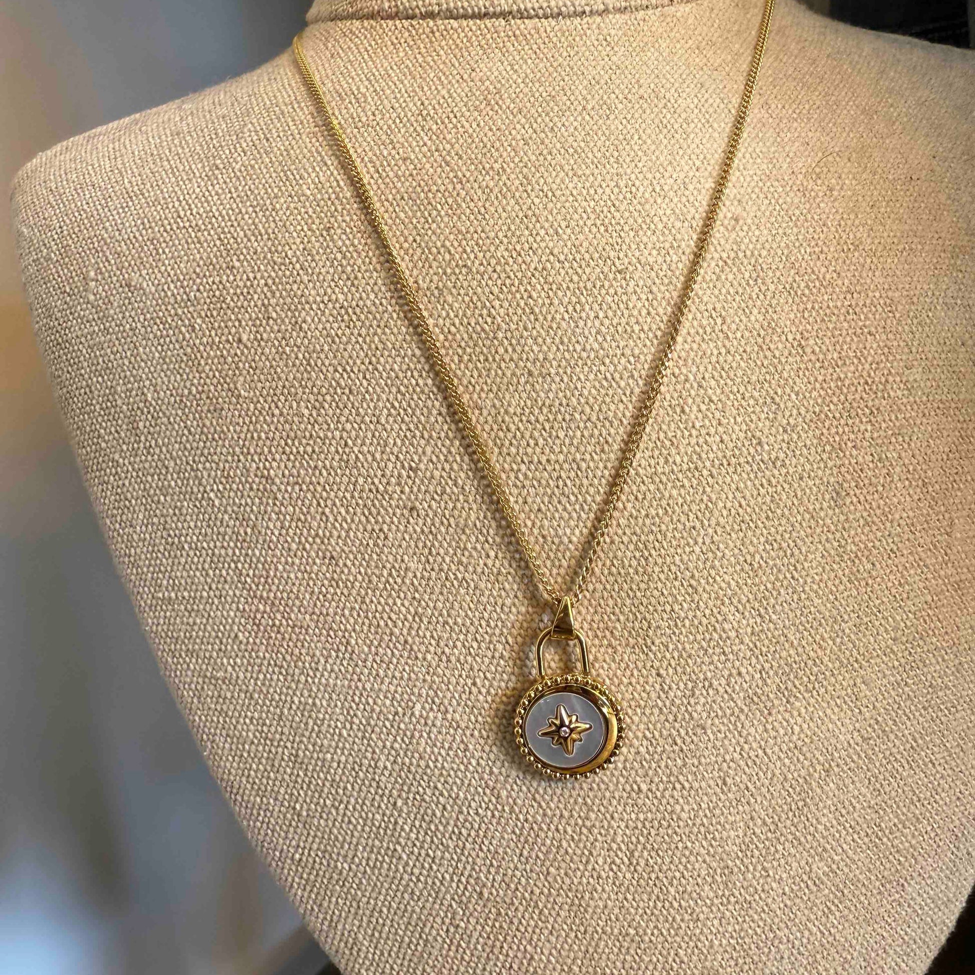 Collier en acier inoxydable mi-long doré et gris.