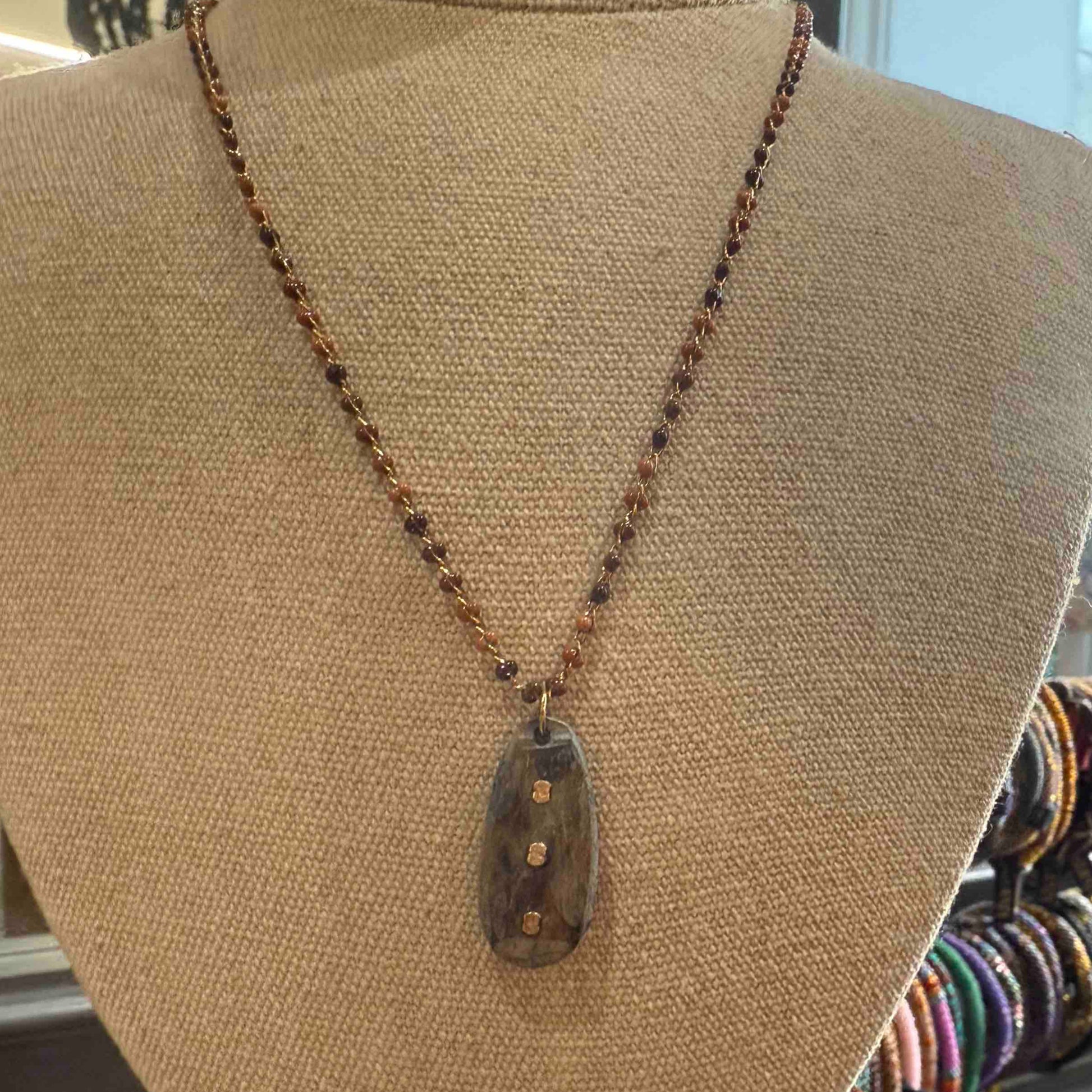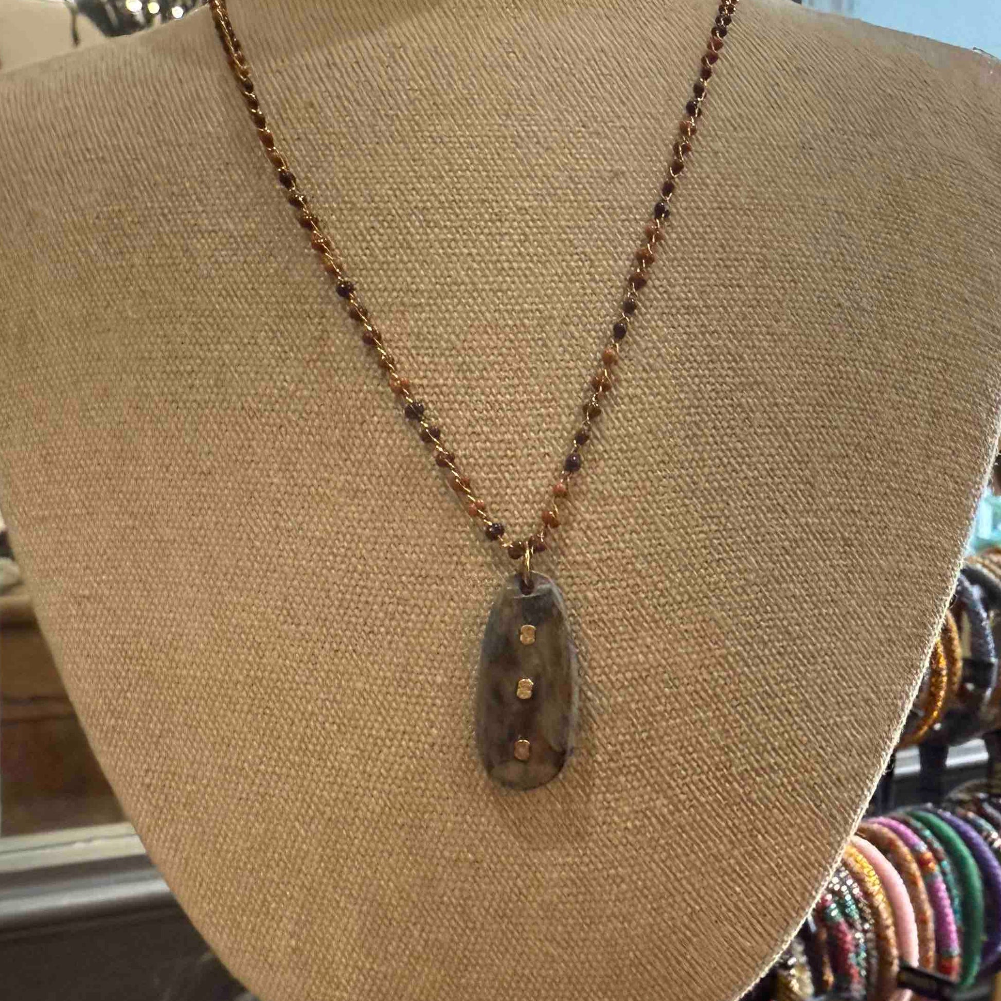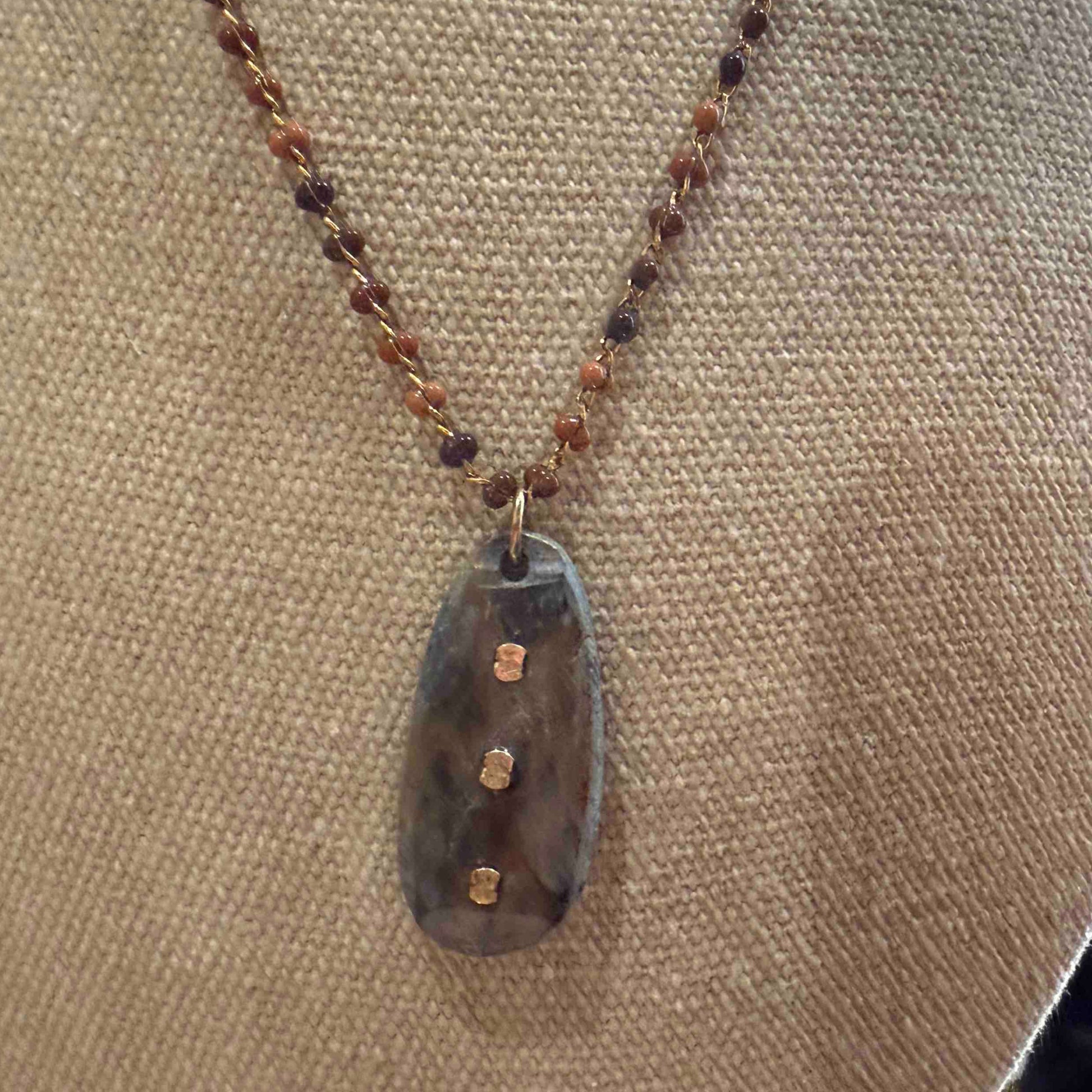 Le collier Meria est monté sur une fine chaîne incrustée de petite pierre fines accompagné d'une pierre centrale ornée de petites dorées. Les pierres semi-précieuses, la délicatesse de la chaîne et les pépités dorées offrent un bijou unique de caractère. Fermoir : un lien aimanté discret mais puissant en gold filled 14kt. Ce fermoir aimanté permet en un clic de mettre et d'enlever votre collier.
