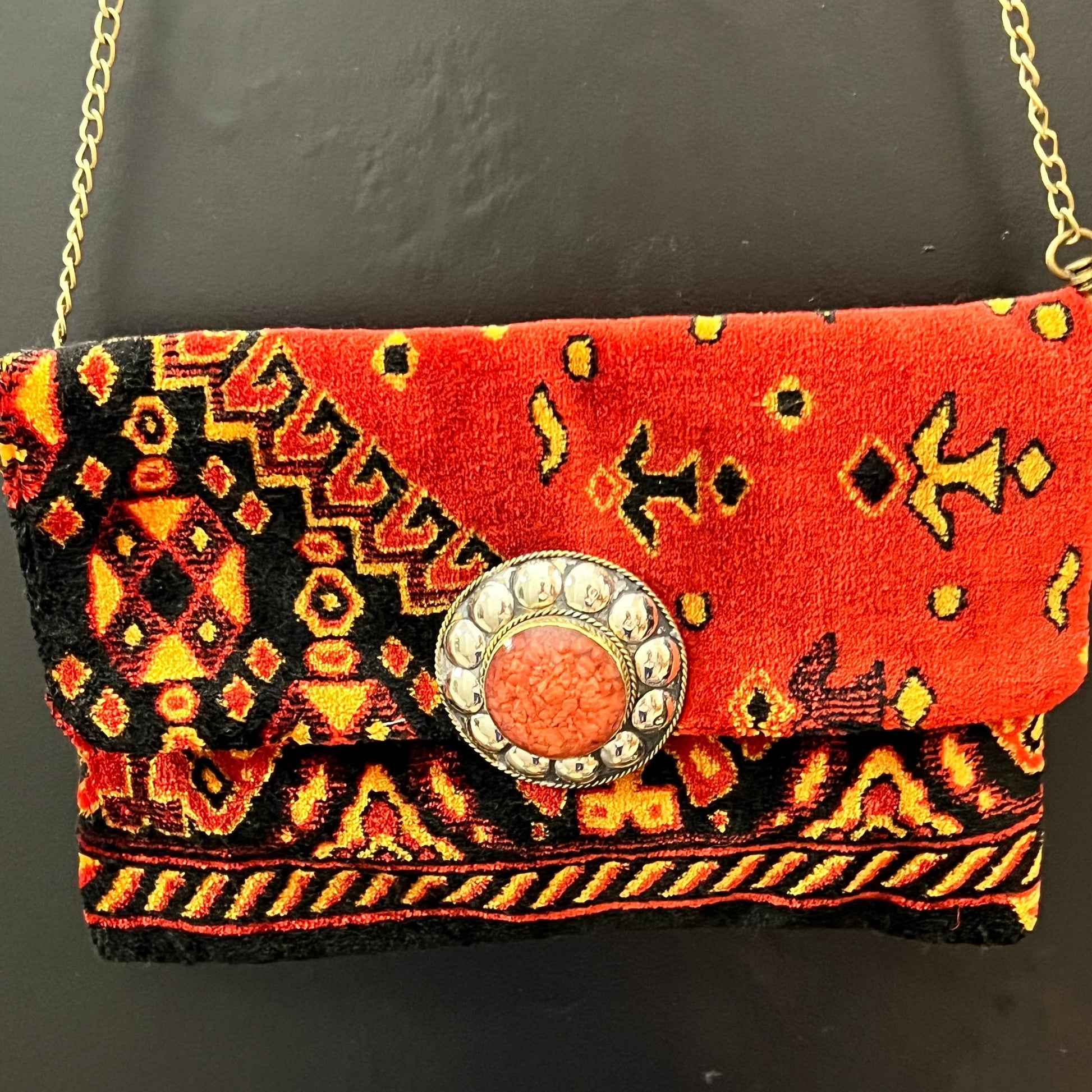 Réalisé à partir de tapis de prière ancien recyclé (coton), chaque sac est une pièce unique et entièrement réalisé à la main. Fermeture par zip intérieur et 2 boutons aimantés. Boucle rouge chaine couleur bronze