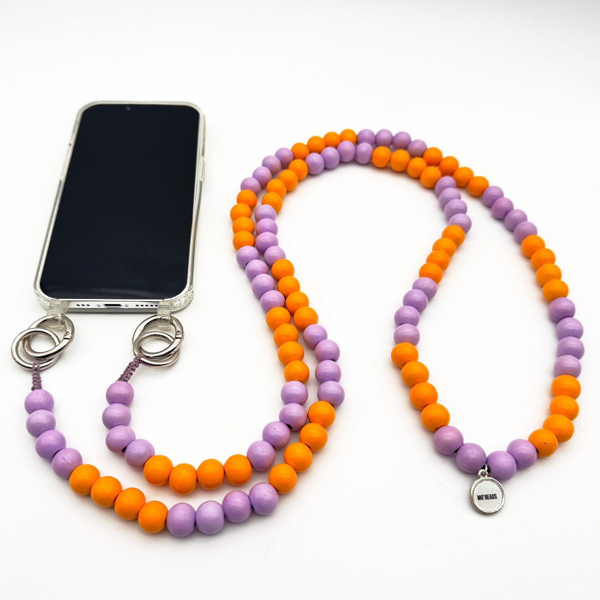 Collier pour téléphone portable Candymix en perles de boi.s Il est composé de 108 perles de bois teintées dans les couleurs lilas et orange. La chaîne pour téléphone portable a une longueur totale de 130 cm, est nouée à la main en Allemagne, enfilée sur un fil de coton ciré de haute qualité et est facile à remplacer par la housse de votre chaîne de téléphone portable existante grâce à deux anneaux de poche avec fermeture à clic.