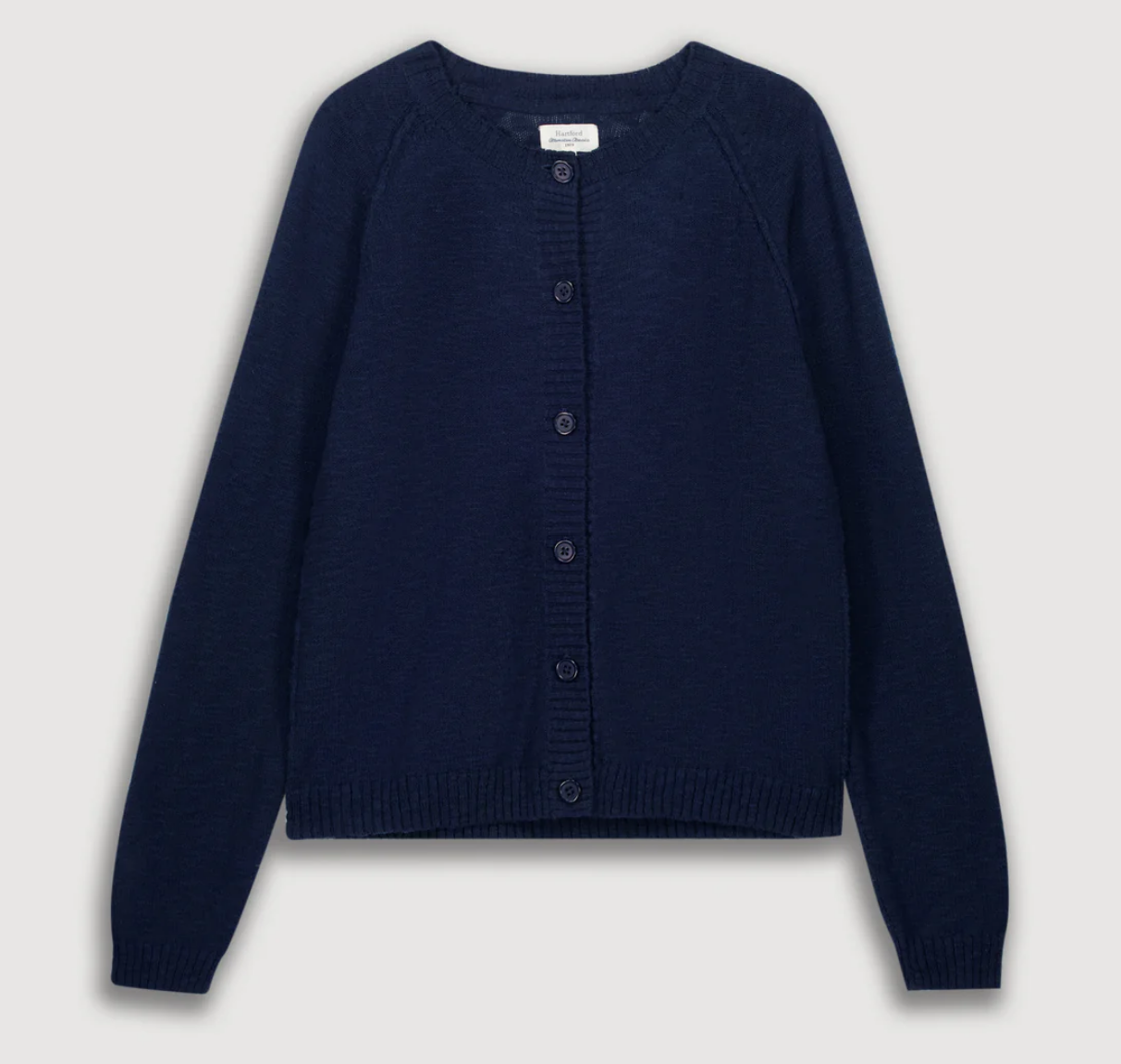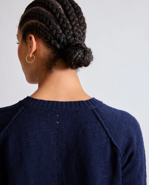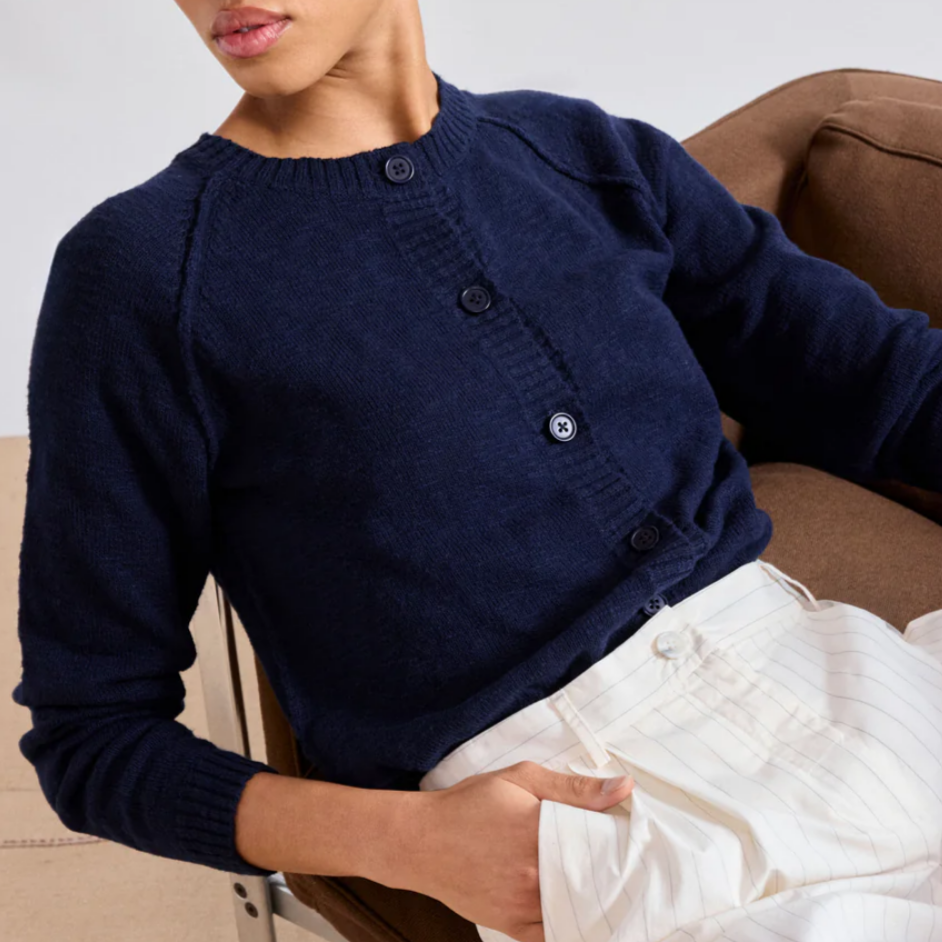 Cardigan femme à manches longues en coton flammé. Encolure ronde et boutonnage simple à six boutons. Emmanchures raglan avec coutures apparentes et détails milieu dos ajourés.