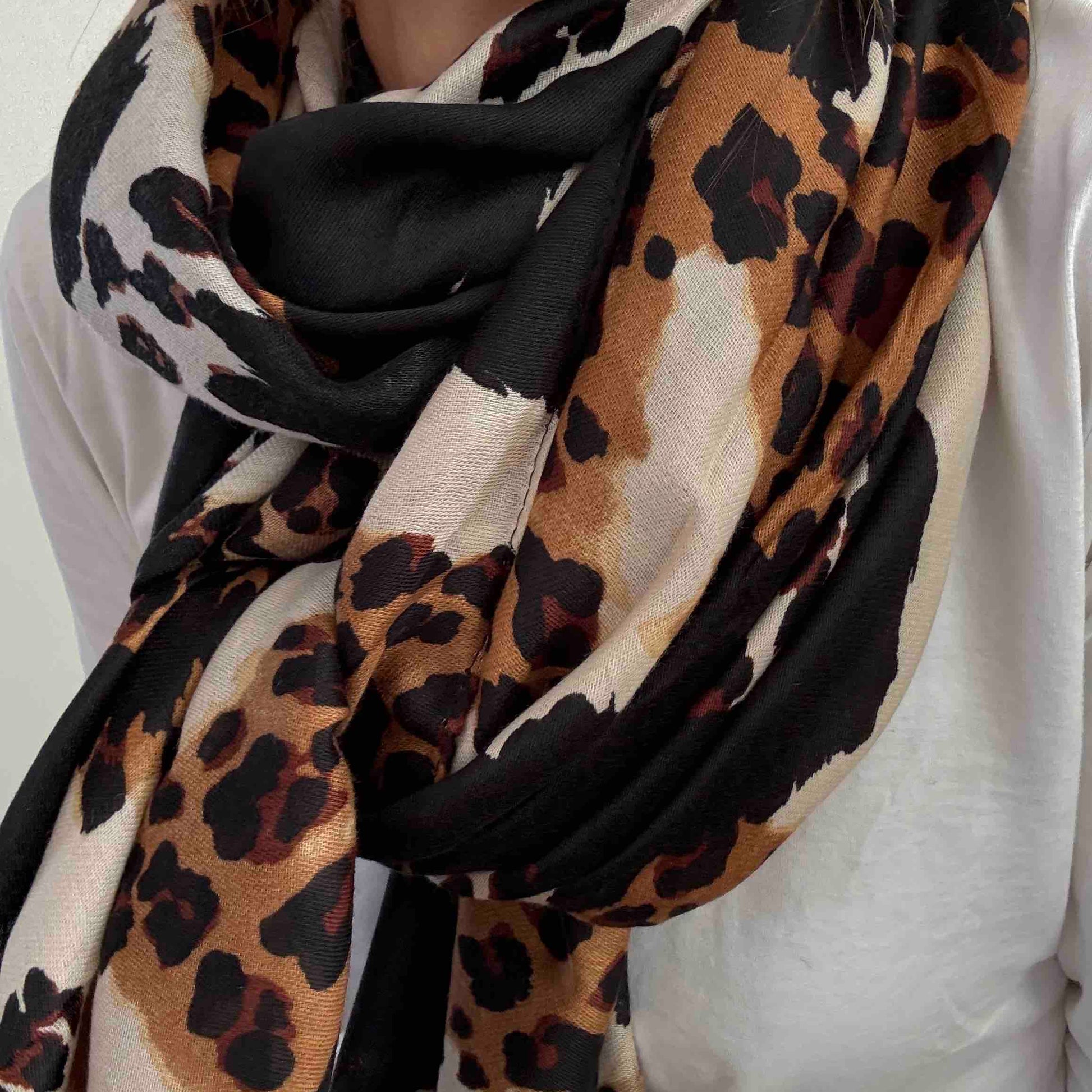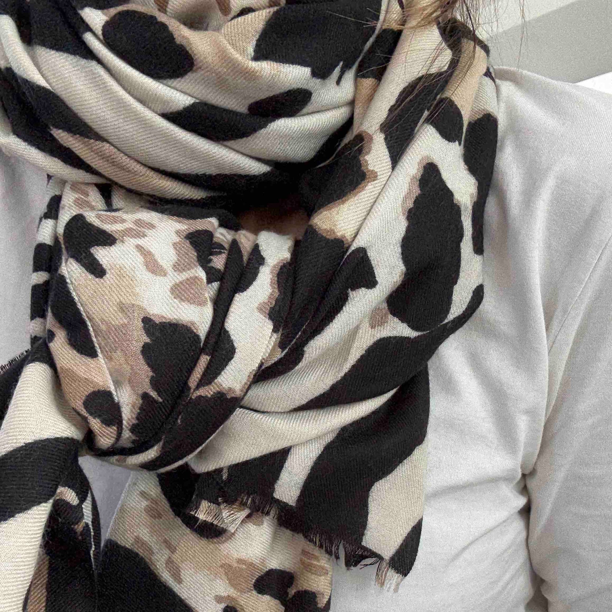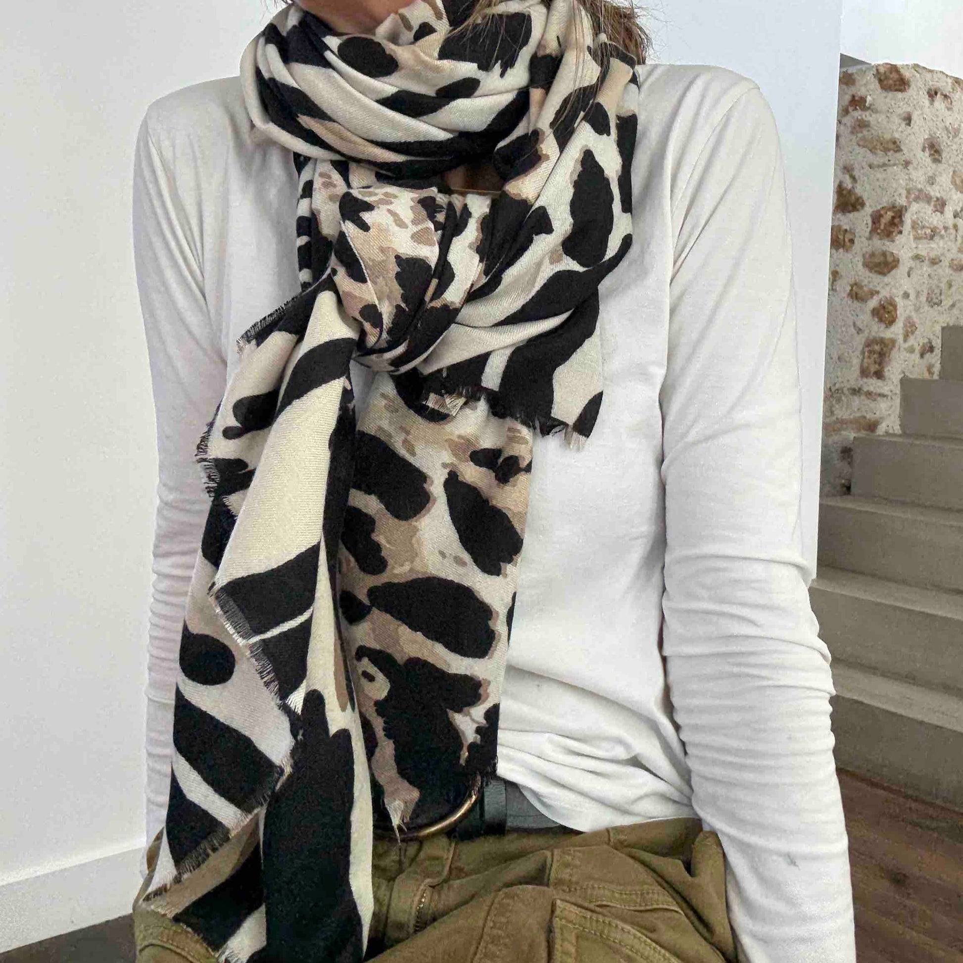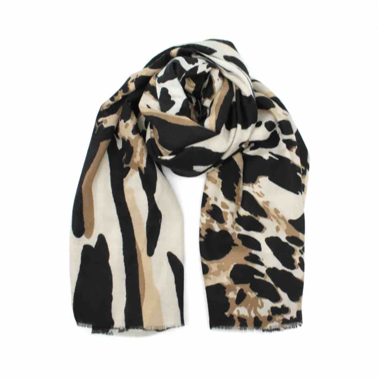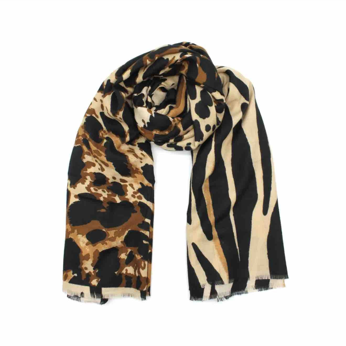 Très grand foulard rectangulaire léger et doux. On adore le motif jungle entre léopard et zèbre. Très facile à assortir avec des couleurs ultra tendances.