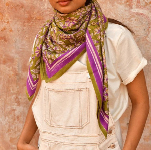 Du violet et du vert kaki pour ce grand foulard fleuri Carthage Kaki.