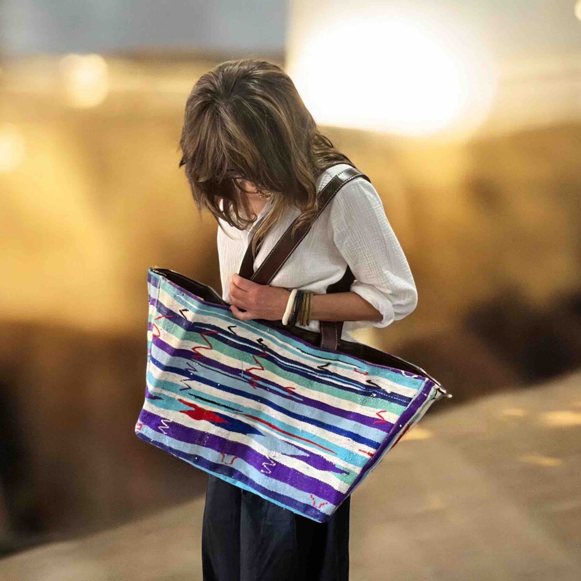 Le grand cabas Margarita est un modèle unique, dessiné par Thank You Margareth et réalisé artisanalement au Maroc à partir de couvertures berbères anciennes.