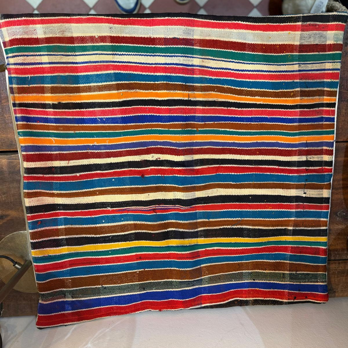 PIèce vintage berbère avec un dos en coton épais. Chaque tissu présente des irrégularités de part son caractère vintage, ce ne sont pas des défauts, juste les marques du temps qui confèrent à votre housse de coussin haik un caractère unique et artisanal. Fermeture par zip sur la largeur.