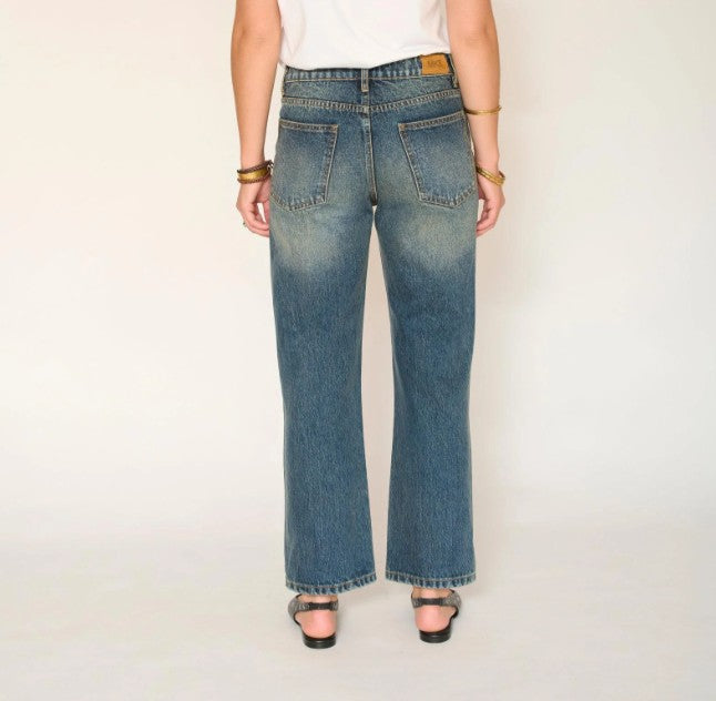 Ce modèle présente également des détails pratiques, tels que des poches arrière visibles, renforçant sa fonctionnalité. Il se marie parfaitement avec un t-shirt blanc basique ou un foulard, ce qui souligne sa polyvalence et sa capacité à s'adapter à divers looks, allant du plus décontracté au plus habillé.