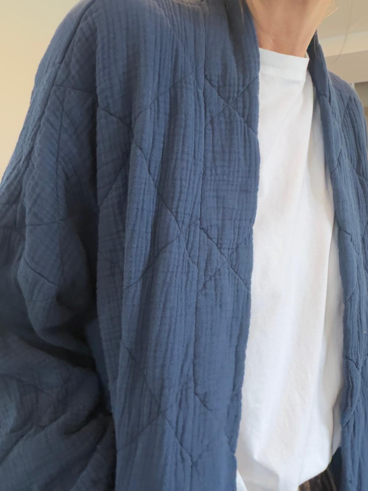 Veste kimono longue en coton, matelassée. 2 grandes poches plaquées, col châle. La parfaite veste au style japonisant, à porter toute l'année sur un pull, une chemise ou un t-shirt.