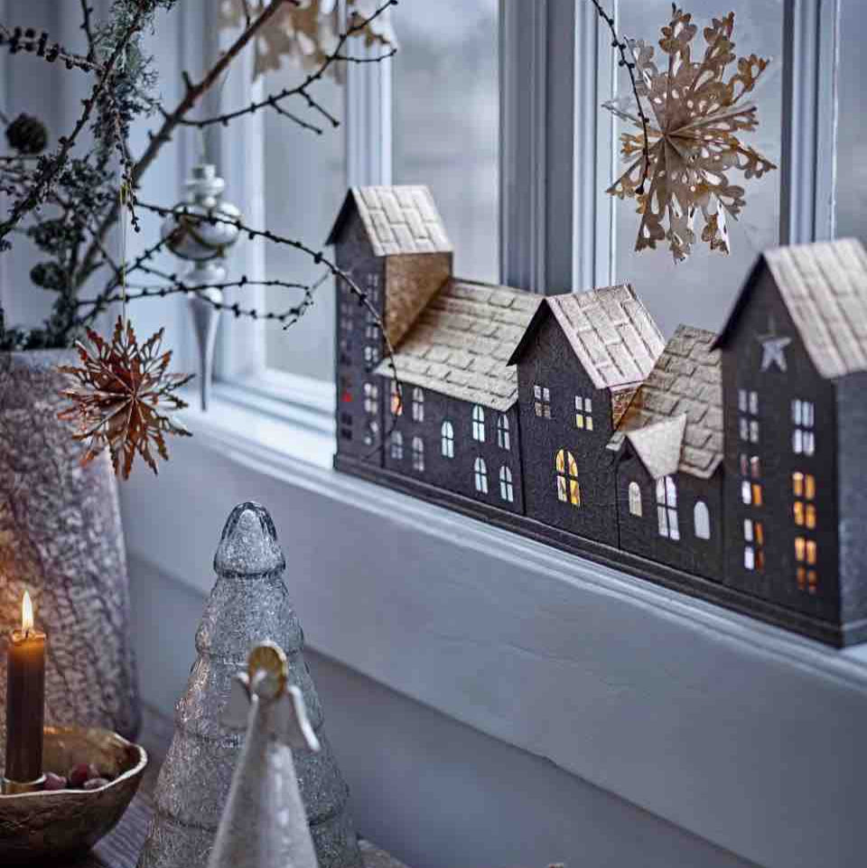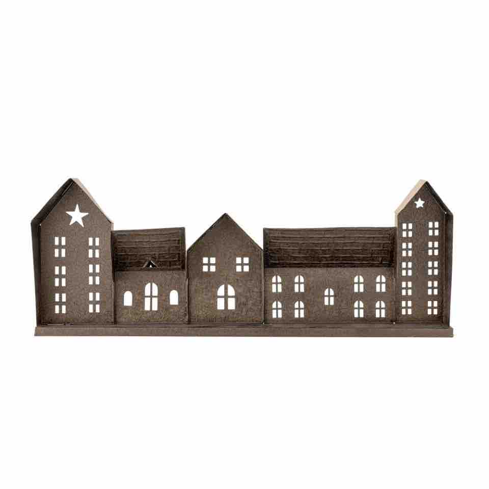 Le Photophore de Noël est une décoration atmosphérique en métal avec une finition dorée magnifique. Le design, qui représente une rangée de petites maisons avec des fenêtres sculptées et des détails fins, s'illumine et crée une ambiance cosy lorsqu'une lumière LED est placée derrière. Idéal pour décorer une étagère ou un rebord de fenêtre et ajouter une expression festive et chaleureuse.