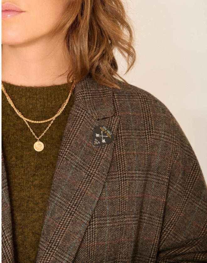 Ce manteau se distingue également par ses détails raffinés, comme un pin's décoratif sur le revers, qui ajoute une touche personnelle et originale à votre look. Il peut être facilement associé à divers styles, que ce soit pour un look décontracté ou plus habillé.