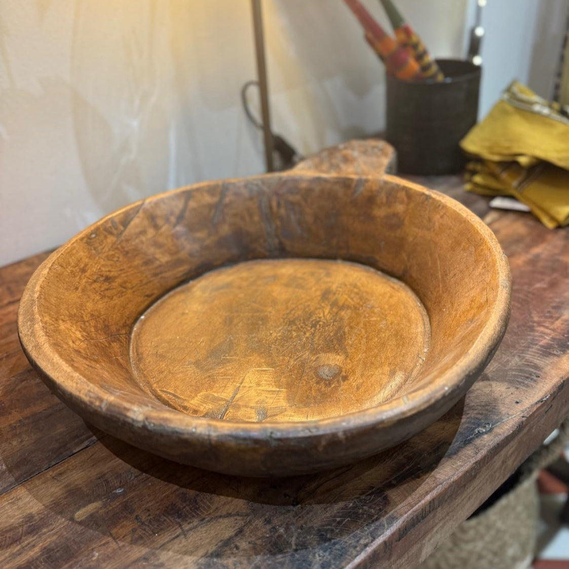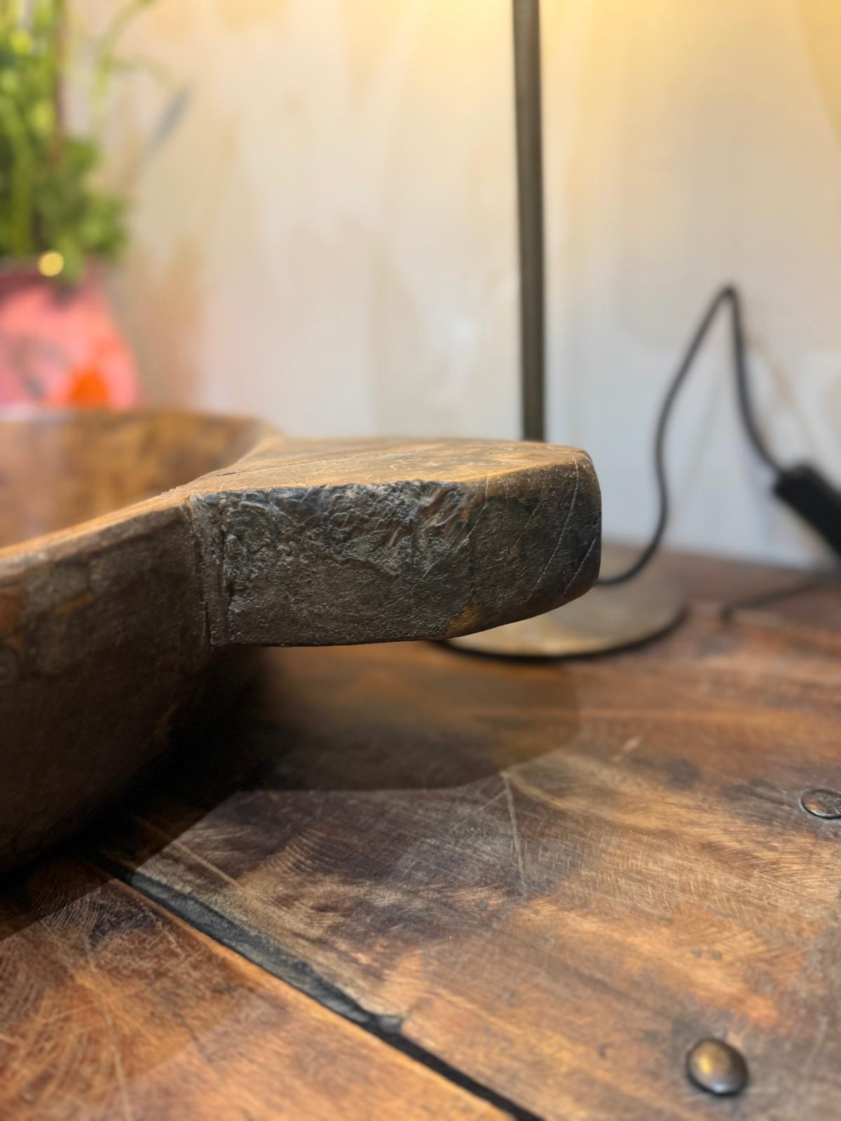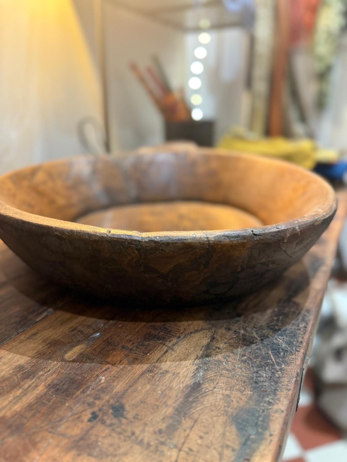 Grand plat creux en bois ancien indien dont l'usage était de préparer la pâte à chapati (pain traditionnel indien). Pièce unique à détourner en plat à fruits, plat de décoration ou plat de service !
