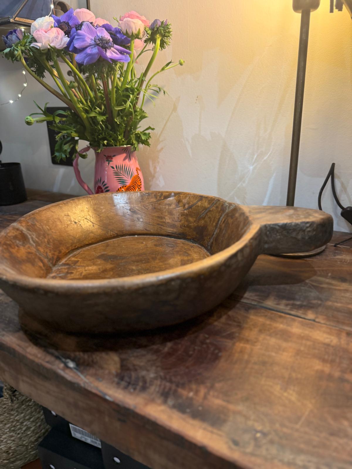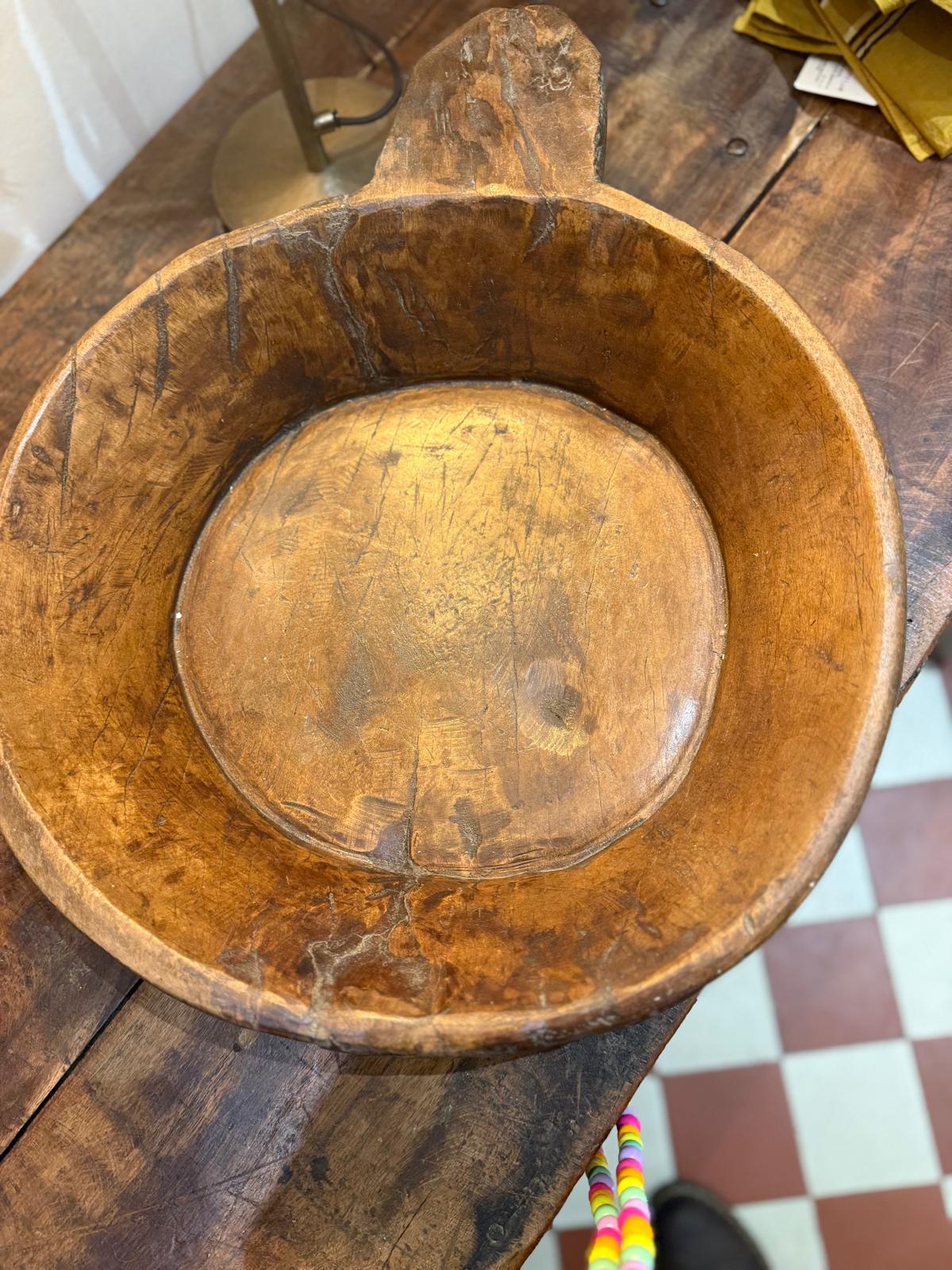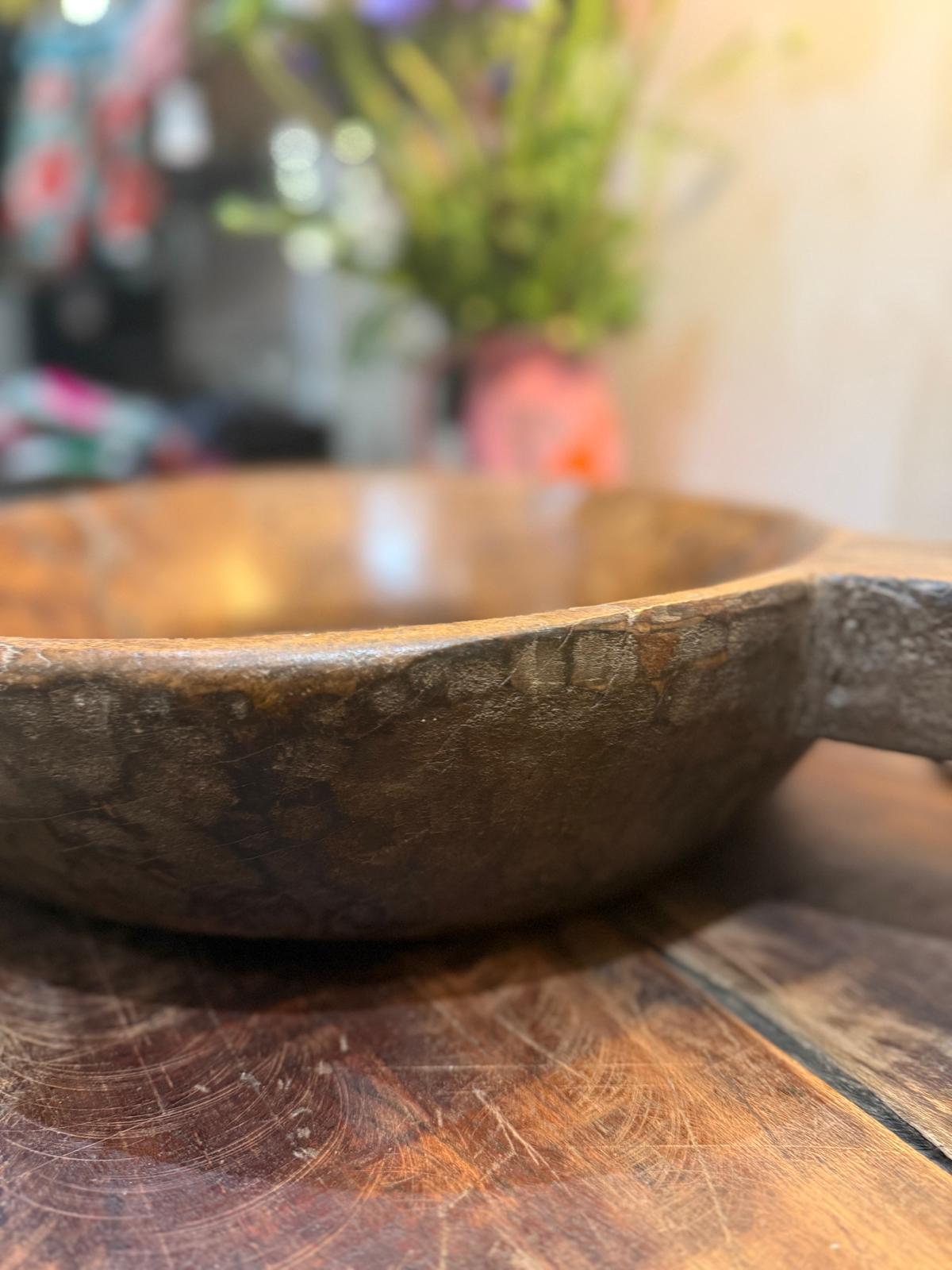 Grand plat creux en bois ancien indien dont l'usage était de préparer la pâte à chapati (pain traditionnel indien). Pièce unique à détourner en plat à fruits, plat de décoration ou plat de service !