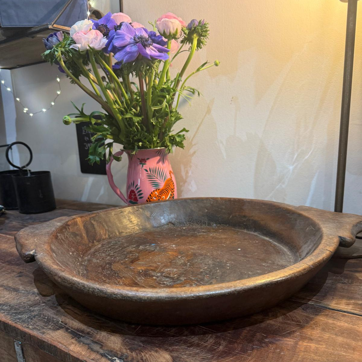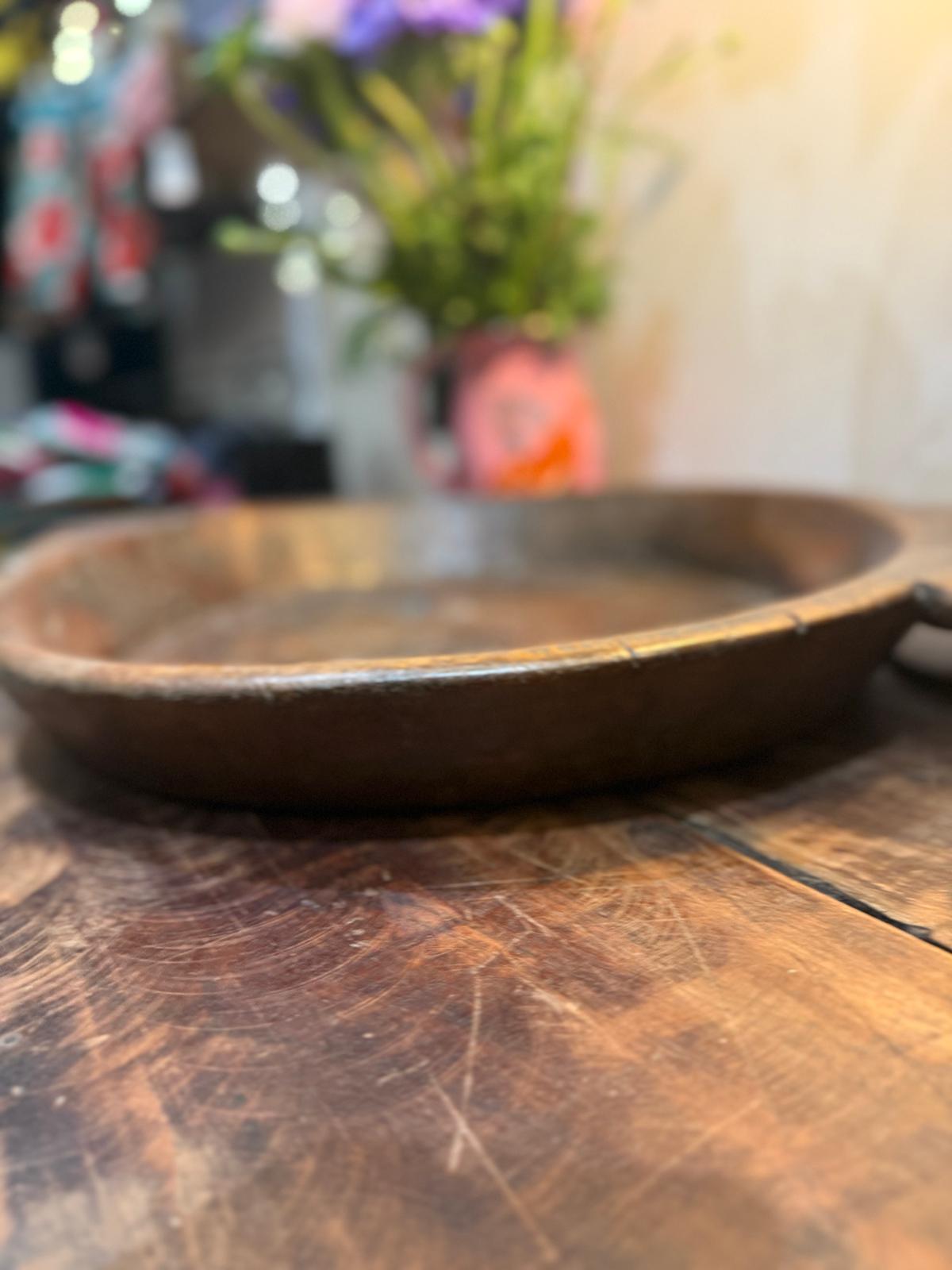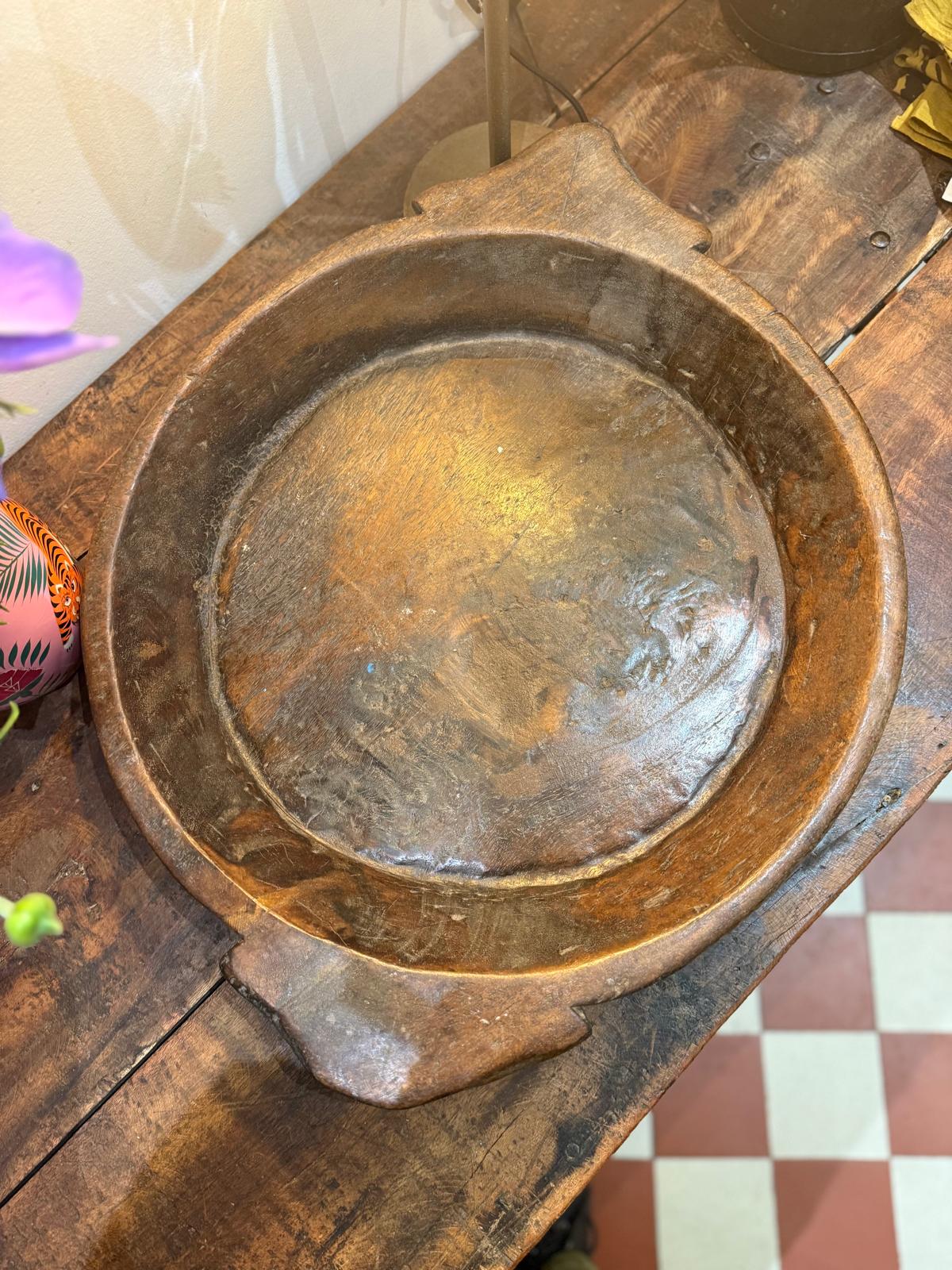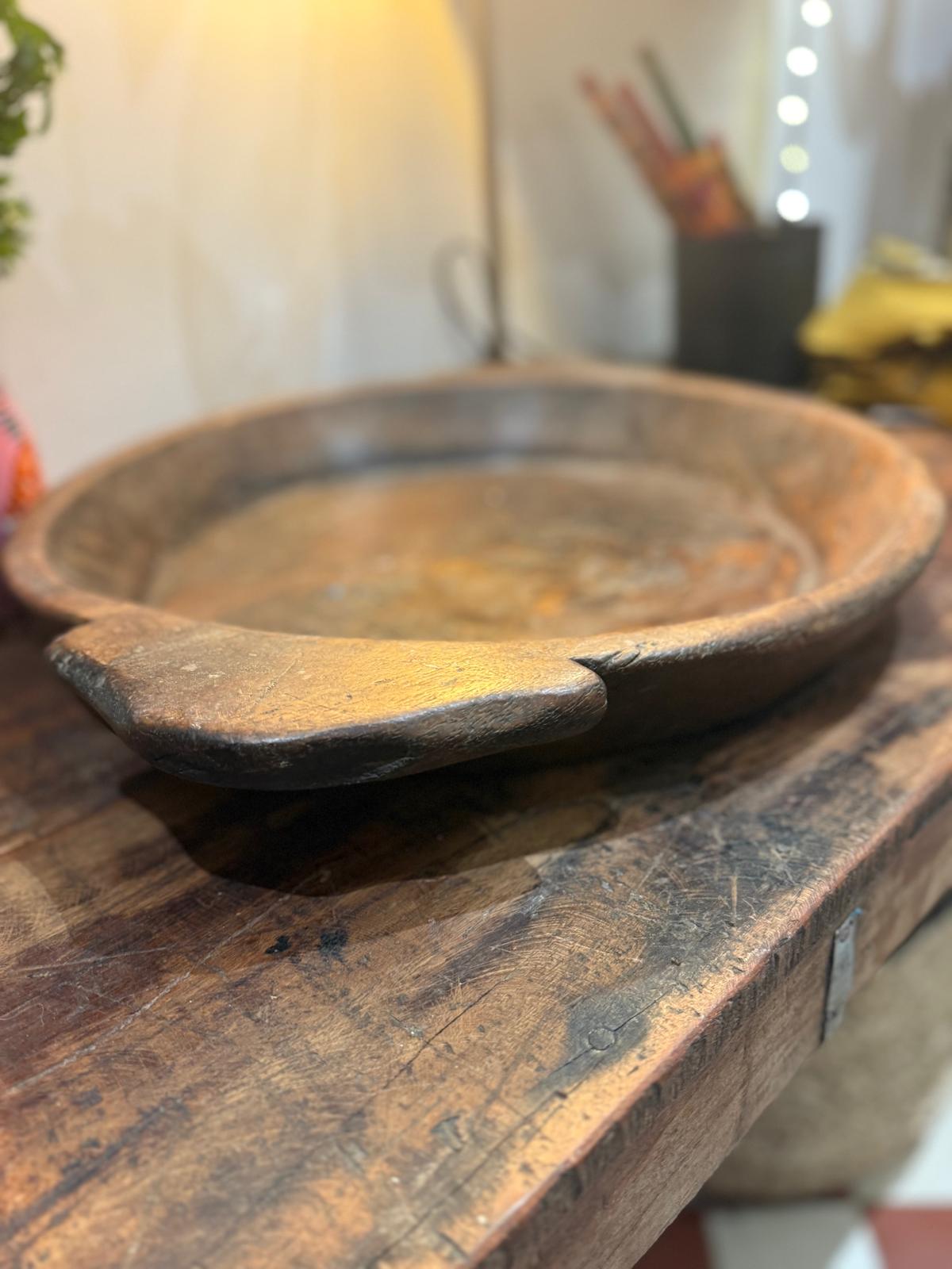 Grand plat creux en bois ancien indien dont l'usage était de préparer la pâte à chapati (pain traditionnel indien). Pièce unique à détourner en plat à fruits, plat de décoration ou plat de service!