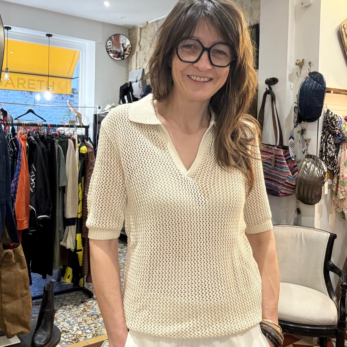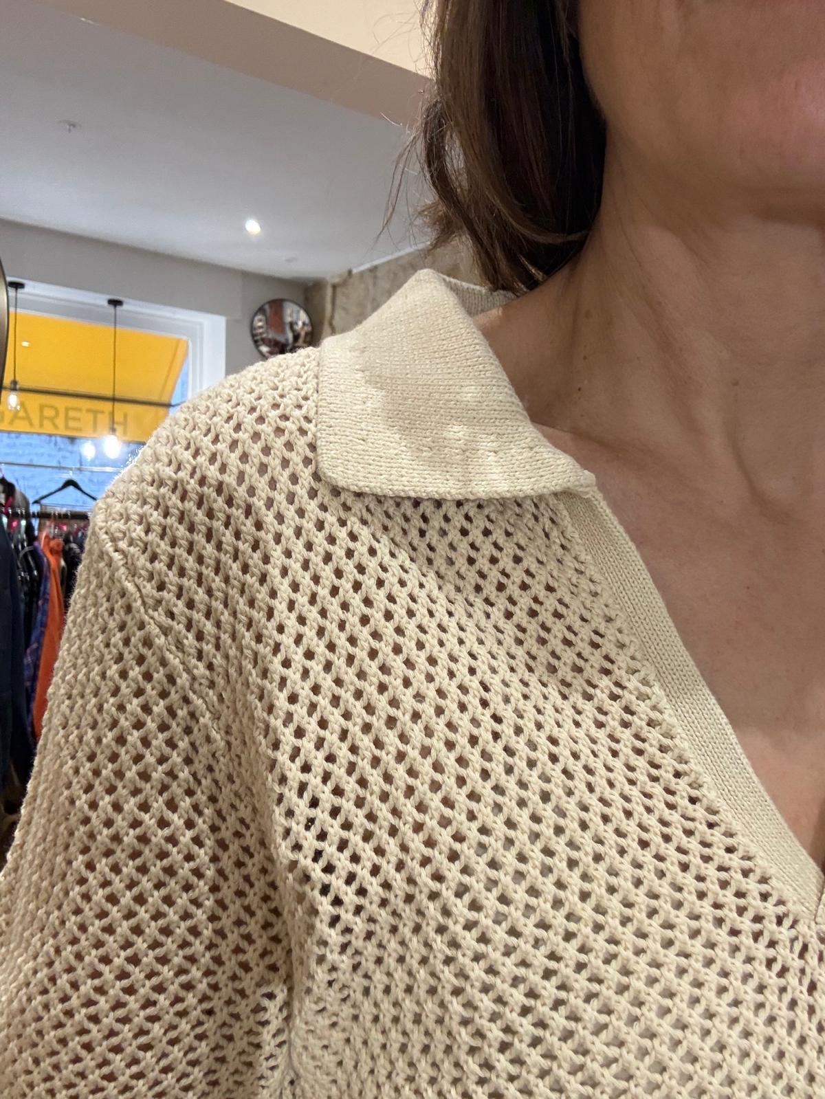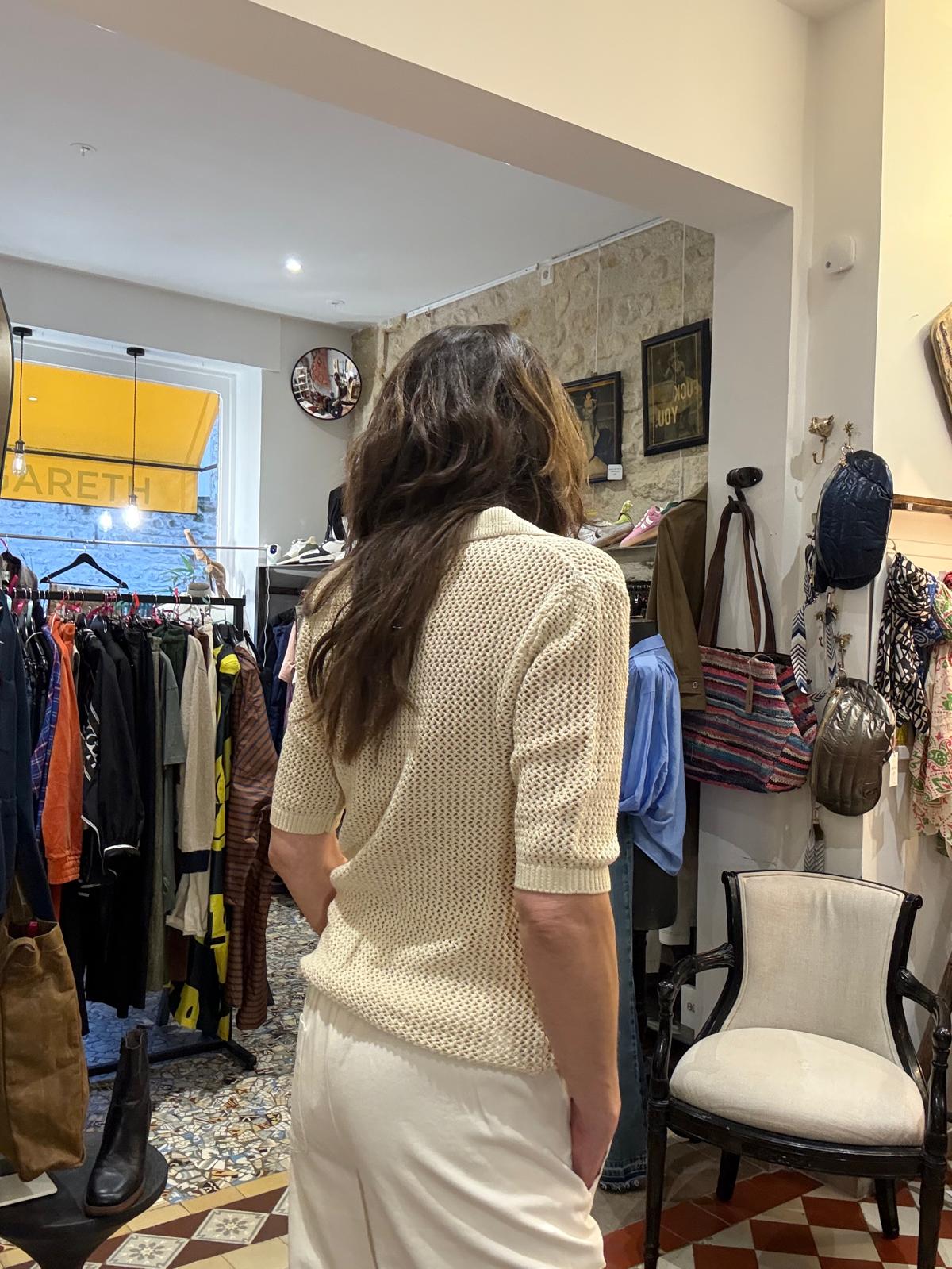 Un look très vintage des années 60 pour ce magnifique polo à maille ajourée. Prenez 1 taille en-dessous de votre taille habituelle. Je porte du 36 pour mon 38 habituel et mesure 1m78. 100% coton