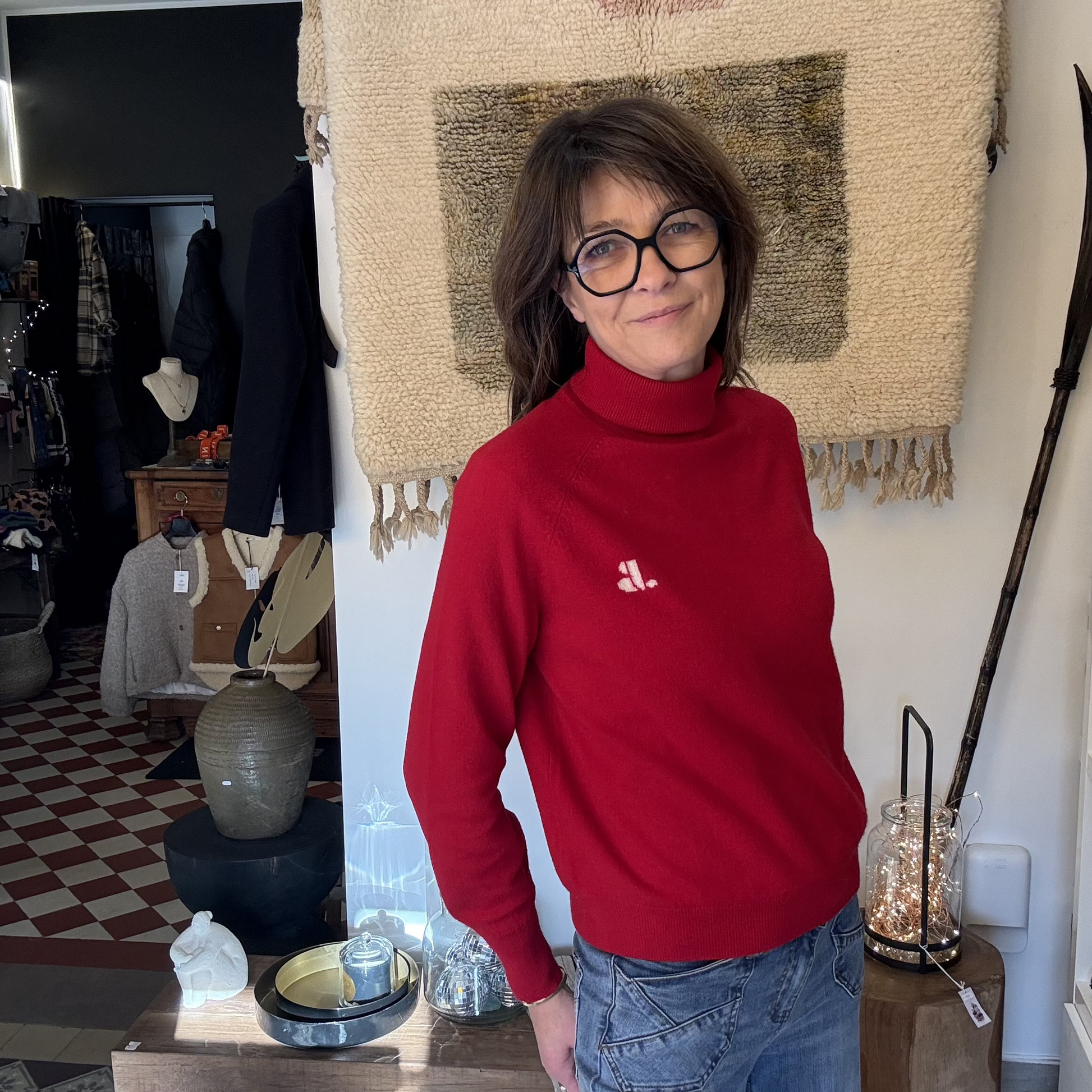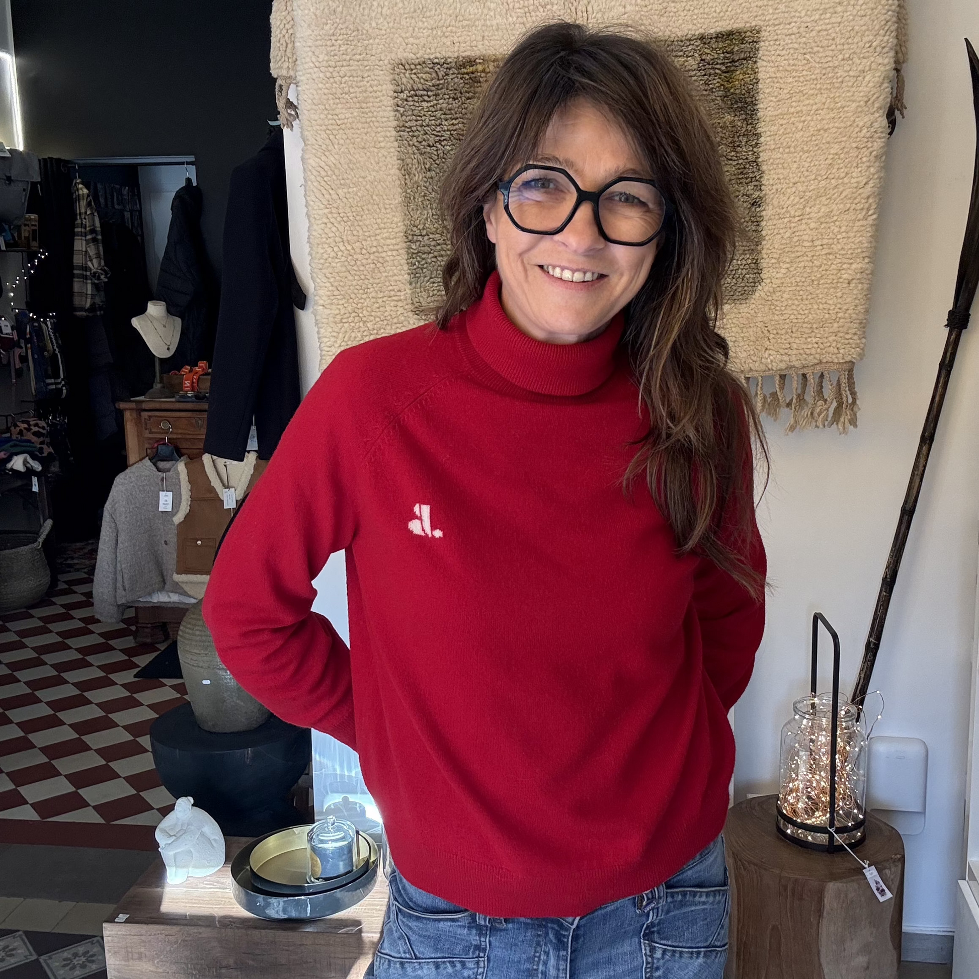 Pull à col roulé Lily de Jane Blue Paris. Logo JB contrasté. Poignets et taille resserrés.