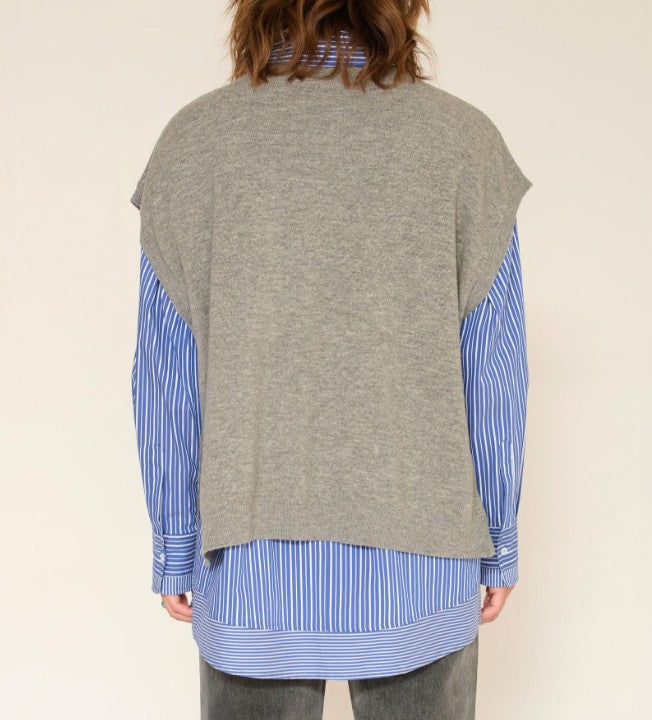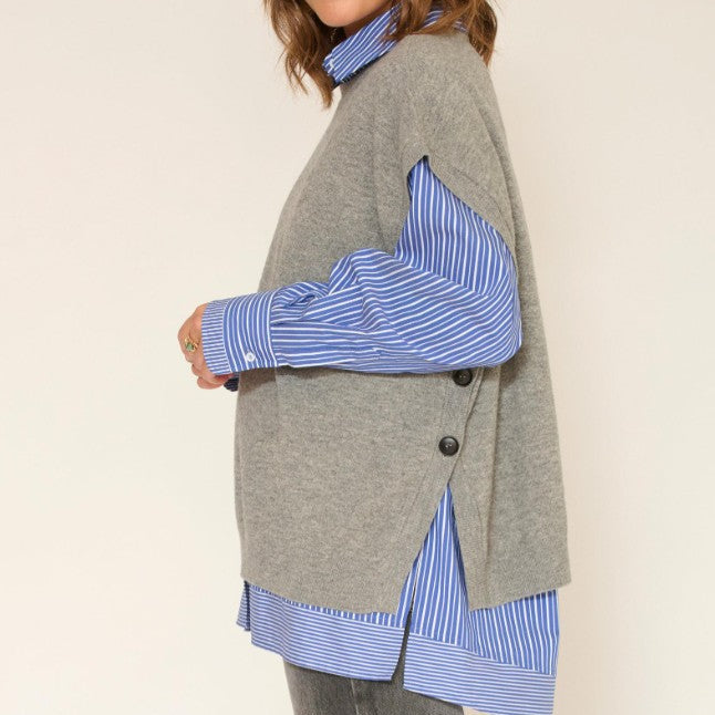 Les détails du pull, tels que les boutons sur les côtés, apportent une dimension supplémentaire à son design, offrant la possibilité d'ajuster le look selon vos préférences personnelles. Ce pull se porte idéalement par-dessus une chemise, comme illustré avec une chemise à rayures bleues, créant ainsi un contraste élégant et une superposition raffinée.