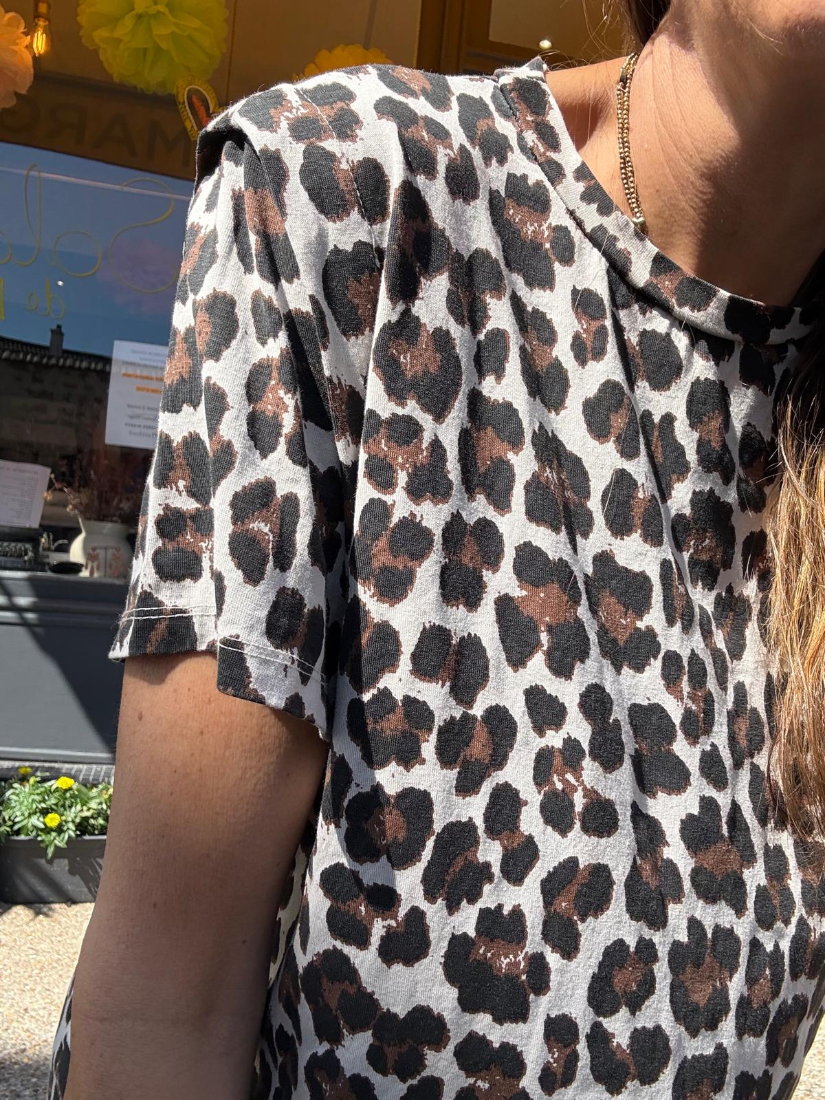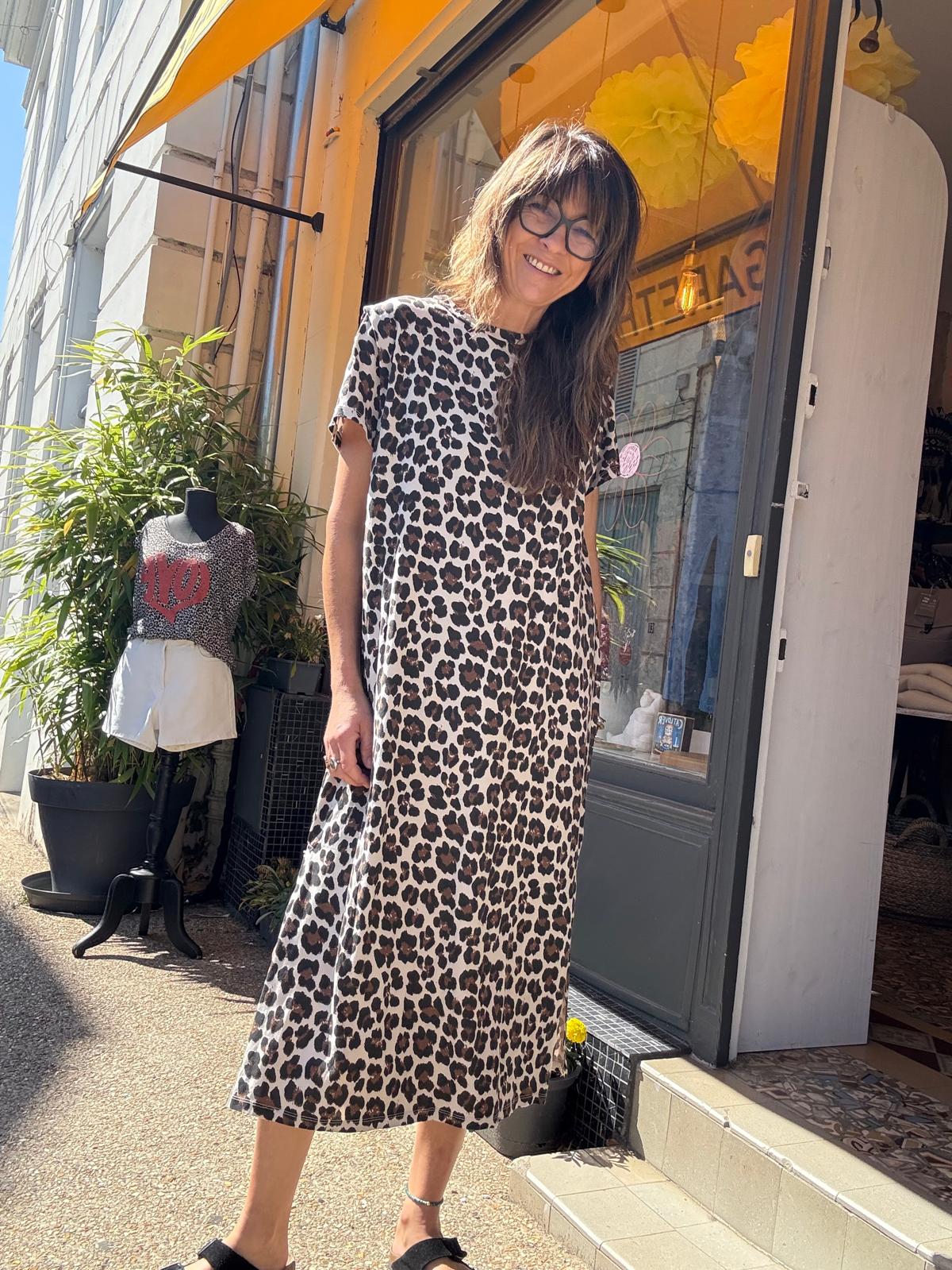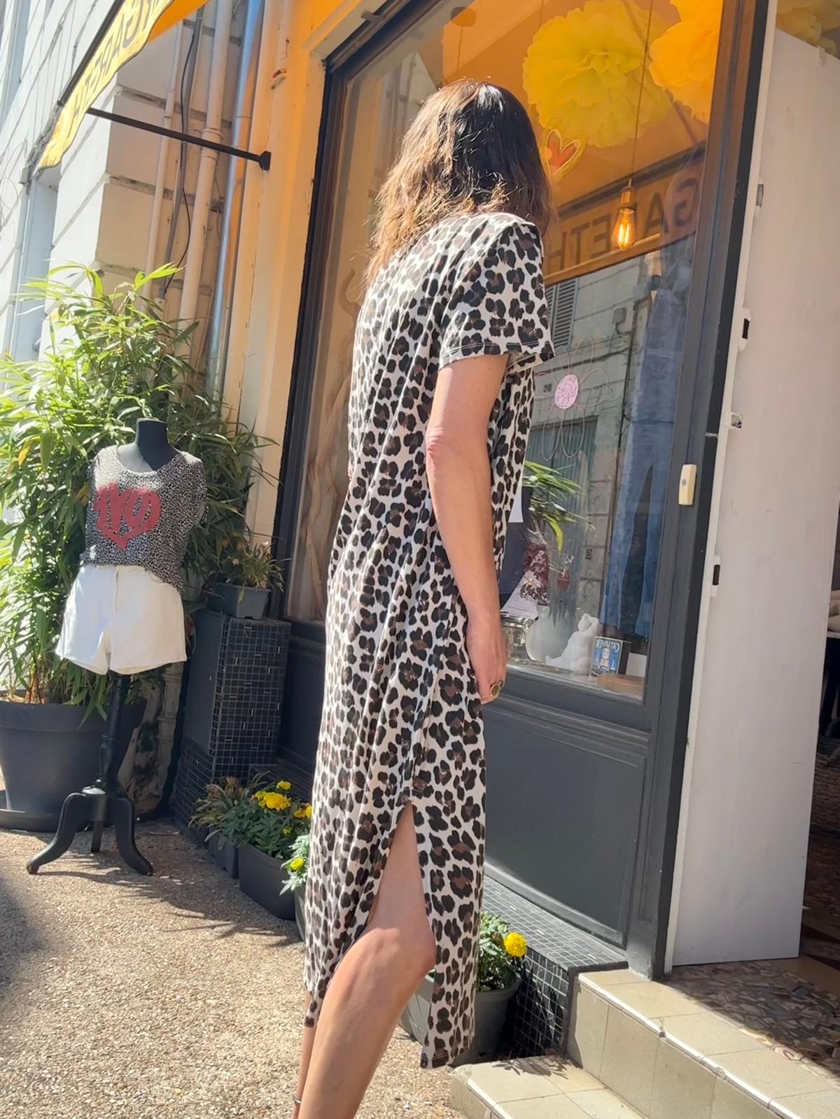 Robe T-shirt Gaby leopard, avec 2 fentes sur les côtés dt un joli détail d’emmanchures.