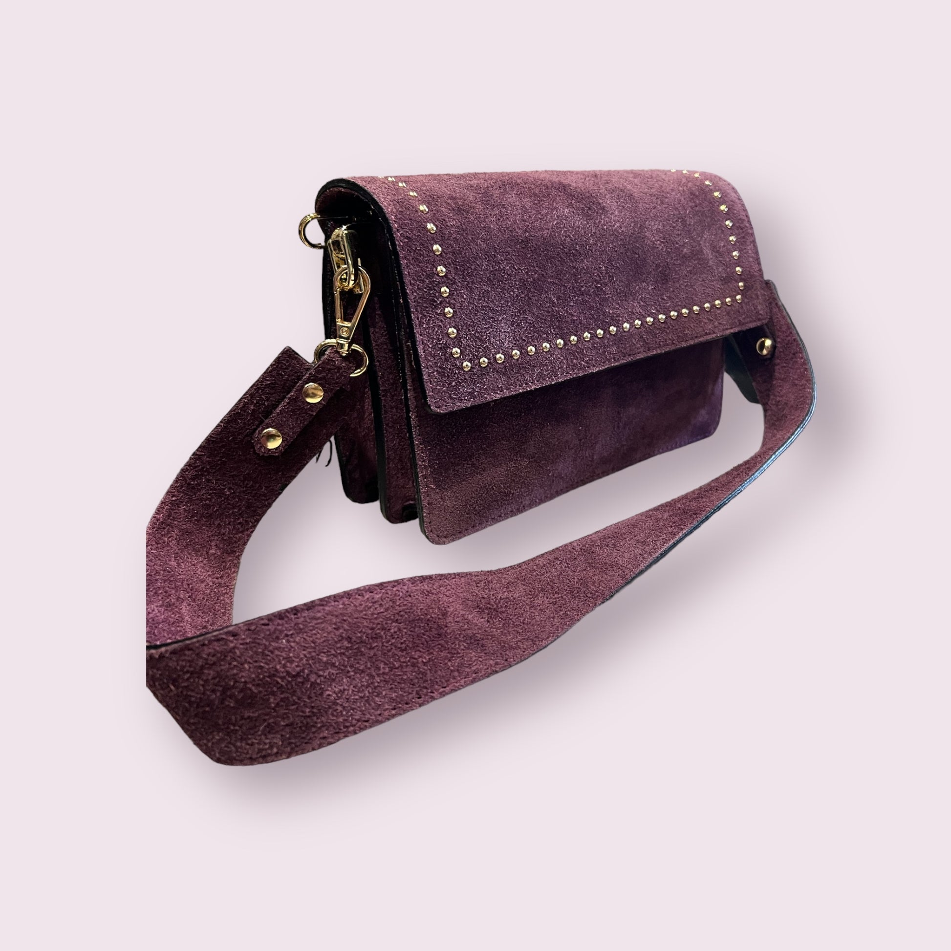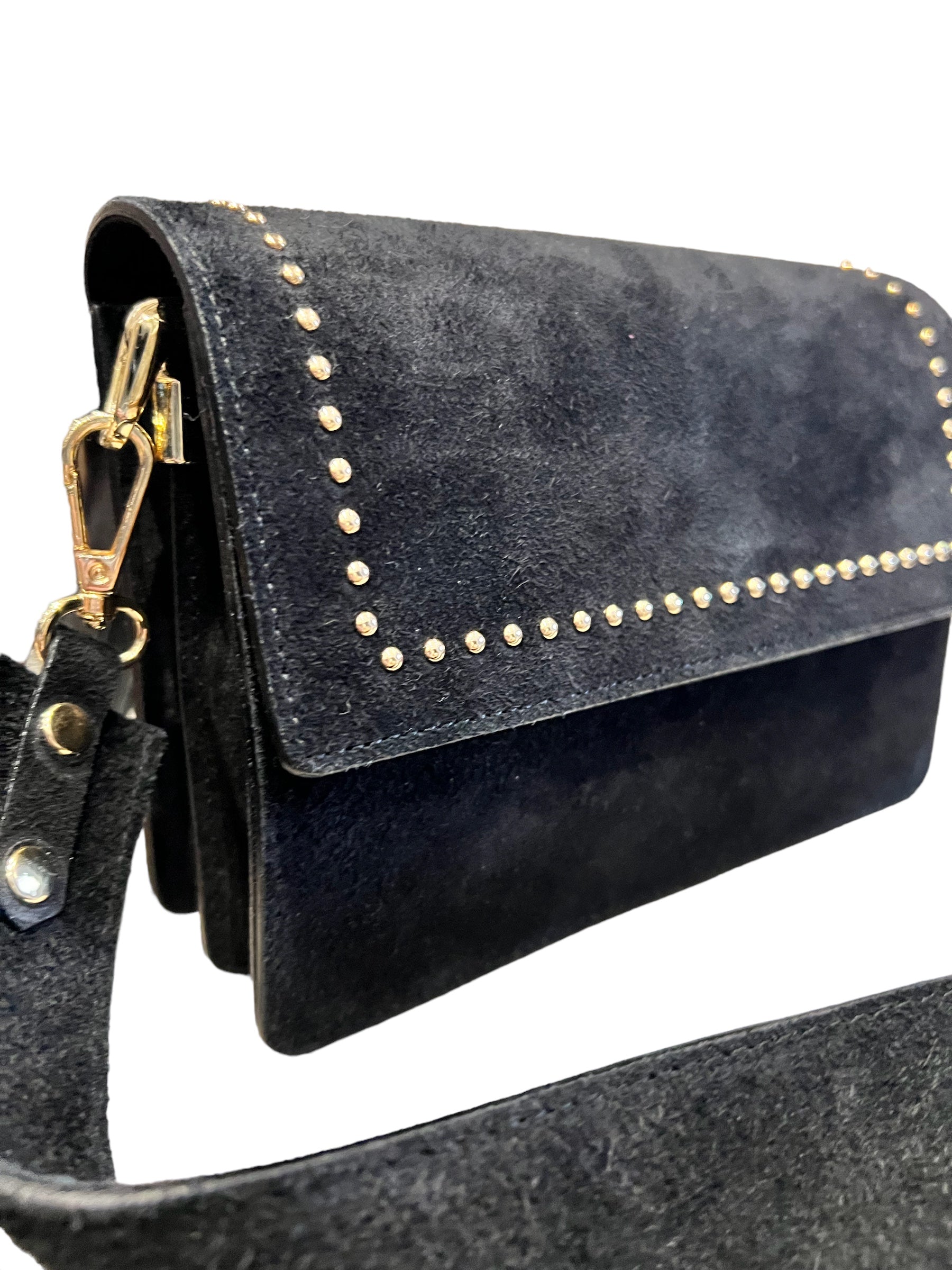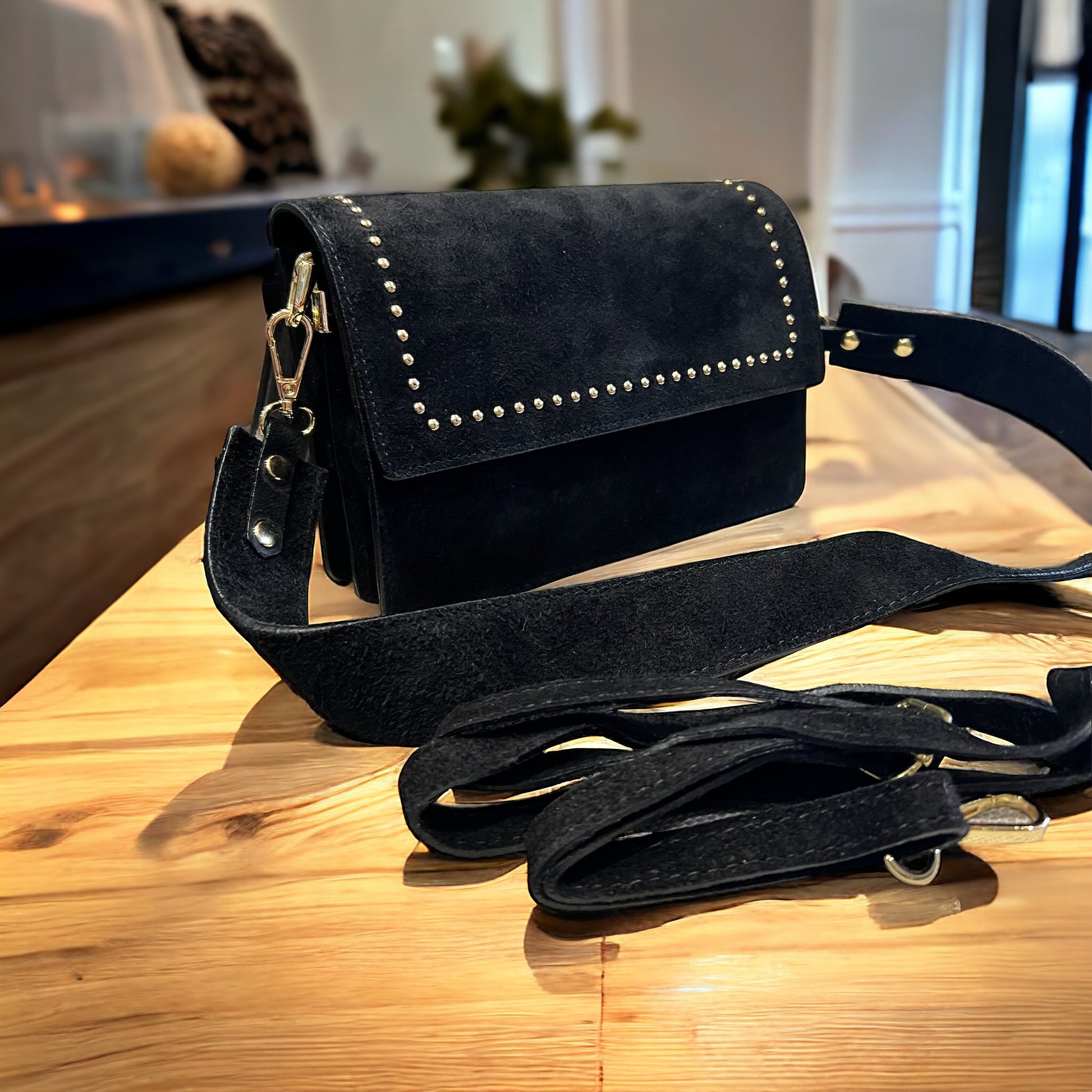 Sac à main en croûte de cuir avec 2 bandoulières : 1 bandoulière large et courte pour un porté à la main ou épaule et une seconde bandoulière longue pour un porter en bandoulière. 2 bandoulières amovibles. Dimensions extérieures : 21cm de long X 15cm de haut X 7 cm de profondeur. Petits clous dorés sur le rabat principal.