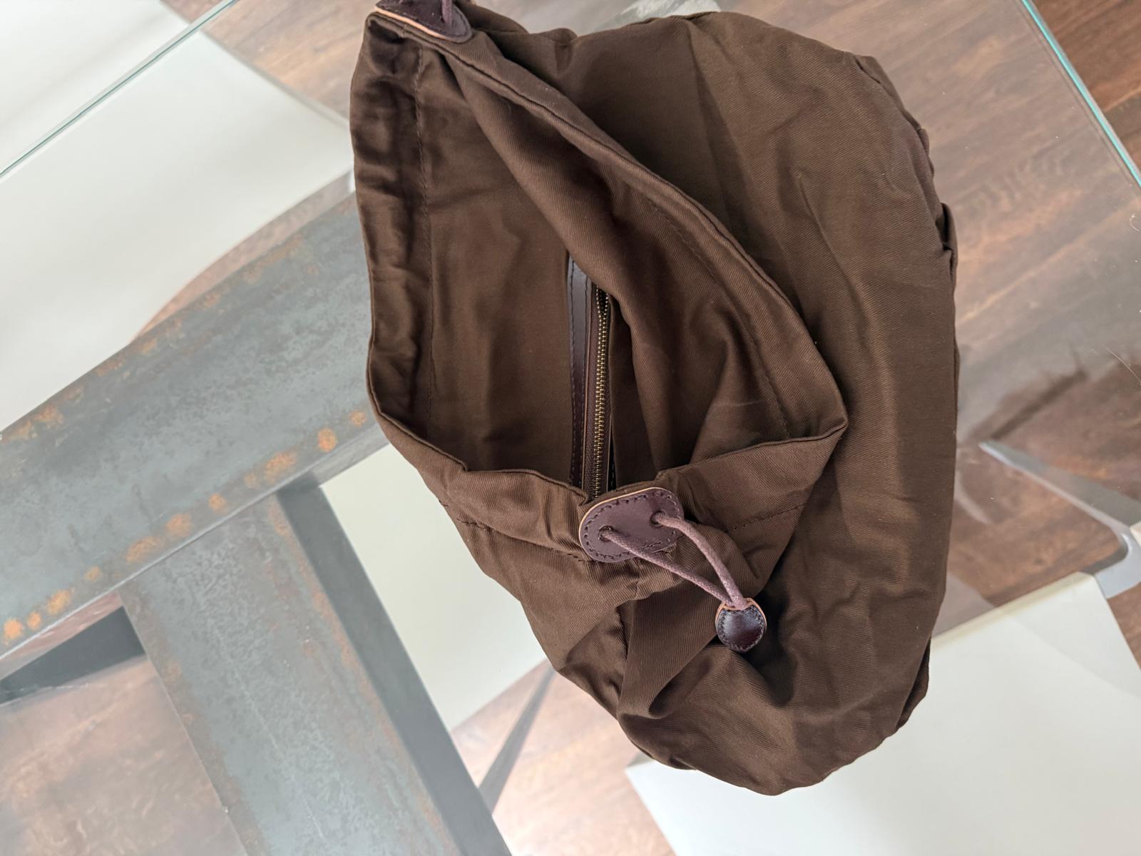 Côté pratique : un dust bag intérieur amovible en coton avec 1 poche zippée, une poche ouverte, resserrage par lien finis par une patte cuir.