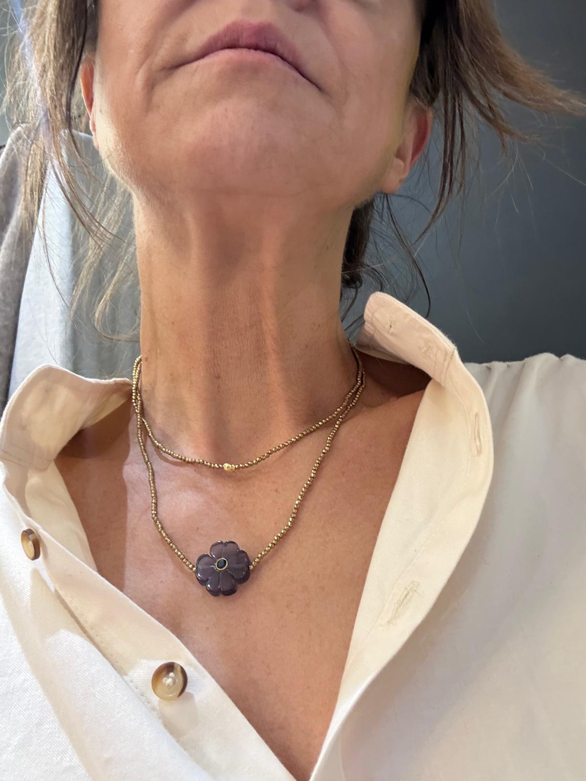 Il est composé de petites perles en hématite, pierre semi-précieuse aux reflets métalliques, et orné d’une fleur en pierre semi-précieuse.