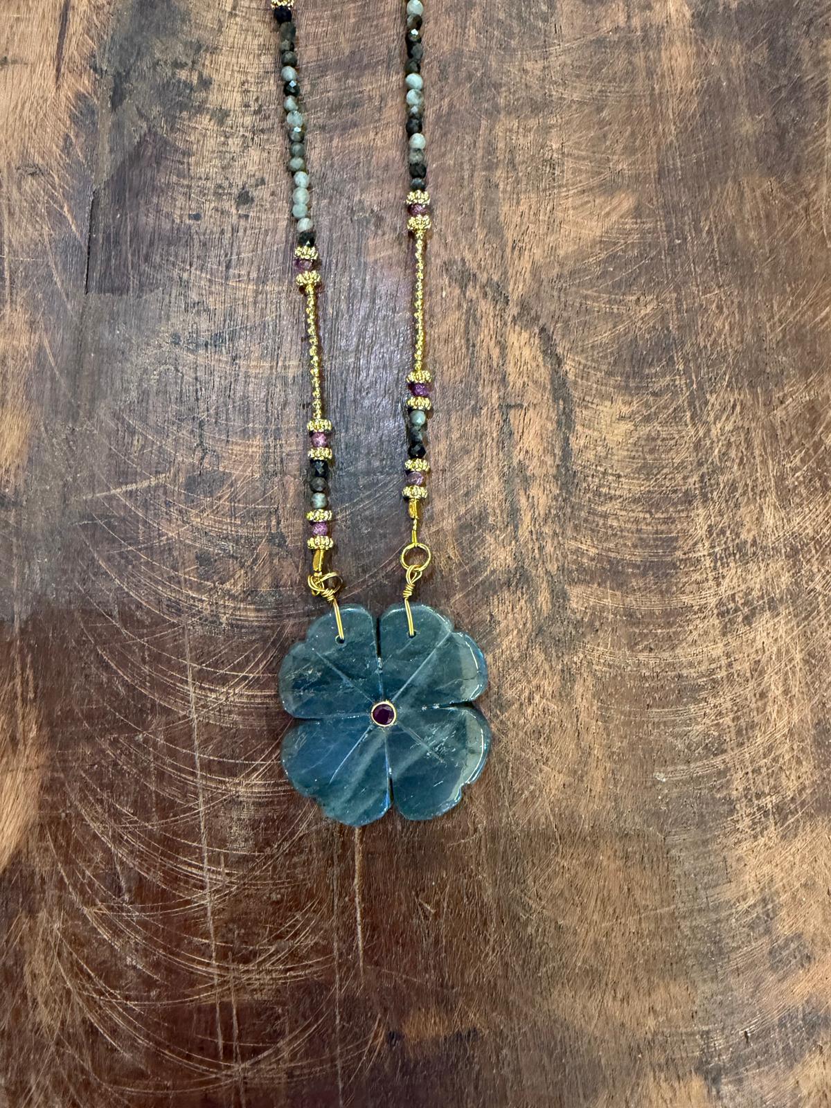 Sautoir Flower XL labradorite, onyx et rubis indien