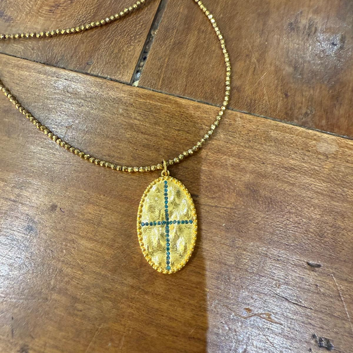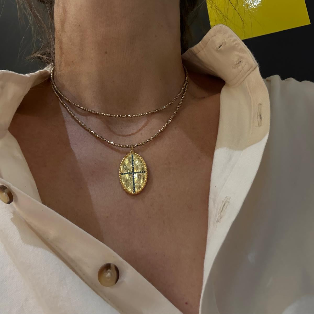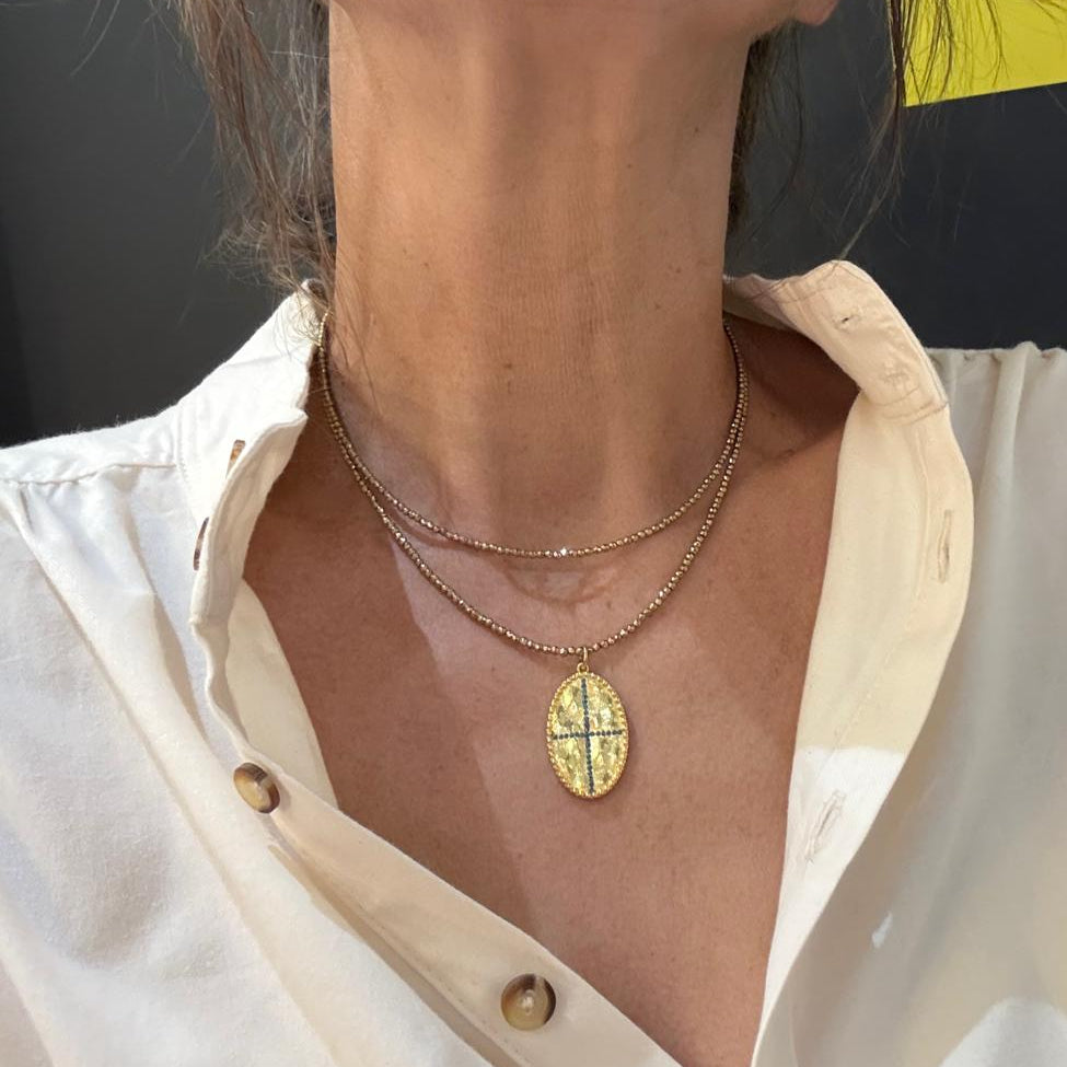 Sautoir réalisé avec des hématites et un pendentif en plaqué or 3 microns incrusté de pierres semi-précieuses. Il mesure environ 70cm, on le porte en sautoir ou en collier double tour.
