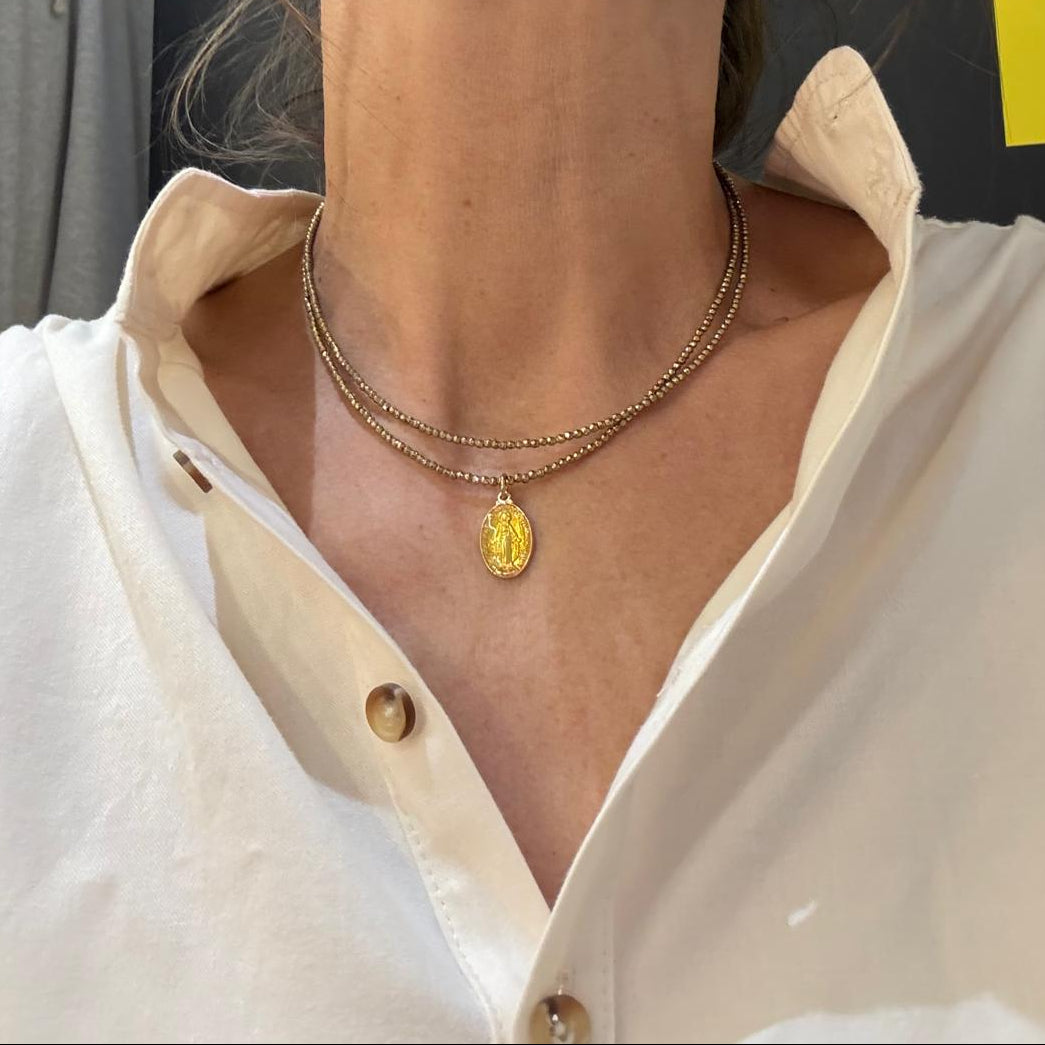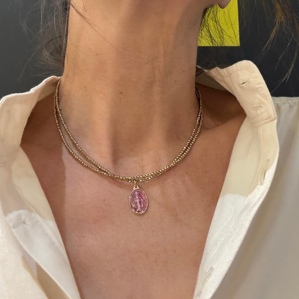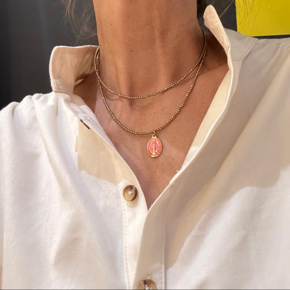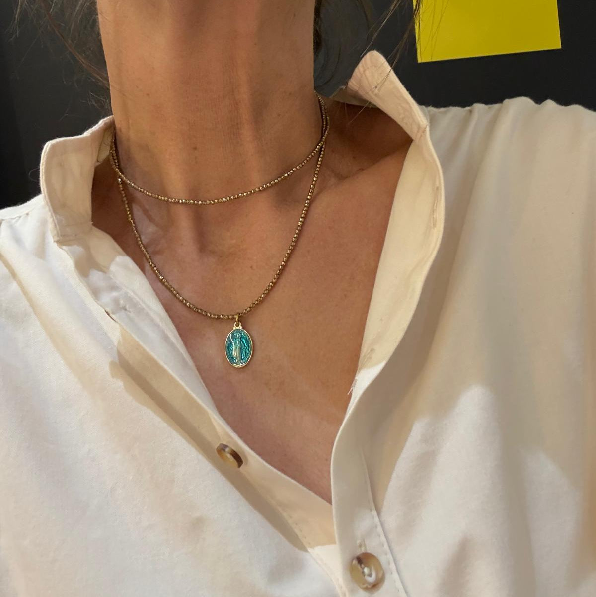 Sautoir ou collier double tour réalisé avec une chaîne en plaqué or 3 microns et une petite médaille de sainte Rita en émail sur la face avant et inscription gravée au dos.