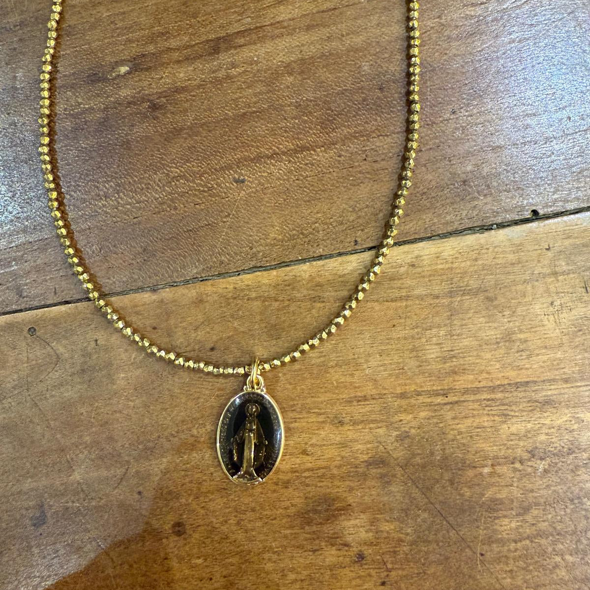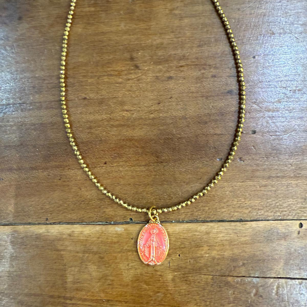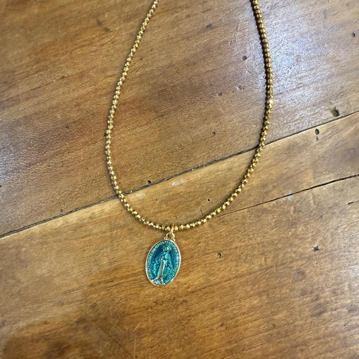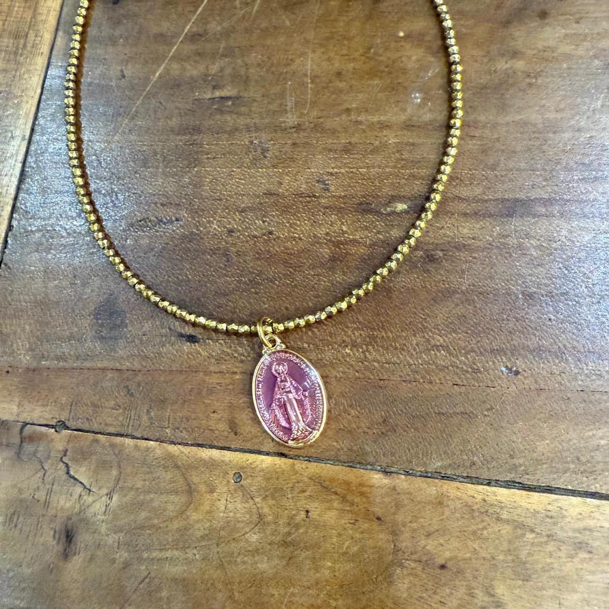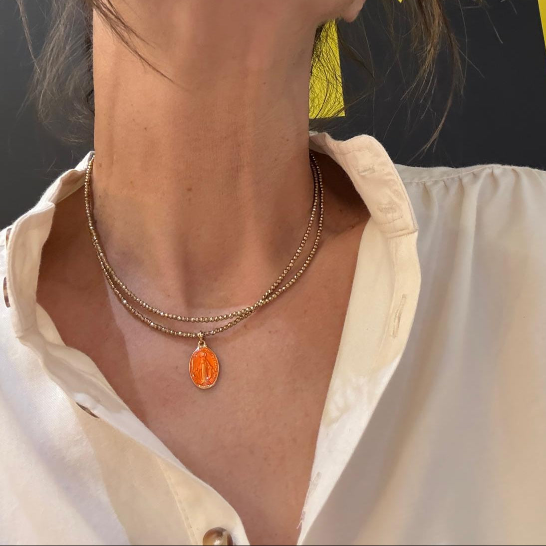 Sautoir ou collier double tour réalisé avec une chaîne en plaqué or 3 microns et une petite médaille de sainte Rita en émail sur la face avant et inscription gravée au dos.
