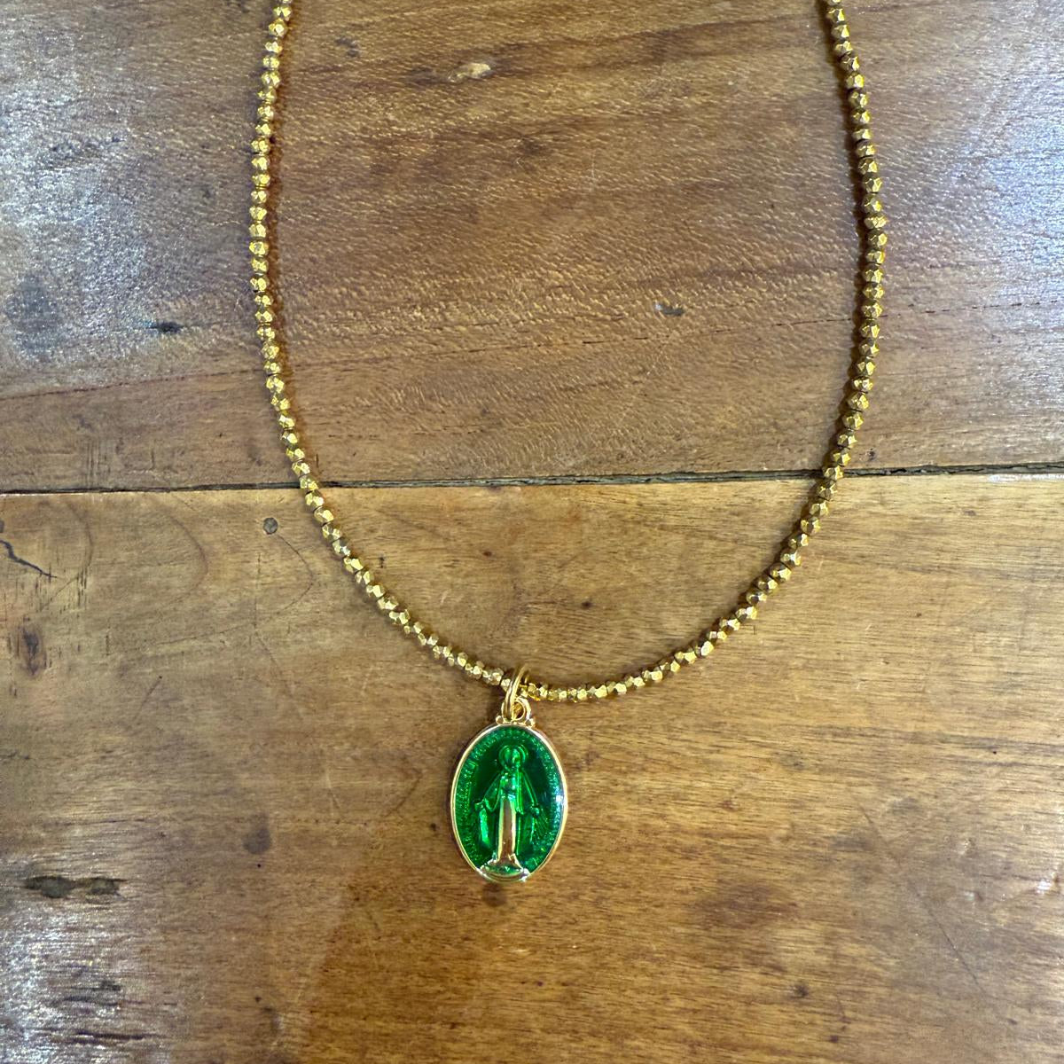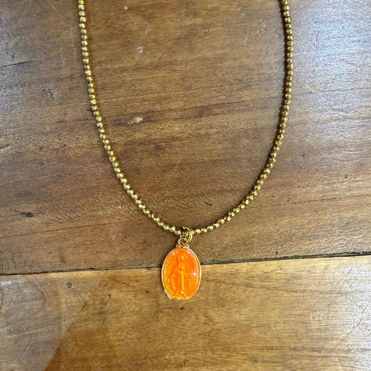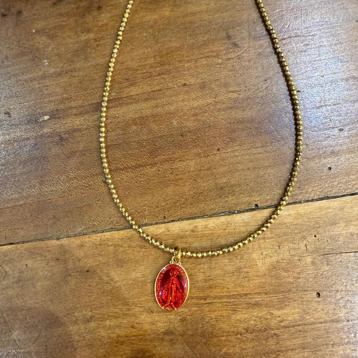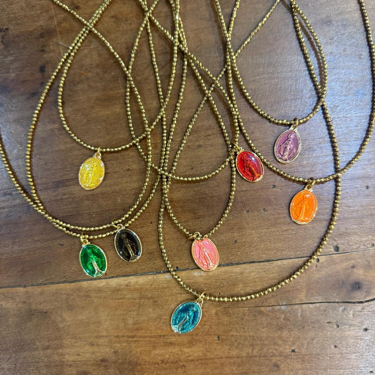 Sautoir ou collier double tour réalisé avec une chaîne en plaqué or 3 microns et une petite médaille de sainte Rita en émail sur la face avant et inscription gravée au dos.