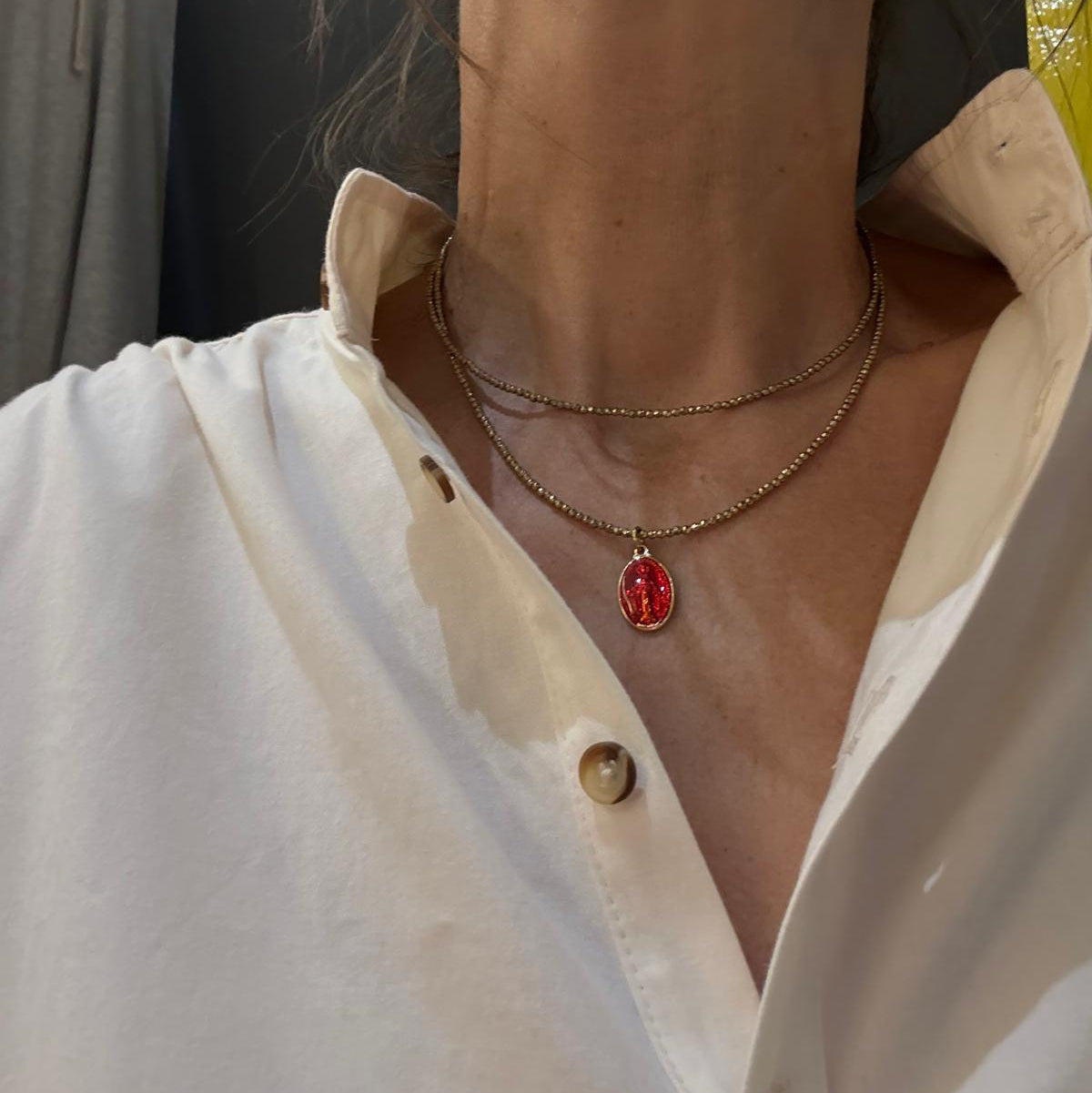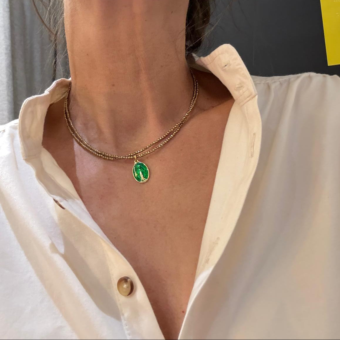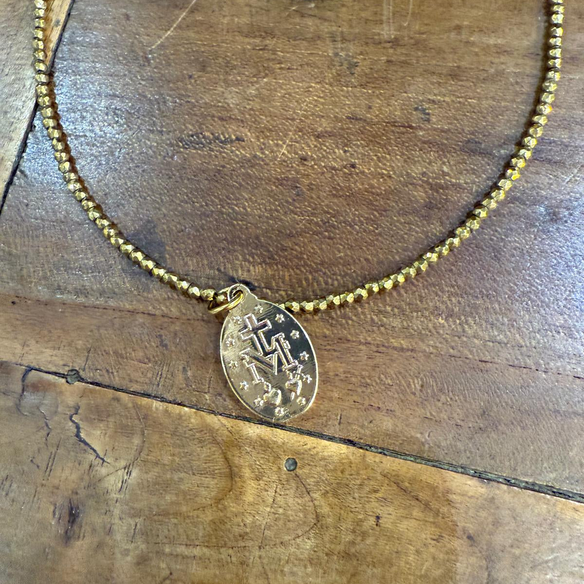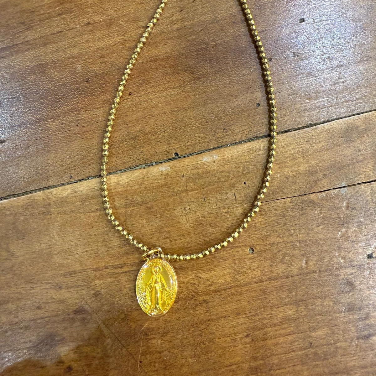 Sautoir ou collier double tour réalisé avec une chaîne en plaqué or 3 microns et une petite médaille de sainte Rita en émail sur la face avant et inscription gravée au dos.