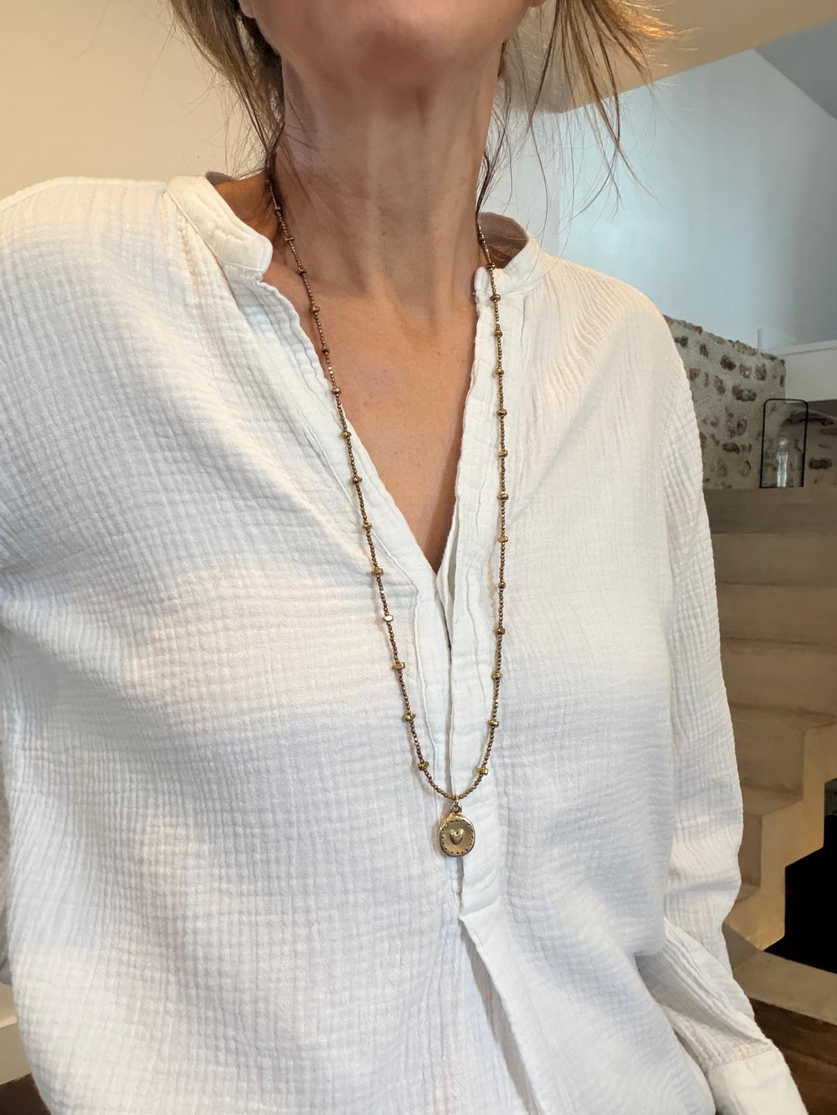 Sautoir talisman doré, peut se porter en sautoir ou en double tour.