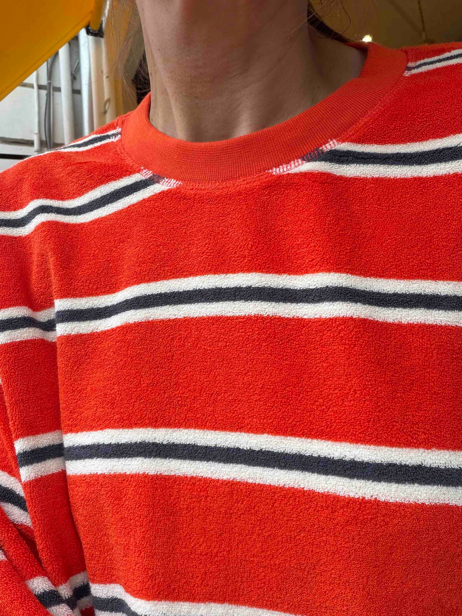Le nouveau sweat victoire à bords francs débarque en version éponge rayée dans un style très vintage ! On a carrément craqué pour son coloris tangerine !!!