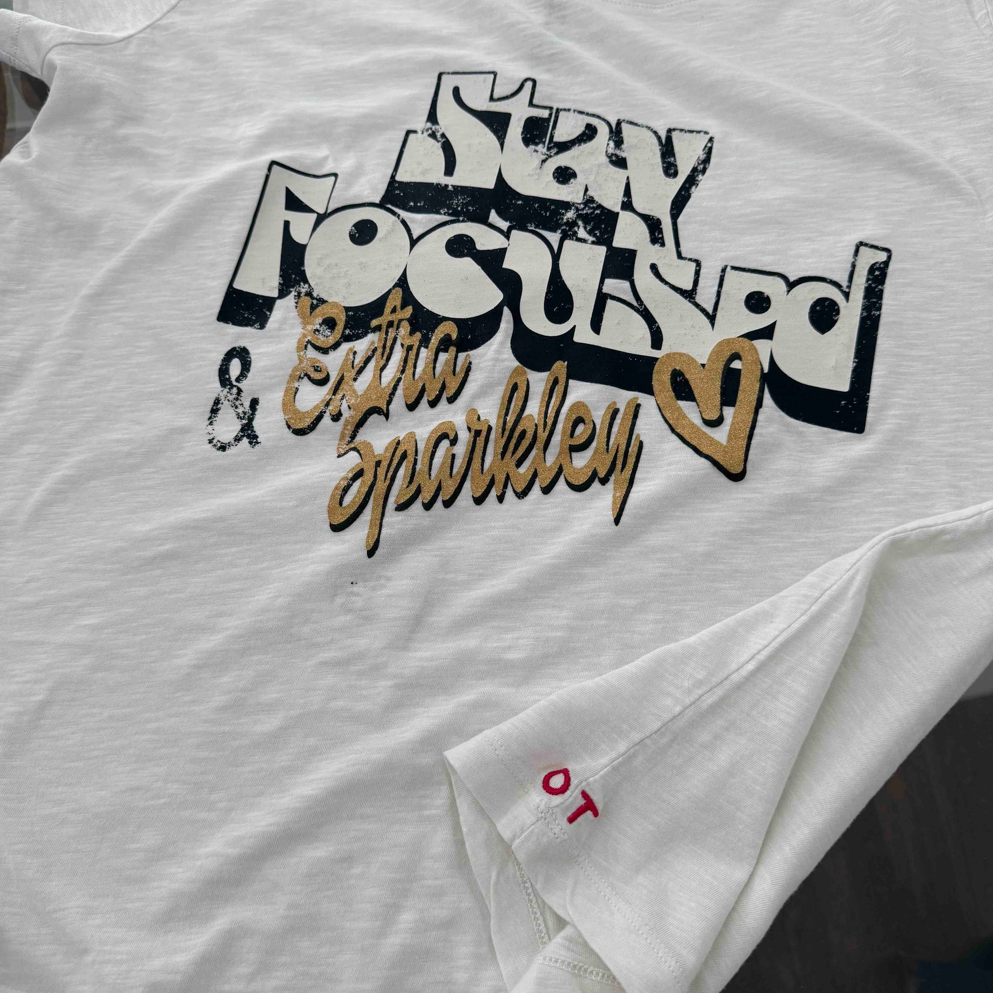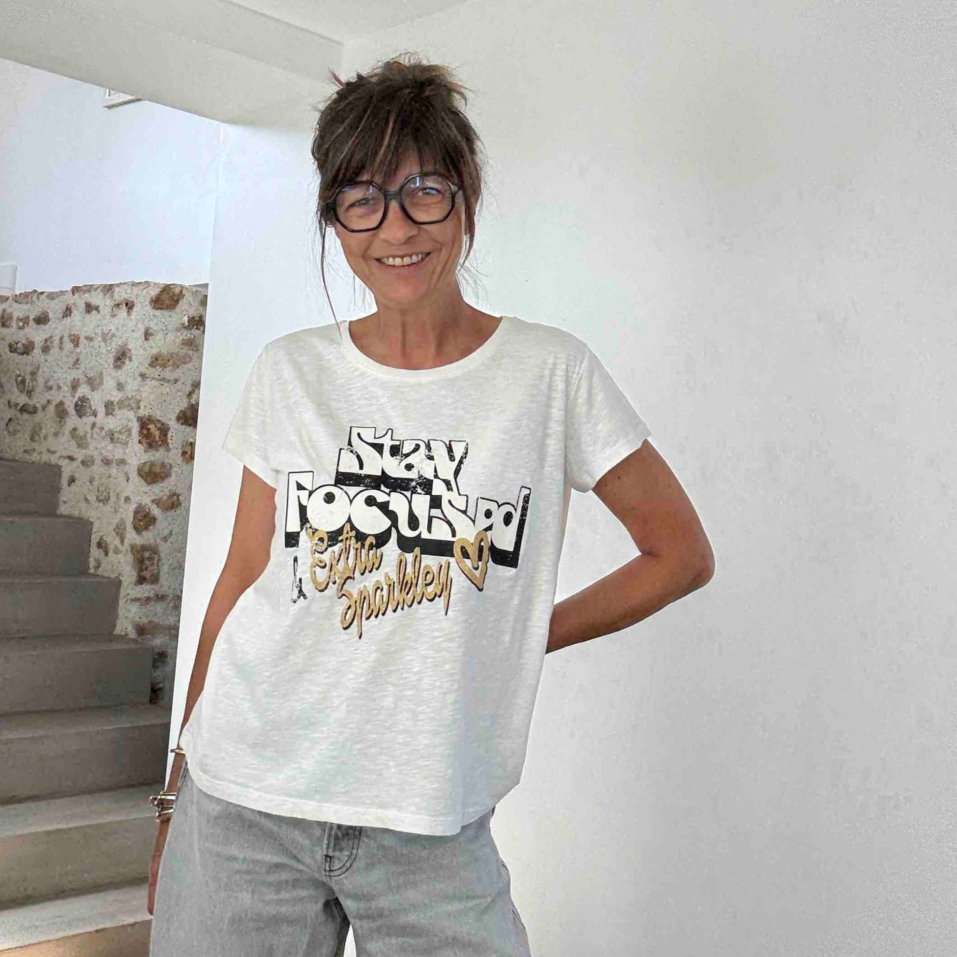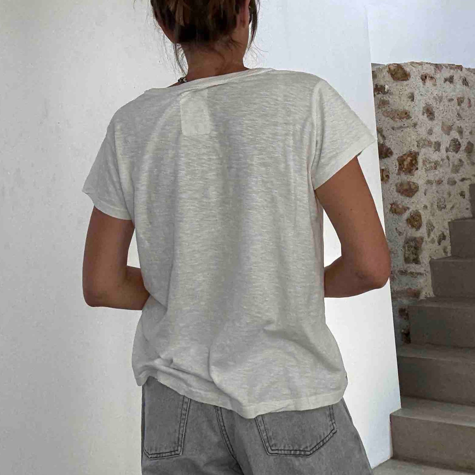 T-shirt manches courtes écru tout doux grâce à One Tee ! Col rond arrondi loose et print vintage. Coupe droite. Détail de broderie OT dans le bas.