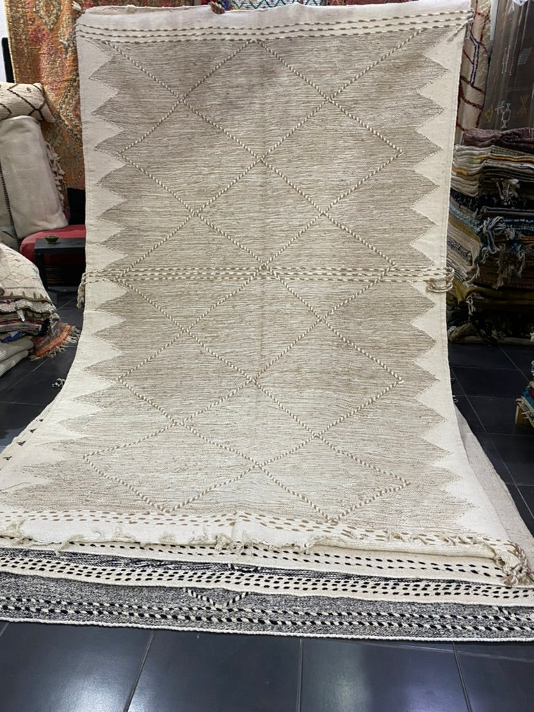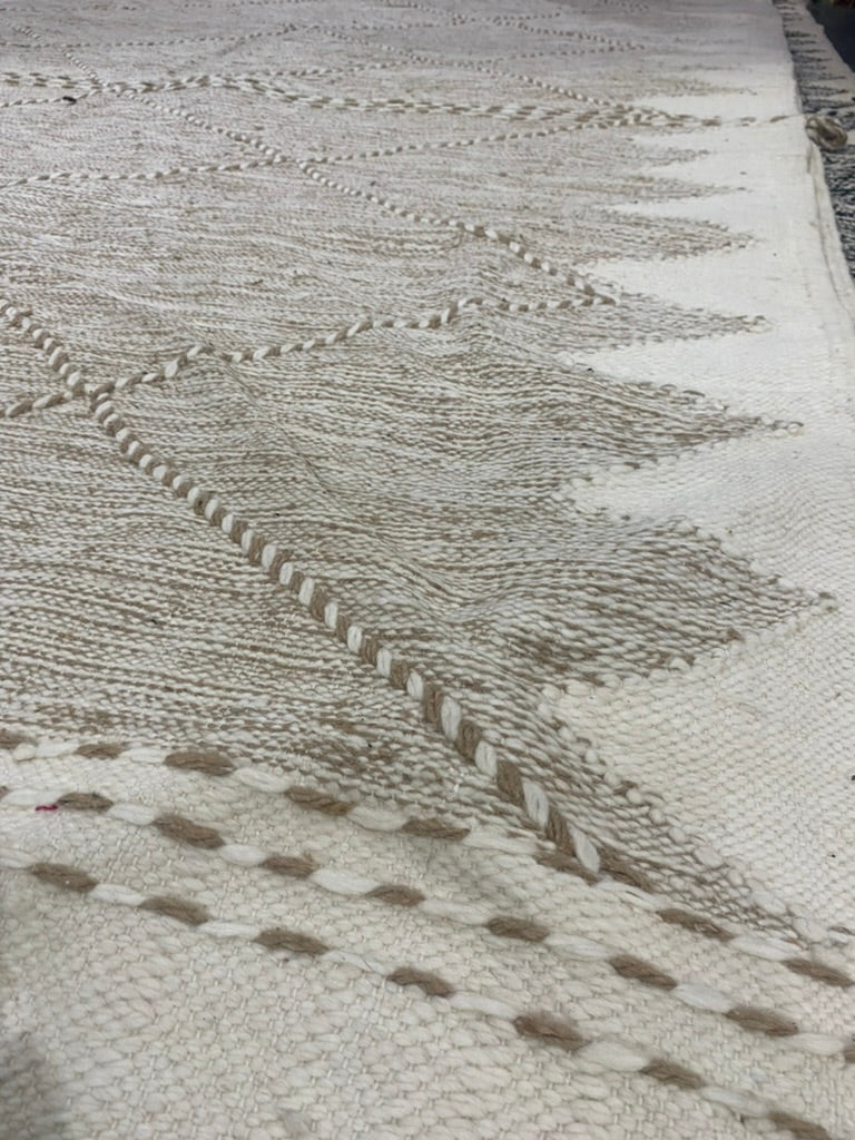 Kilim marocain avec un mélange de beiges doux. 100% laine et fabriqué à la main au Maroc. Sublime travail de tissage en relief !